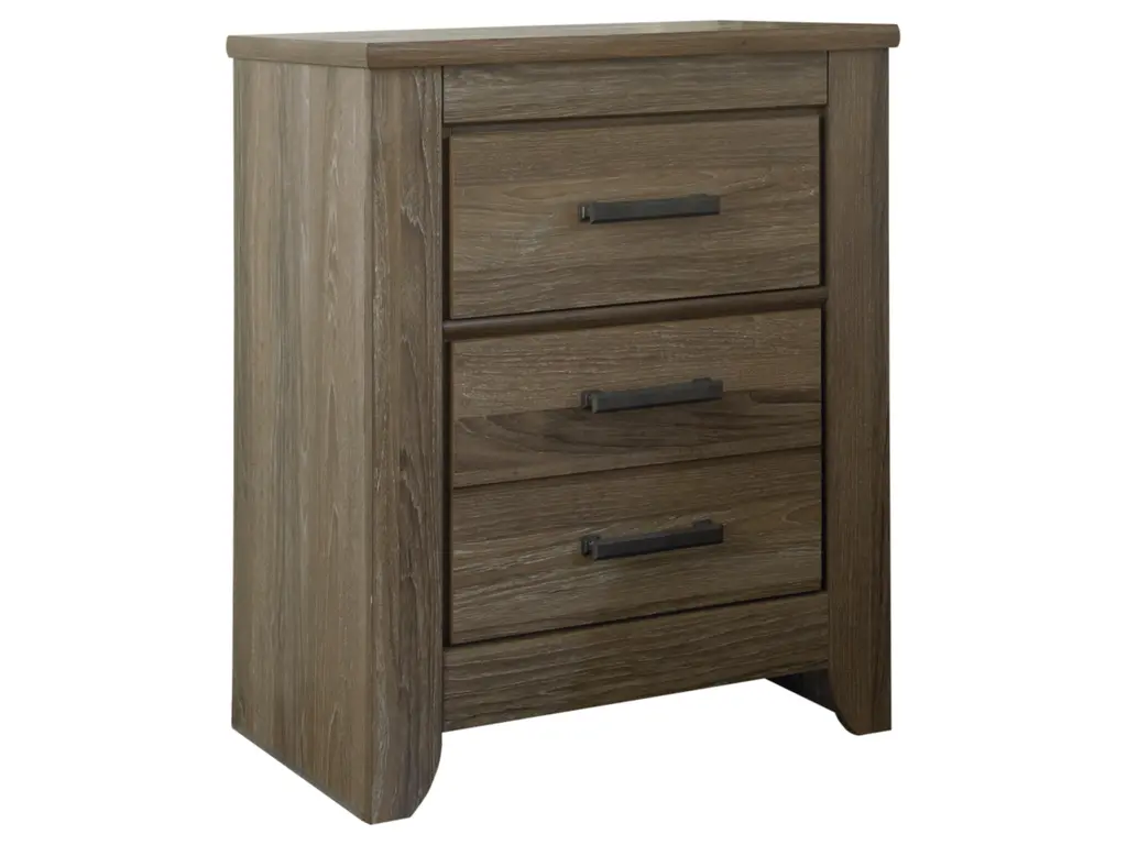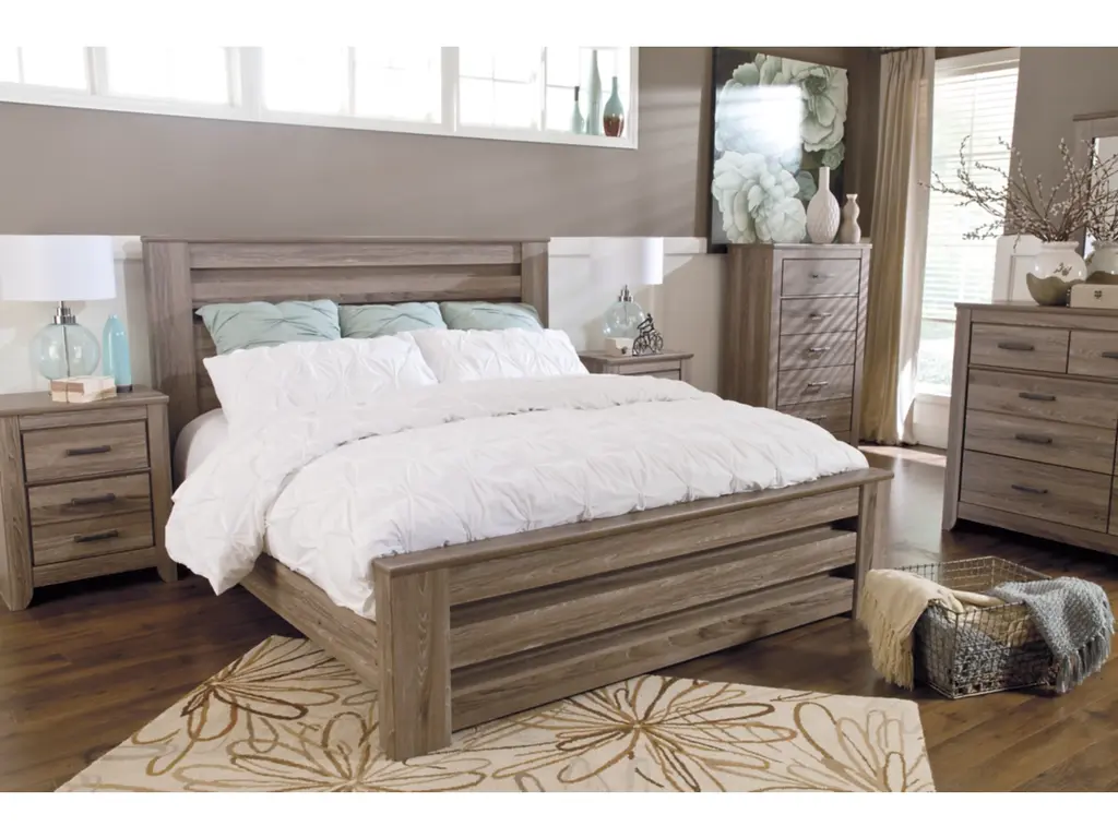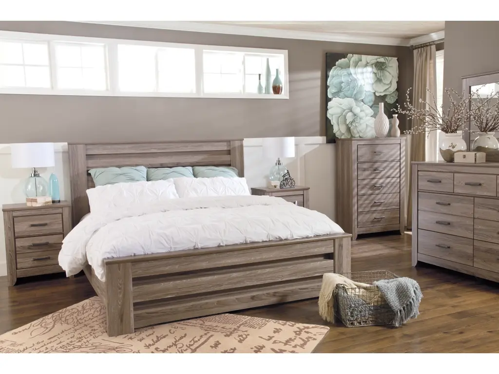 Urban sophistication with a decidedly relaxed air. If effortless elegance is the impression you’re going for, the Zelen 6-piece bedroom set is such a natural choice. Its crisp and contemporary aesthetic is softened with an earthy gray finish that lets the beauty of replicated oak grain flow through. The king panel bed’s pocket plank styling offers great dimension. Dresser/mirror’s seven various size drawers cleverly accommodate. Nightstand with two smooth-gliding drawers of varied size make it a bedroom essential. Mattress and foundation/box spring available, sold separately.