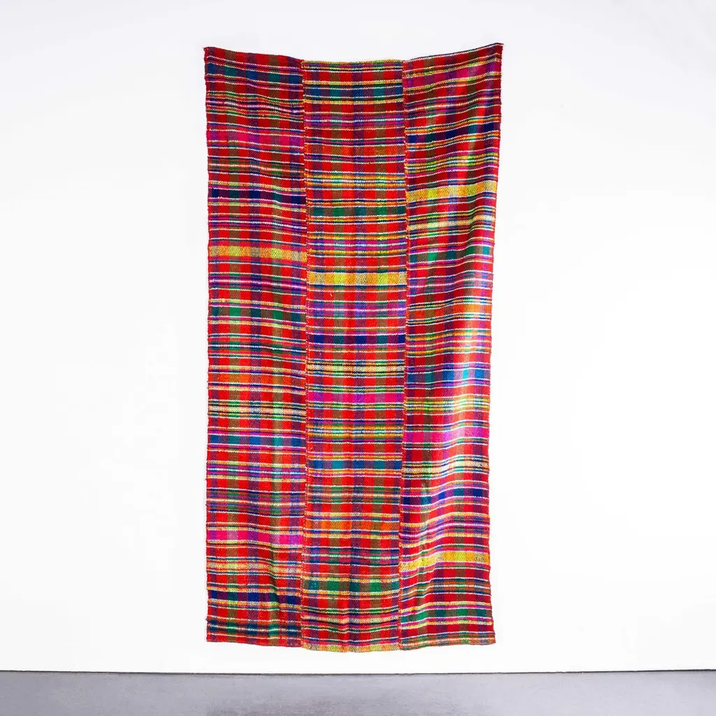 1950’s Handmade Stripey Folk Hungarian Wool Bedspread. We have been collecting these for some time, they are hard to find and very beautiful. We have a number of blankets often of similar designs, all woven by hand in simple traditional patterns. Made in wool they are a decent weight and feature rich colours and traditional patterns. The selvedge edges are finished by hand. The listing is for one blanket as listed and photographed. Every blanket is unique although in a few exceptional cases we have managed to collect more than one of a design and hence a small quantity might be available.Workshop Report:Delicate handwoven textile product do not machine wash, we recommend very gentle hand washing or check with a drycleaner.Date:1950'sMaker:Handmade – HungaryDimensions:124cm(w) x 265cm(l) x 1cm(h)