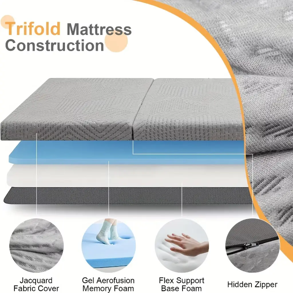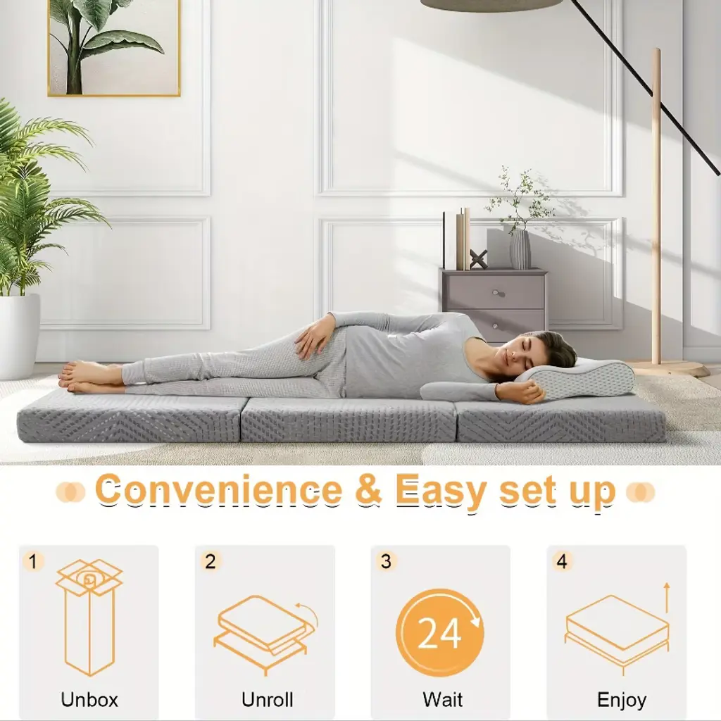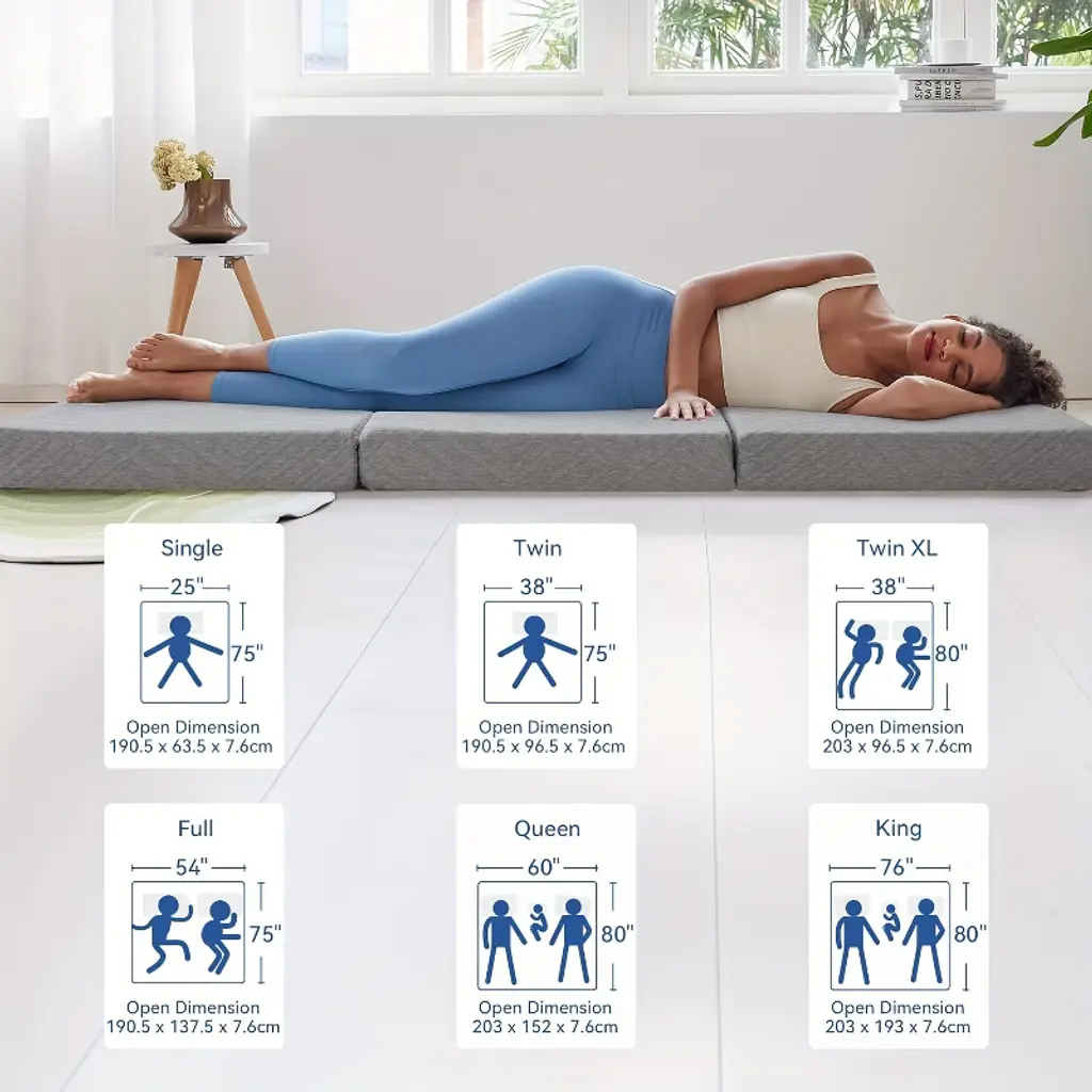Tri-fold Memory Foam Mattress topper: Our tri-fold memory foam mattress topper is the perfect solution to the temporary sleeping. This also be useful when there is no place for an unexpected guest comes into your home need to stay overnight. And the strong support, perfect fit with the body, not easy to deformation, portable use. a Variety of Situations: Plus, the tri-fold mattress can be folded up and carried. When folded up, it can be used as a cushion, which can be stored anywhere, practical and space-saving. You can also take it outside and use it as a picnic mat because it's washable, so you don't have to worry about getting dirty. Premium Structure: The gel memory foam allows you to adjust your temperature when you lie on it, and it gives you a cool feeling. Effectively distribute your pressure points. The Support Base Foam has strong support to ensure that the body is separated from the floor and does not feel wet, giving you an extreme sleep experience.