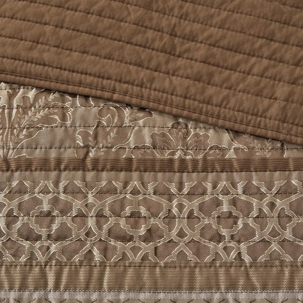 Elevate your bedroom decor with the luxurious indulgence of our 5-Piece Reversible Jacquard Bedspread Ensemble. Crafted from quilted polyester jacquard, the coverlet and shams boast elegant leaf, woven striping, and ironwork motifs, all beautifully accentuated by intricate stitching. Glimpses of opulent gold are thoughtfully integrated throughout this collection, infusing a lavish aura into your decor. Completing this stately ensemble are two decorative pillows featuring meticulously embroidered details that harmoniously correspond to the coverlet. For your convenience, this jacquard bedspread is machine washable, making it easy to care for while bringing an extravagant and traditional touch to your bedroom. Experience the grandeur of a regal reverie with this exquisite ensemble.