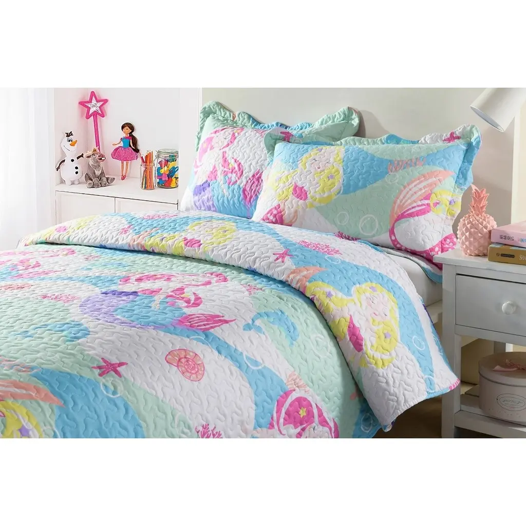 Brighten up your kid's room with the Taylor & Olive Kids Mermaid Bedspread Set. This 2/3 piece set comes in a variety of vibrant patterns that will bring warmth and personality to your home. Top decorators around the world consistently choose these quilt sets for their excellent quality and design. Available in King, Queen/Full, and Twin sizes, with measurements ranging from 68" x 86" to 102" x 86".Features: