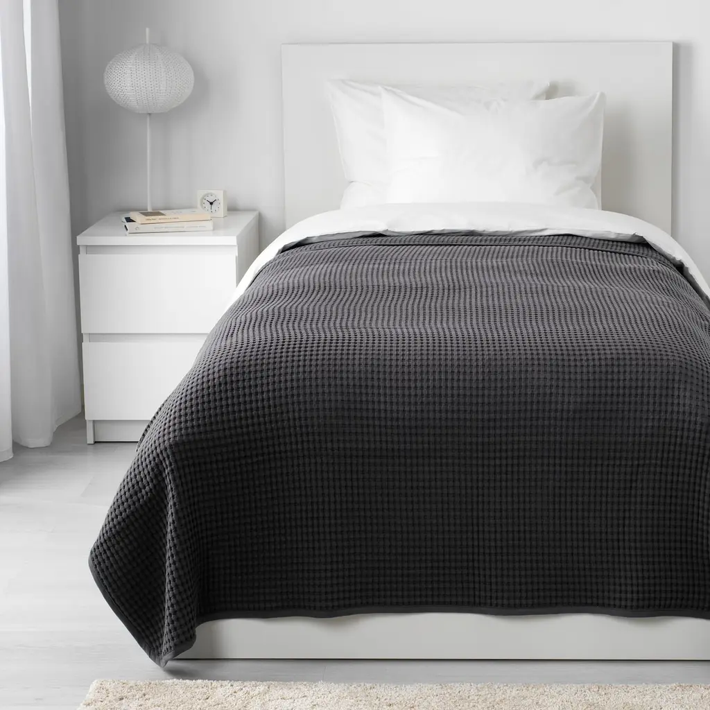VÅRELD Bedspread - dark gray 59x98 ". This woven cotton bedspread gives your bed a vibrant, decorative look and extra warmth and comfort for you. Can be used as a bedspread for a single size bed or as a blanket for a larger bed. The bedspread fits 35⅜" beds with approx. 12" drop on each side.