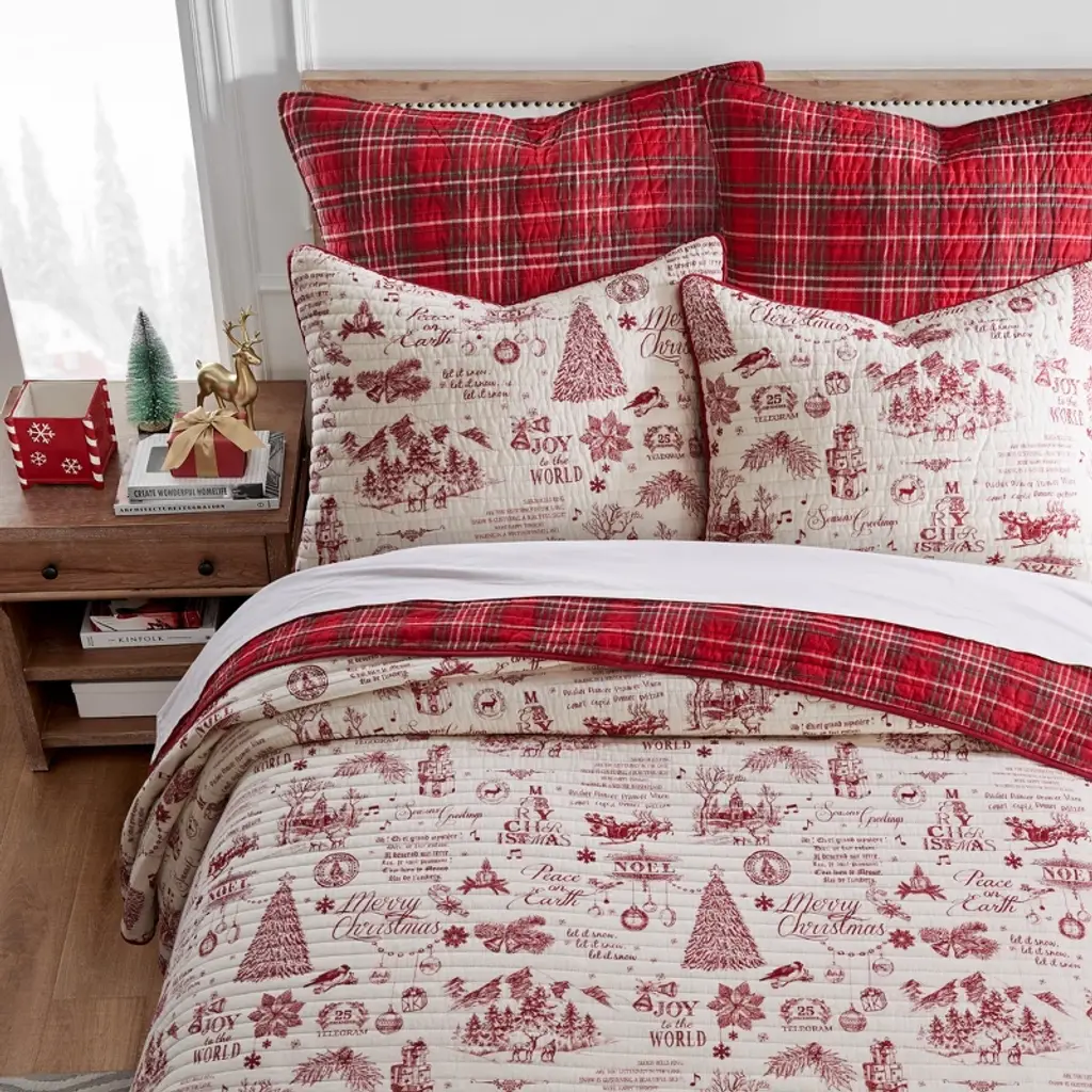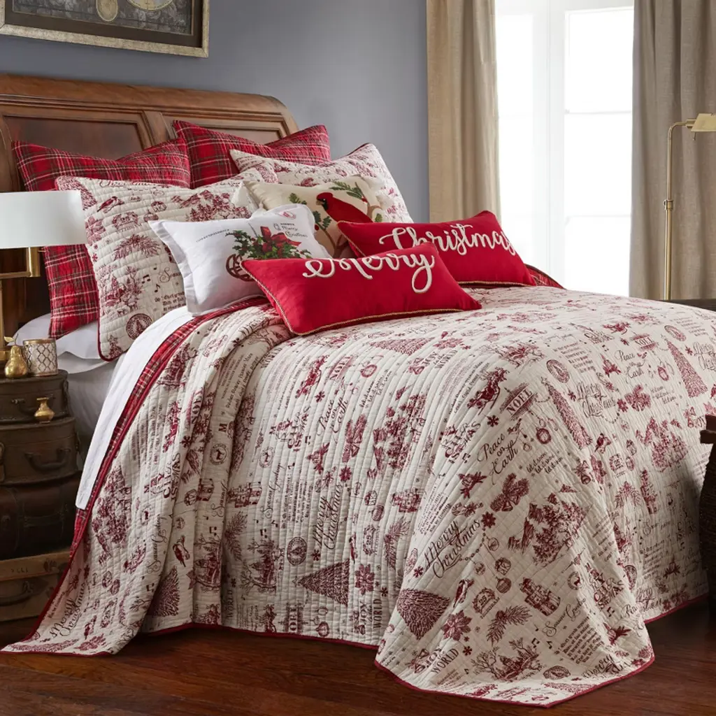 The Yuletide Bedspread Set by Levtex Home is inspired by traditional holiday cheer. Offered in red and cream, this design will immediately transform your bedroom. This bedspread features a mix of holiday icons and phrases in red script on a cream ground on the front, reversing to a rich red, green and cream plaid on the back. The Bedspread and Sham (20x26in.) have a cotton front and back, filled with a cotton-rich filler, and are machine washable. Enjoy this for years to come!