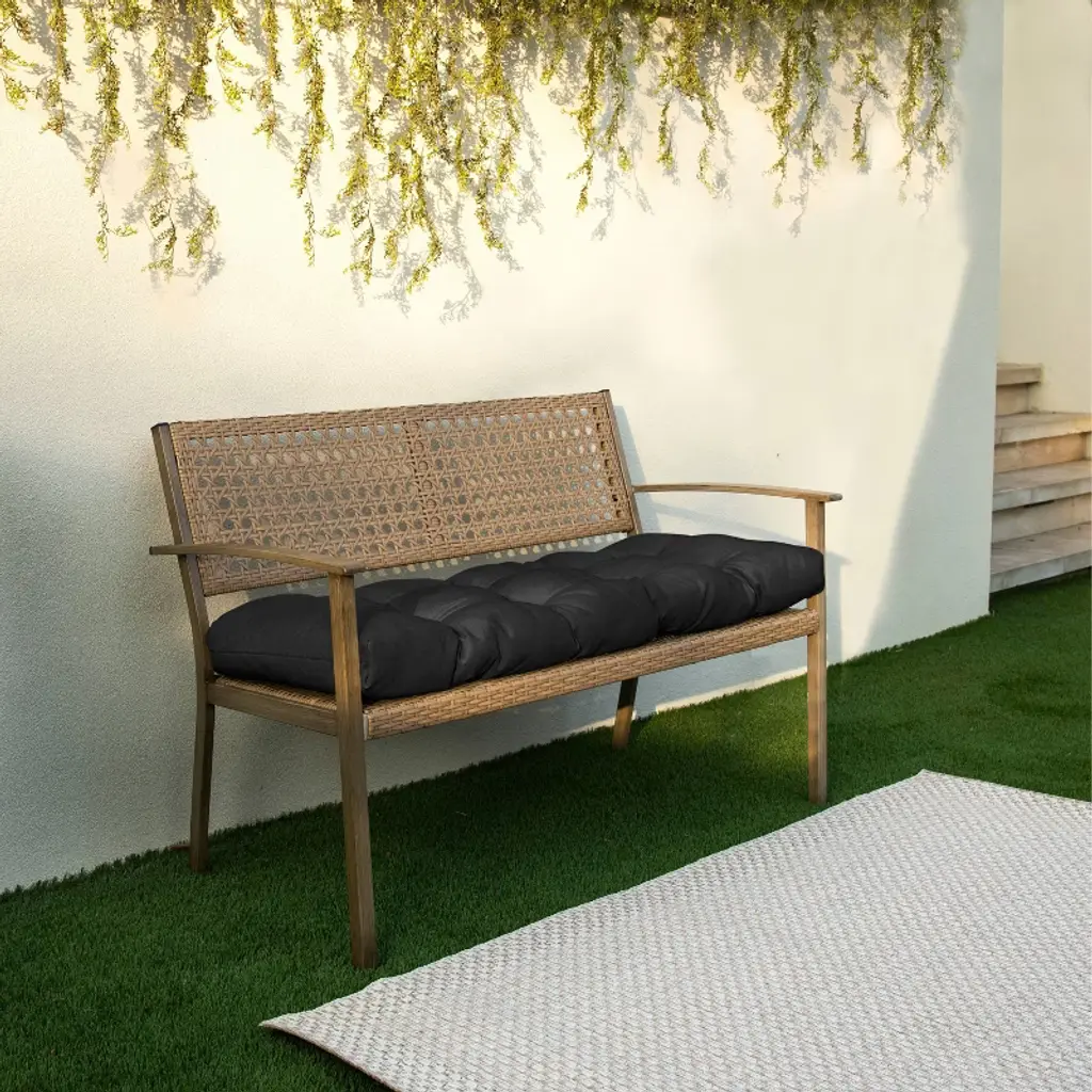 Sit back in style in your own outdoor paradise with this luxurious black tufted Sunbrella bench cushion. With a fresh solid fabric, this tufted cushion is sure to add flair and a personal touch to any outdoor bench, from the backyard to the patio. Created with durable, weather and fade-resistant material in North America, this cushion offers quality you can depend on year after year!