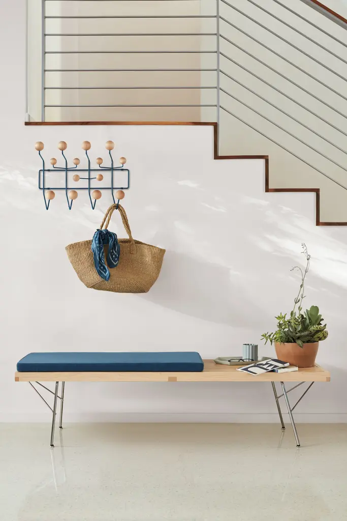 The Nelson Platform Bench Cushion makes a good thing even better, increasing the comfort of this classic piece by covering the open lattice of finger joints on its top. The cushion, upholstered in a choice of fabric or leather, comprises a single piece of polyurethane foam, a material chosen for its softness and durability. It attaches to the bench via Velcro fasteners that fit around the slats. The Nelson Bench Cushion is available in two sizes.