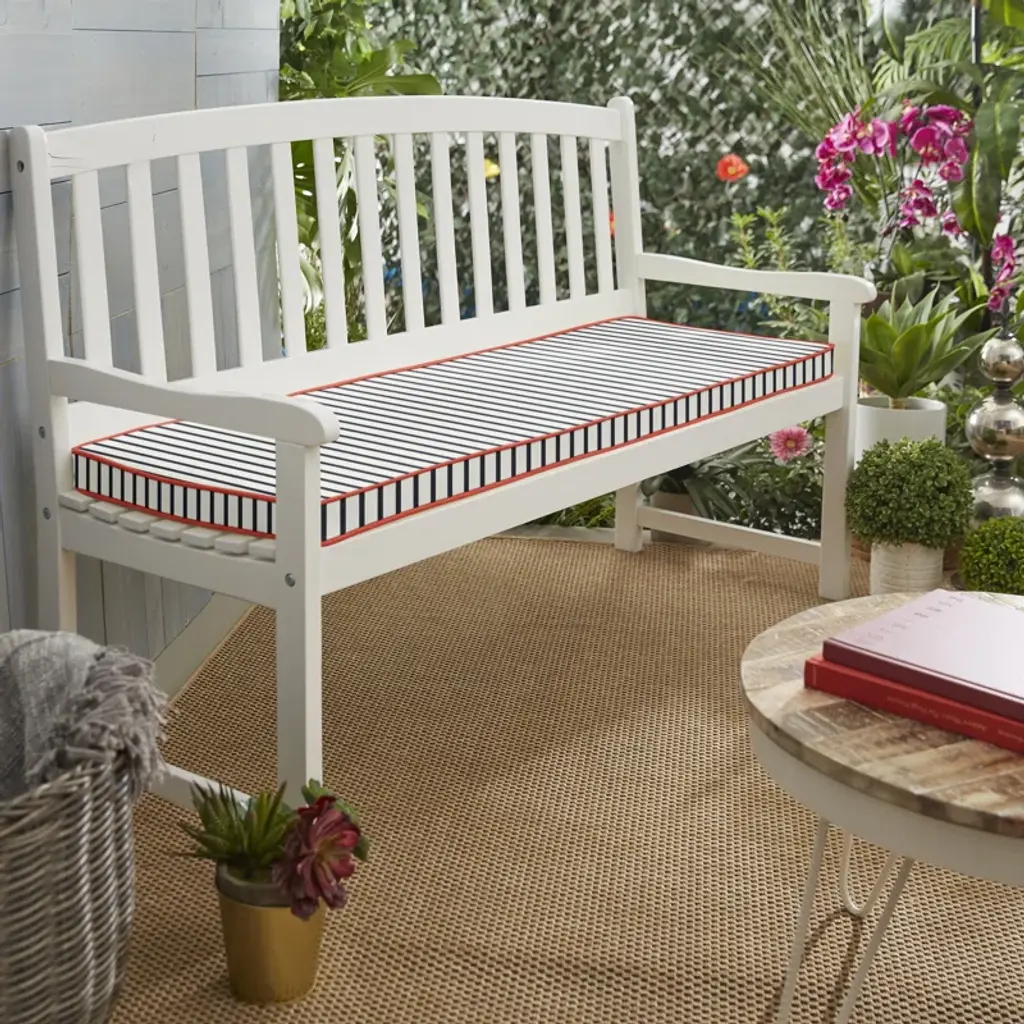 This 1-piece outdoor bench seat cushion updates your comfortable spot for relaxing on your coastal farmhouse patio. It's made with a 100% acrylic Sunbrella fabric that's resistant to weather, water, UV rays, fading, mildew, and stains and is filled with polyester. The pattern features vertical stripes in a nautical print of navy and white, with a melon, orange-red piped edging trim. We love that the cushion cover is removable with zipper closure, so it's easy to remove and spot clean.