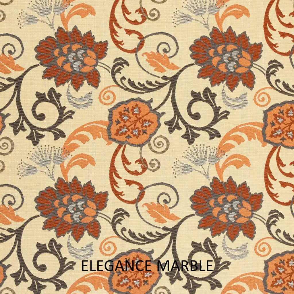 The tan and ivory base of this Sunbrella Elegance Marble fabric is decorated with a classic floral print in brown, orange and Gray. Update a patio or poolside seat with this charming outdoor bench seat cushion. Designed for comfort, it also affords ultimate decorative effects with a romantic floral cover made from weather and sun resistant outdoor fabric. Its pure recycled fiber fill ensures supreme seating comfort, and attached ties secure the cushion to avoid slippage. Cover removal for spot-cleaning is easy through a zipped enclosure. Primarily designed for outdoor use, this elegant floral cushion also works nicely for interior casual spaces.