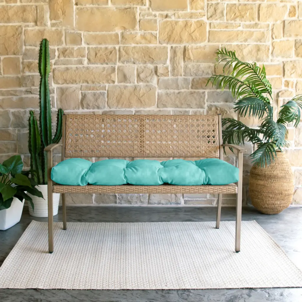 Refresh your outdoor seating with this versatile tufted bench cushion. Featuring a stunning solid fabric, this cushion is sure to add comfort and style to any bench, from the porch to the patio. Crafted out of a strong, weather-resistant material right here in North America, this tufted cushion is made to withstand wear and tear so all you have to do is sit back and relax! Sunbrella is founded on the belief that fabrics should be both beautiful and functional. We began in the 1960s with the challenge of creating an awning canvas with a substantially longer lifespan than cotton. Sunbrella has become widely adopted for shade structures, marine canvas and upholstery fabric for both outdoor and indoor applications.Our textiles are made with close attention to design detail, and engineered with robust performance characteristics that provide resistance to fading and degradation from sunlight and chemical exposure. The fabric is tactile yet durable, has industry-leading environmental characteristics, is easy to care for and offers long life wherever it''s used.No Sunbrella manufacturing facility in the world sends waste to landfills. A result of our focus on efficiency, this monumental achievement allows Sunbrella to lead by example, putting sustainability into practice every day across the globe. Our unique coloring process not only makes Sunbrella fabrics fade-resistant, it also conserves more water than conventional dyeing processes. At Sunbrella we believe it''s important to preserve the environment around our facilities. We work to conserve the plant and animal life that is native to the area and encourage our employees to plant gardens designed to provide fresh food and nourish local wildlife.We stand behind our fabrics with a guarantee that''s the best in the industry: a 5-year limited warranty for upholstery. This warranty protects the original purchaser of Sunbrella fabric. This warranty protects against Sunbrella fabric becoming unserviceable due to color or strength loss from normal usage and exposure conditions, including sunlight, mildew and atmospheric chemicals.