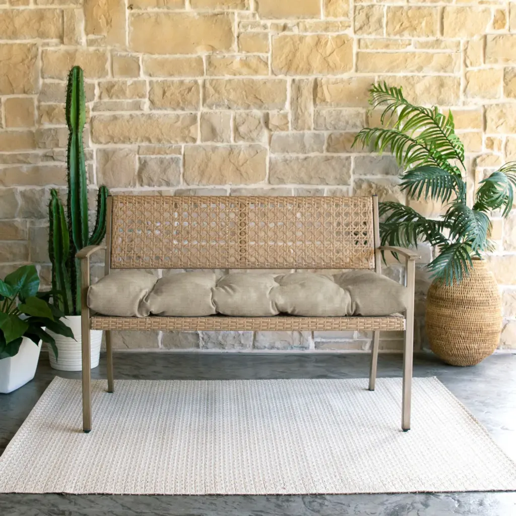 Refresh your outdoor seating with this versatile tufted bench cushion. Featuring a stunning solid fabric, this cushion is sure to add comfort and style to any bench, from the porch to the patio. Crafted out of a strong, weather-resistant material right here in North America, this tufted cushion is made to withstand wear and tear so all you have to do is sit back and relax! Sunbrella is founded on the belief that fabrics should be both beautiful and functional. We began in the 1960s with the challenge of creating an awning canvas with a substantially longer lifespan than cotton. Sunbrella has become widely adopted for shade structures, marine canvas and upholstery fabric for both outdoor and indoor applications.Our textiles are made with close attention to design detail, and engineered with robust performance characteristics that provide resistance to fading and degradation from sunlight and chemical exposure. The fabric is tactile yet durable, has industry-leading environmental characteristics, is easy to care for and offers long life wherever it''s used.No Sunbrella manufacturing facility in the world sends waste to landfills. A result of our focus on efficiency, this monumental achievement allows Sunbrella to lead by example, putting sustainability into practice every day across the globe. Our unique coloring process not only makes Sunbrella fabrics fade-resistant, it also conserves more water than conventional dyeing processes. At Sunbrella we believe it''s important to preserve the environment around our facilities. We work to conserve the plant and animal life that is native to the area and encourage our employees to plant gardens designed to provide fresh food and nourish local wildlife.We stand behind our fabrics with a guarantee that''s the best in the industry: a 5-year limited warranty for upholstery. This warranty protects the original purchaser of Sunbrella fabric. This warranty protects against Sunbrella fabric becoming unserviceable due to color or strength loss from normal usage and exposure conditions, including sunlight, mildew and atmospheric chemicals.
