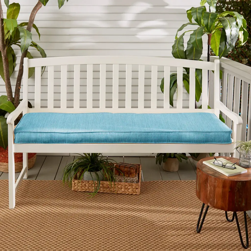 Maximize seating in a patio or poolside area. This outdoor bench cushion provides comfortable seating on an outdoor bench or an interior window seat. Soft, durable outdoor fabric provides beautiful cover over pure recycled fiber, resisting weather and sun damage. Remove its cover through a zippered enclosure for easy spot cleaning, and secure to a bench seat with attached ties. The blue shade of this outdoor bench cushion provides a perfect bridge between decadent prints and coordinating solids to stylize an inside or outside living space.