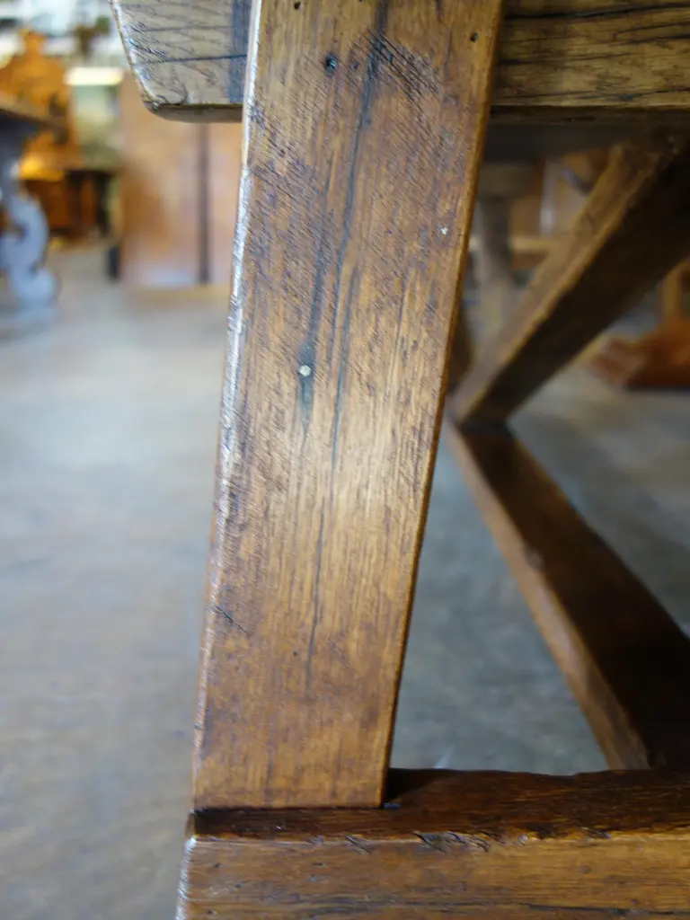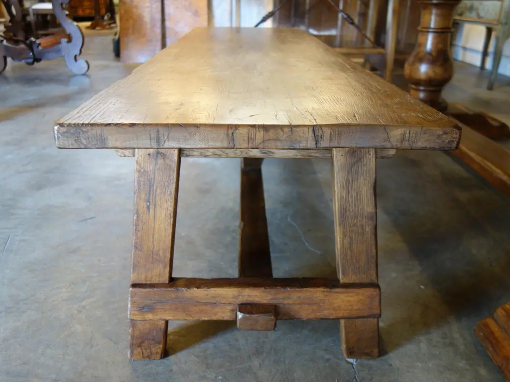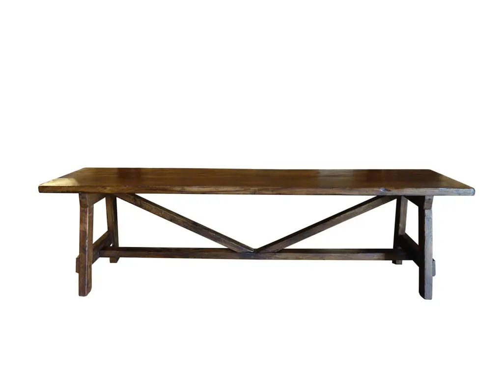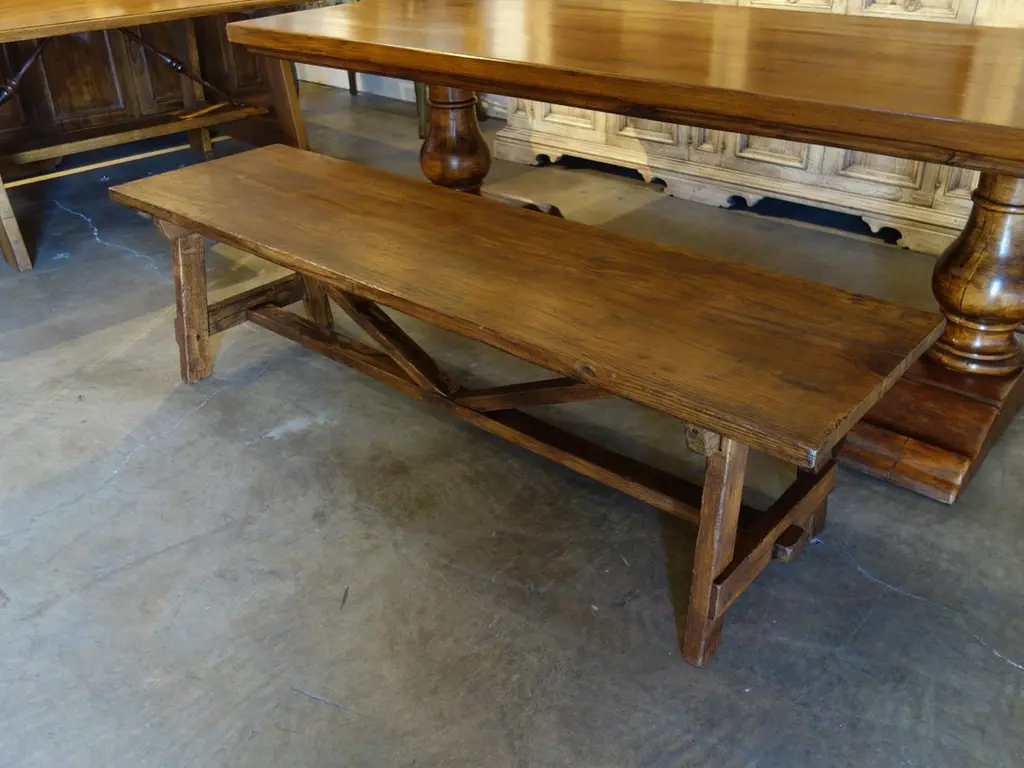 Bellini's Capretta bench style - a perfect seating companion for our table collection. Trestle style with carved cross stretchers. Handcrafted to order in aged solid European oak by our Master Craftsmen in Italy. Forged iron joinery. Available in custom size by quote and a variety of wood species & finish color.Measures as shown: 72" L x 20" W x 20" H, 1.5" thick bench seatOptional finishes include:- Natural blonde shellac- Classic shellac- Espresso Dark stain shellac - Moro blackened shellacGloss, satin & waxed finishes also available to orderAlso available in Old Chestnut, Poplar, or Walnut with smooth or brushed grain finish.Please view our available finishes on our listings & contact us for more information. See our Capretta Style desk and table listings, which are available quoted in European Oak as well.