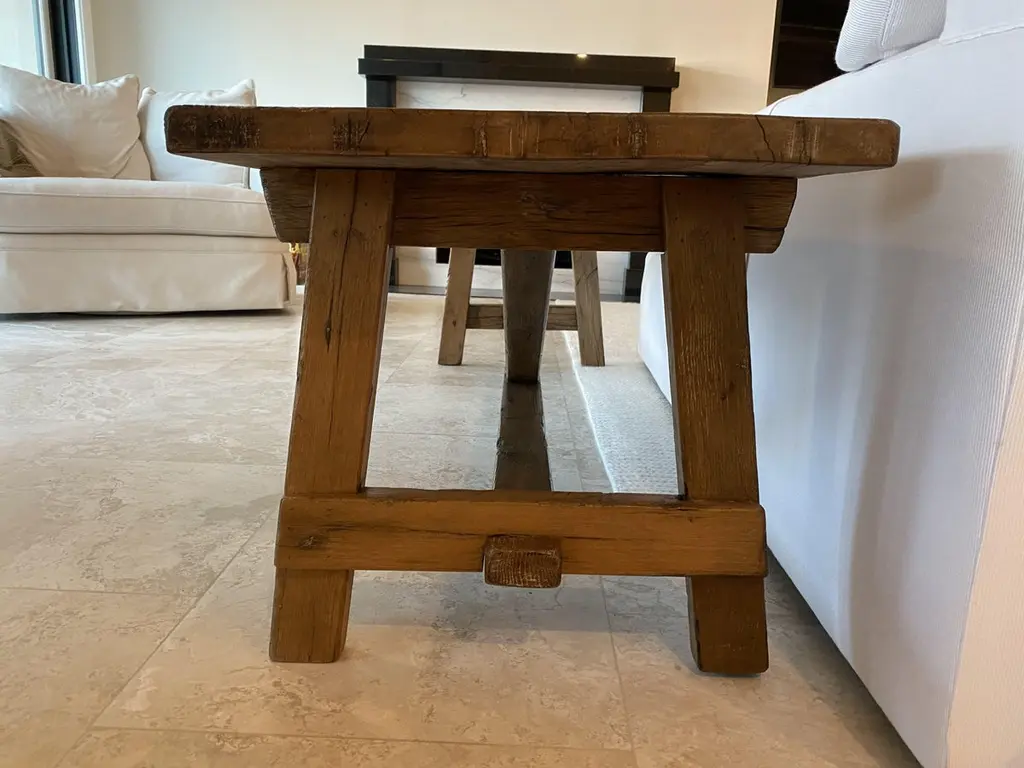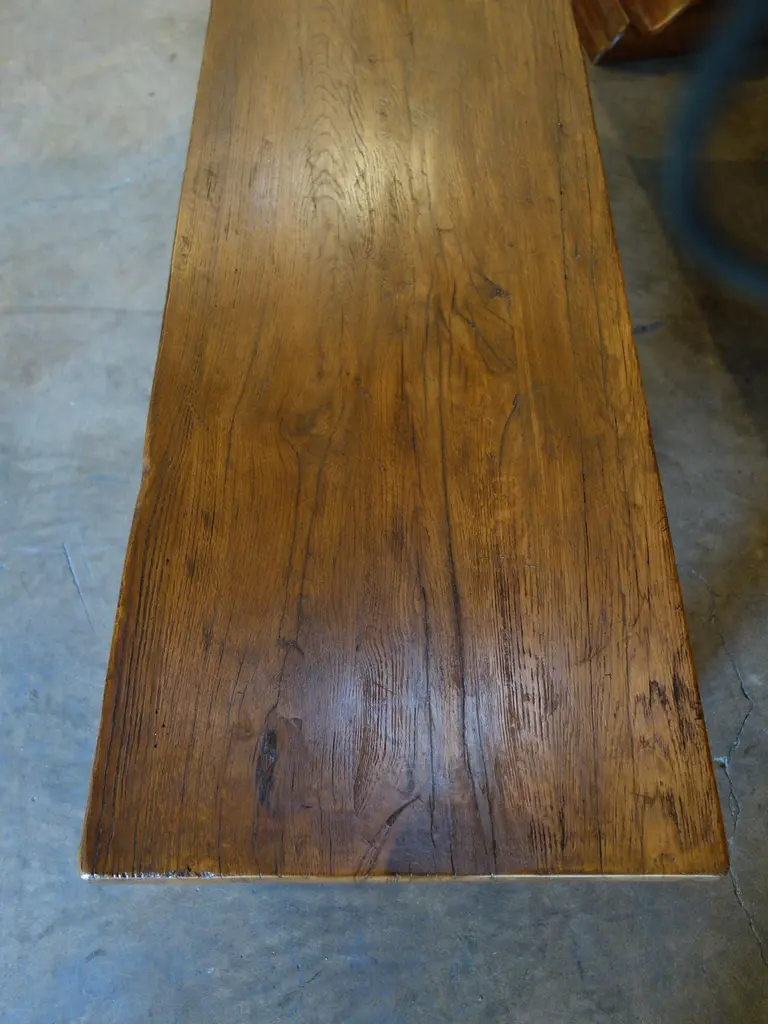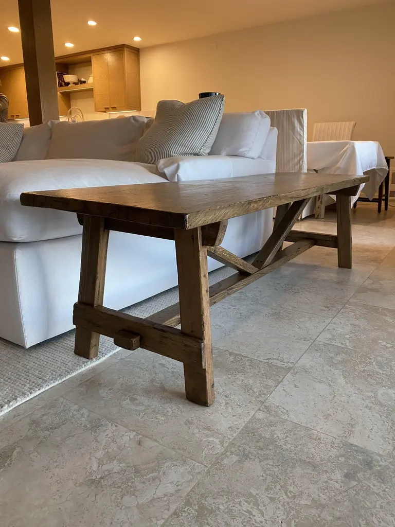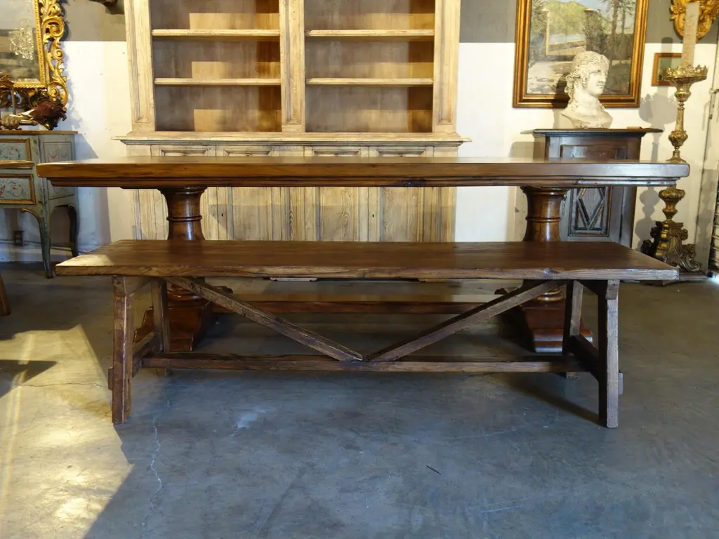 Bellini's Capretta bench style - a perfect seating companion for our table collection. Trestle style with carved cross stretchers. Handcrafted to order in aged solid European oak by our Master Craftsmen in Italy. Forged iron joinery. Available in custom size by quote and a variety of wood species & finish color.Measures as shown: 72" L x 20" W x 20" H, 1.5" thick bench seatOptional finishes include:- Natural blonde shellac- Classic shellac- Espresso Dark stain shellac - Moro blackened shellacGloss, satin & waxed finishes also available to orderAlso available in Old Chestnut, Poplar, or Walnut with smooth or brushed grain finish.Please view our available finishes on our listings & contact us for more information. See our Capretta Style desk and table listings, which are available quoted in European Oak as well.
