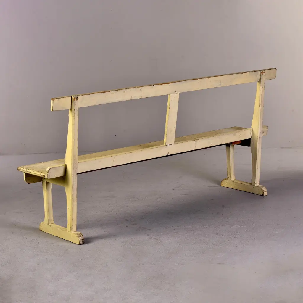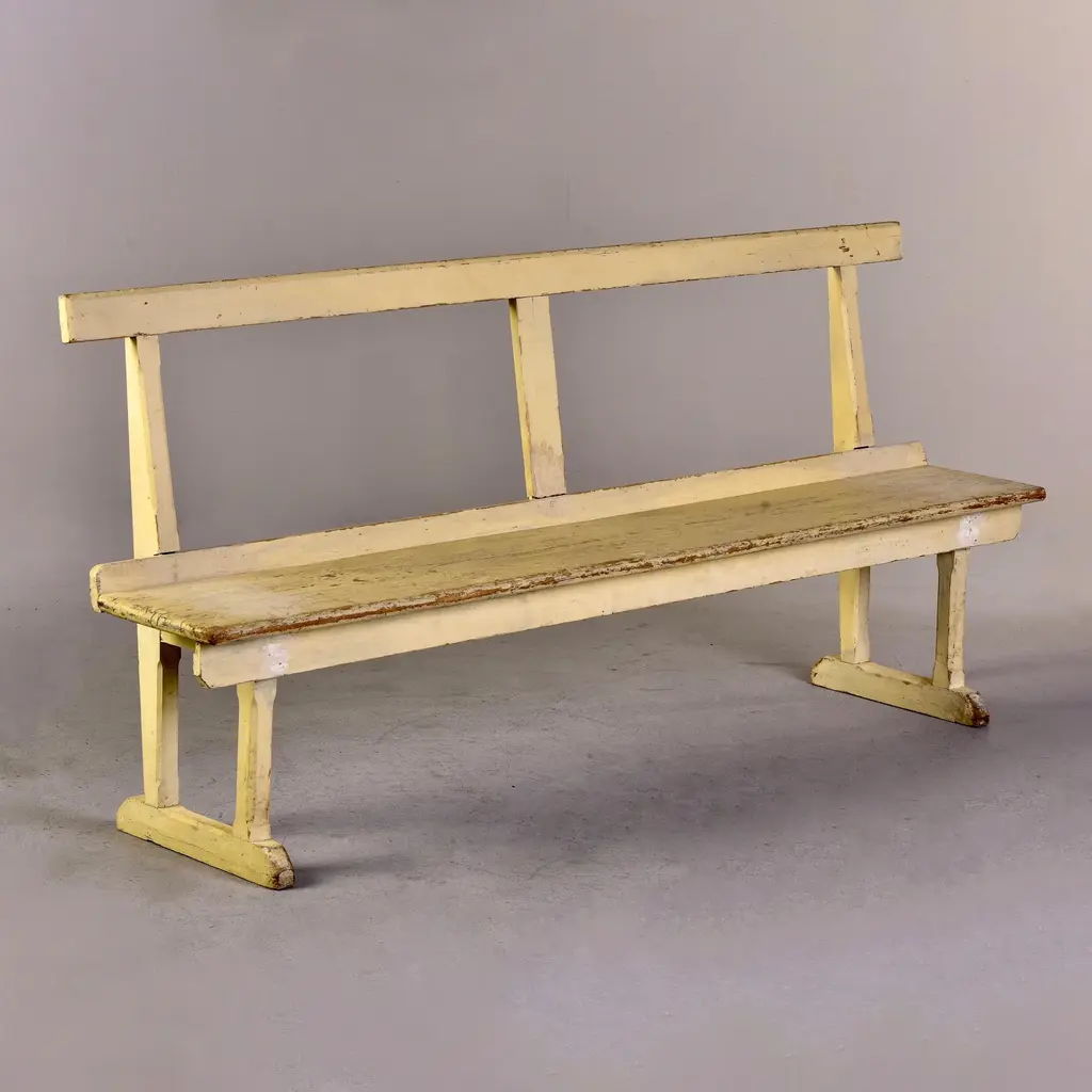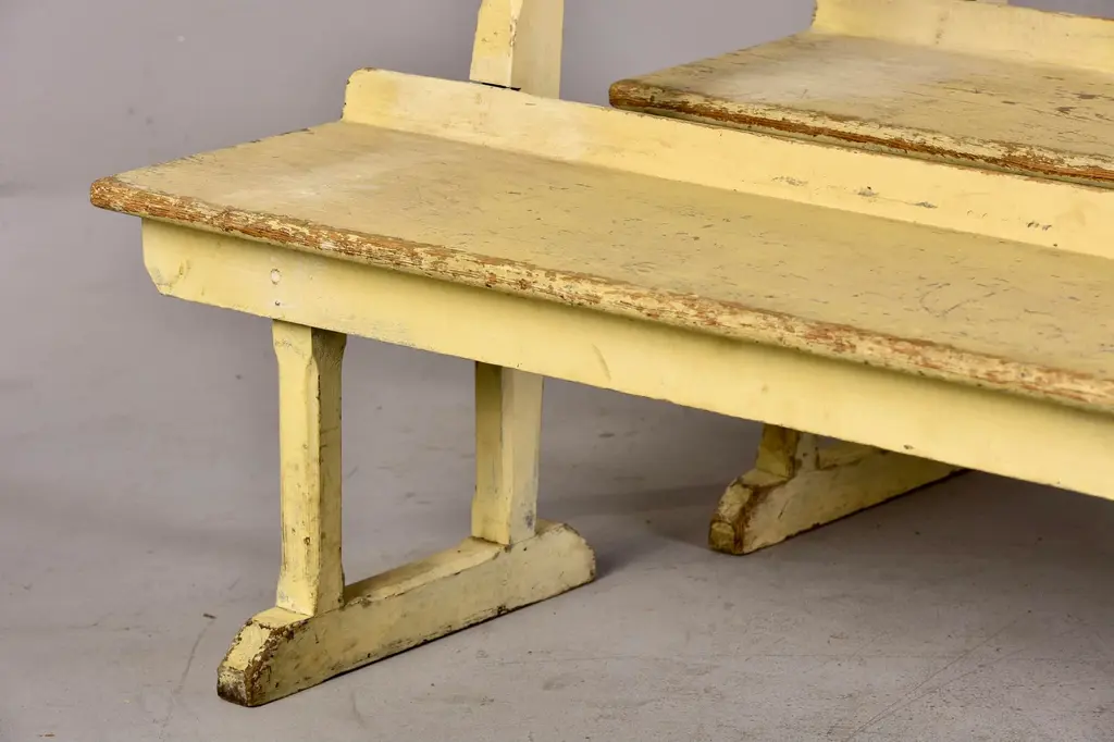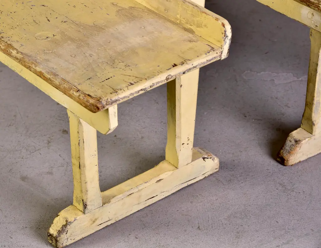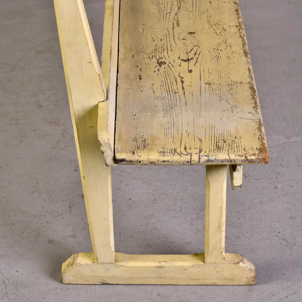 Circa 1880s English slender wooden bench with pale, butter yellow painted finish. Two benches in this size and finish available at the time of this posting. Sold and priced individually. Measures: Seat height: 16" seat depth: 11.5"