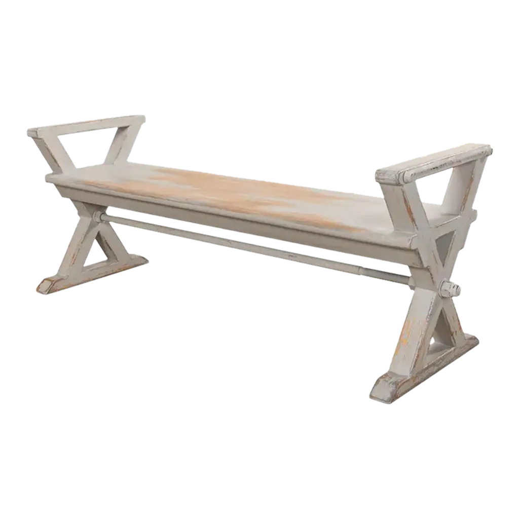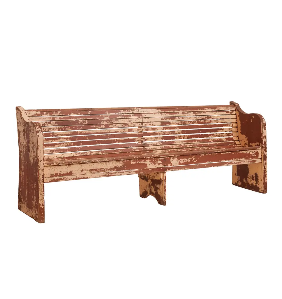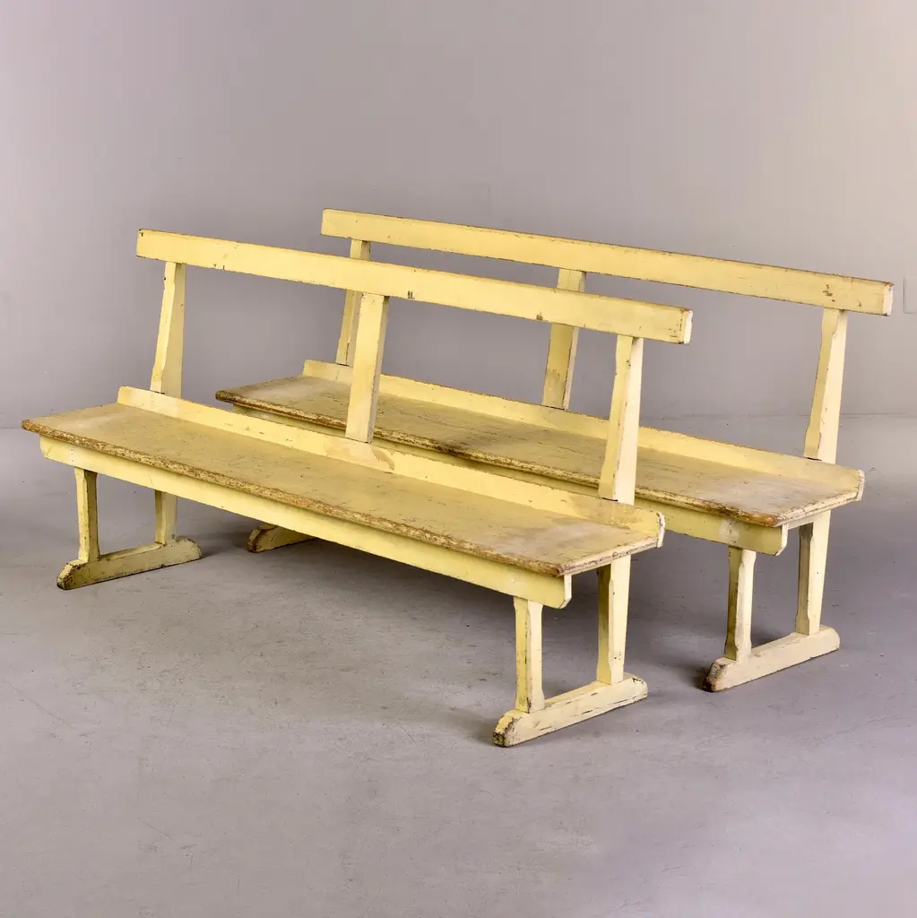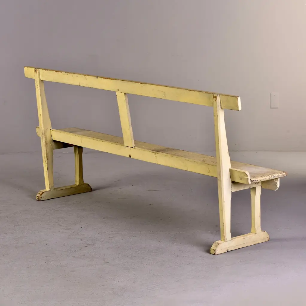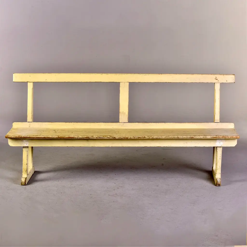 Circa 1880s English slender wooden bench with pale, butter yellow painted finish. Two benches in this size and finish available at the time of this posting. Sold and priced individually. Measures: Seat height: 16" seat depth: 11.5"