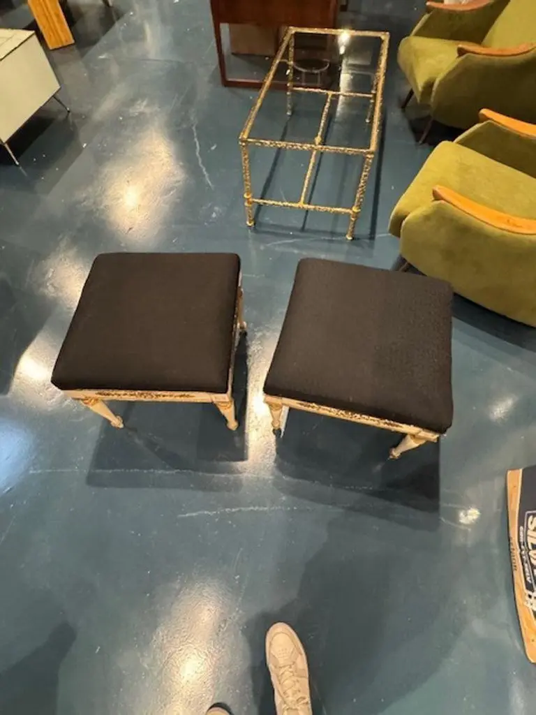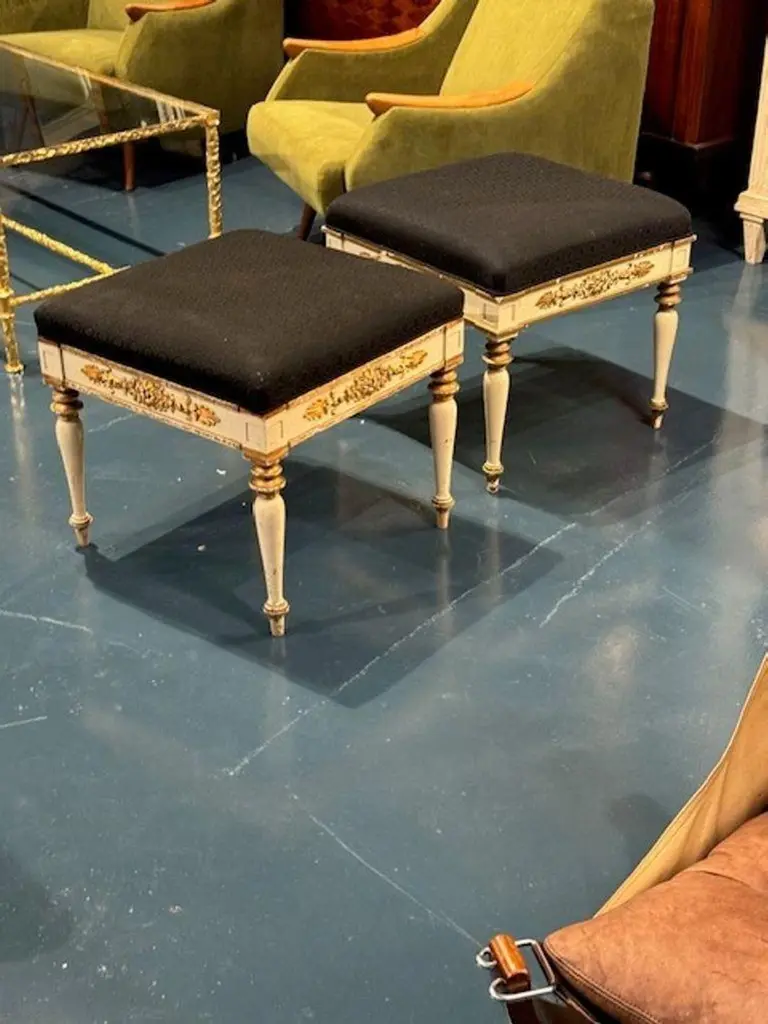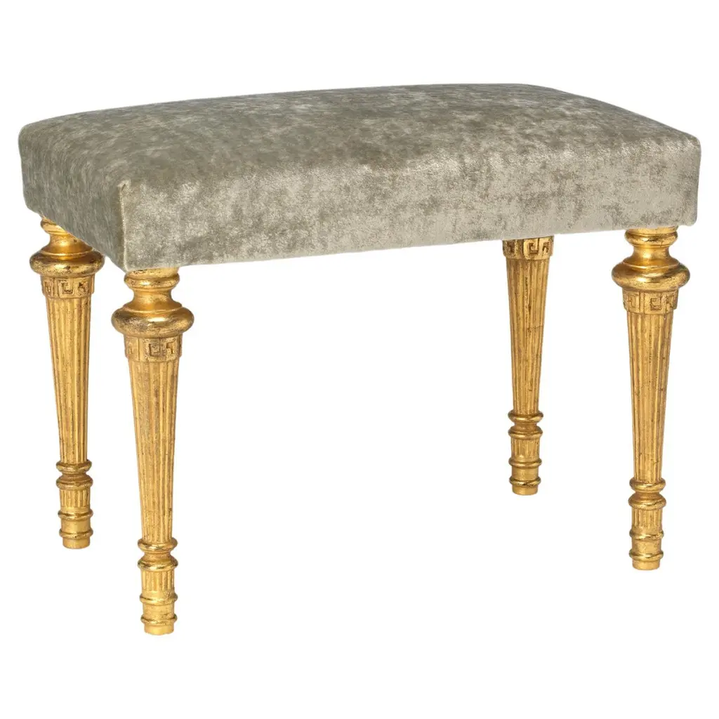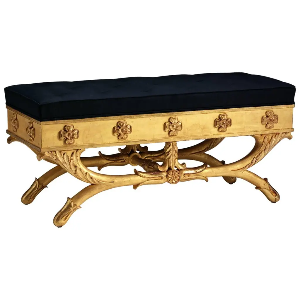 Lovely pair of Danish carved and painted benches by Jorgen Hansen Koch. Featuring a lovely floral pattern in a gold gilt and upholstered in a gray fabric. Note: There are 2 set available. Adds a real touch of elegance. Circa 189020w x 20d x 19h