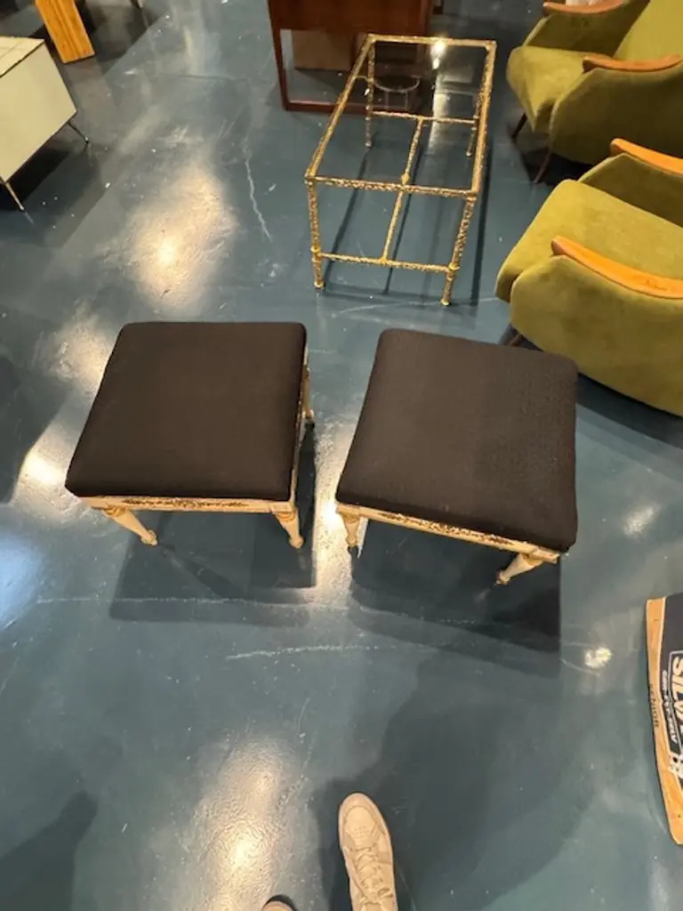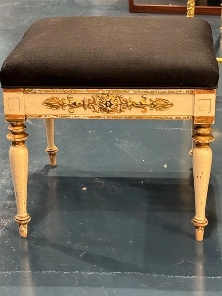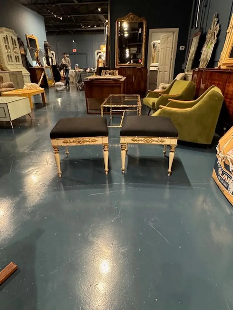 Lovely pair of Danish carved and painted benches by Jorgen Hansen Koch. Featuring a lovely floral pattern in a gold gilt and upholstered in a gray fabric. Note: There are 2 set available. Adds a real touch of elegance. Circa 1890 20w x 20d x 19h