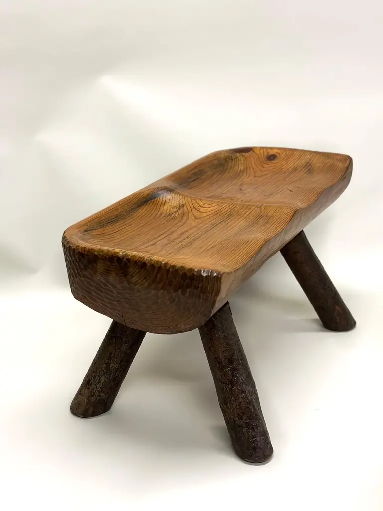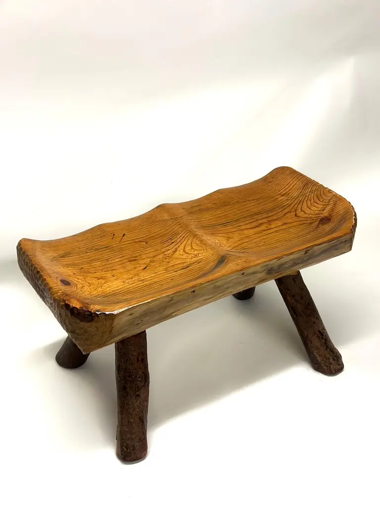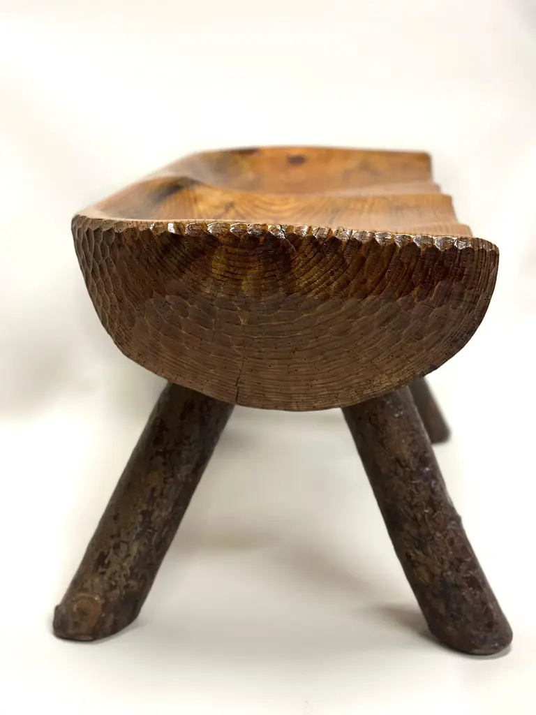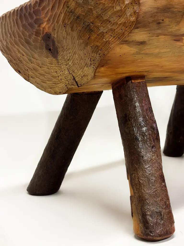 2 Rare, Hand Carved Cypress, Italian Alpine Benches circa 1950. The pieces convey the Mid-Century Modern Craftsman aesthetic with its emphasis on hand made pieces, using honest materials and reflecting sober, modern sensibilities in conjunction with the influence of nature. They are original pieces, hand carved from blocks of wood with hand carved wood seats and hand chiseled around the apron to provide details of the sensuous wood. They are practical and functional, timeless works of sculpture to be enjoyed by generation after generation. Priced and Sold as Individual Pieces.