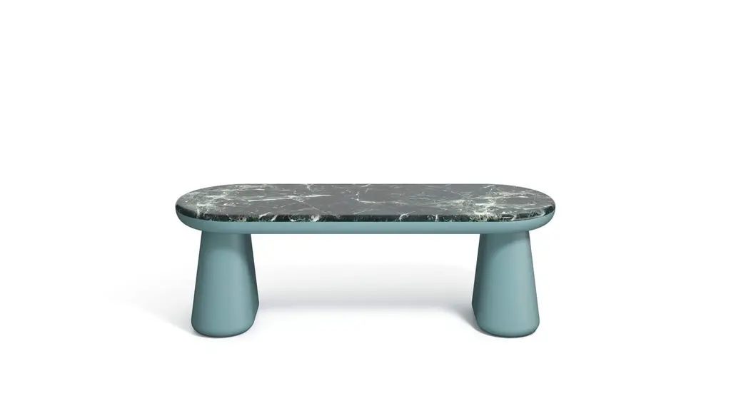 Ione Bench, design by Elena Salmistraro for Scapin CollezioniNew Atomic Age CollectionIn Ione bench, the encounter between simple geometries and graphic designs of the Limited Edition leaves room for monochromes that mix polyurethane and marble in eight combinations of absolute elegance.Designer and artist Elena Salmistraro takes her inspiration from the historical period between the 1940s and 1960s. During those years the world was a victim of the Cold War and afraid of the imminent nuclear catastrophe, but , despite the scary climate, the public found the strength to imagine a better future.Bold and graphic shapes linked to the fear of the atom were recurrent in the artistic expression of the time as a symbol of the common will to change people’s destiny and defeat the overwhelming sense of fear.The Scapin Collezioni collection by Elena Salmistraro reflects these neo-tribal and post atomic symbols through precious inlays and innovative resin carvings on marble surfaces.Elena Salmistraro synthesised the neo-tribal, post-atomic language also in almost monochromatic furnishings, with calm and elegant nuances.