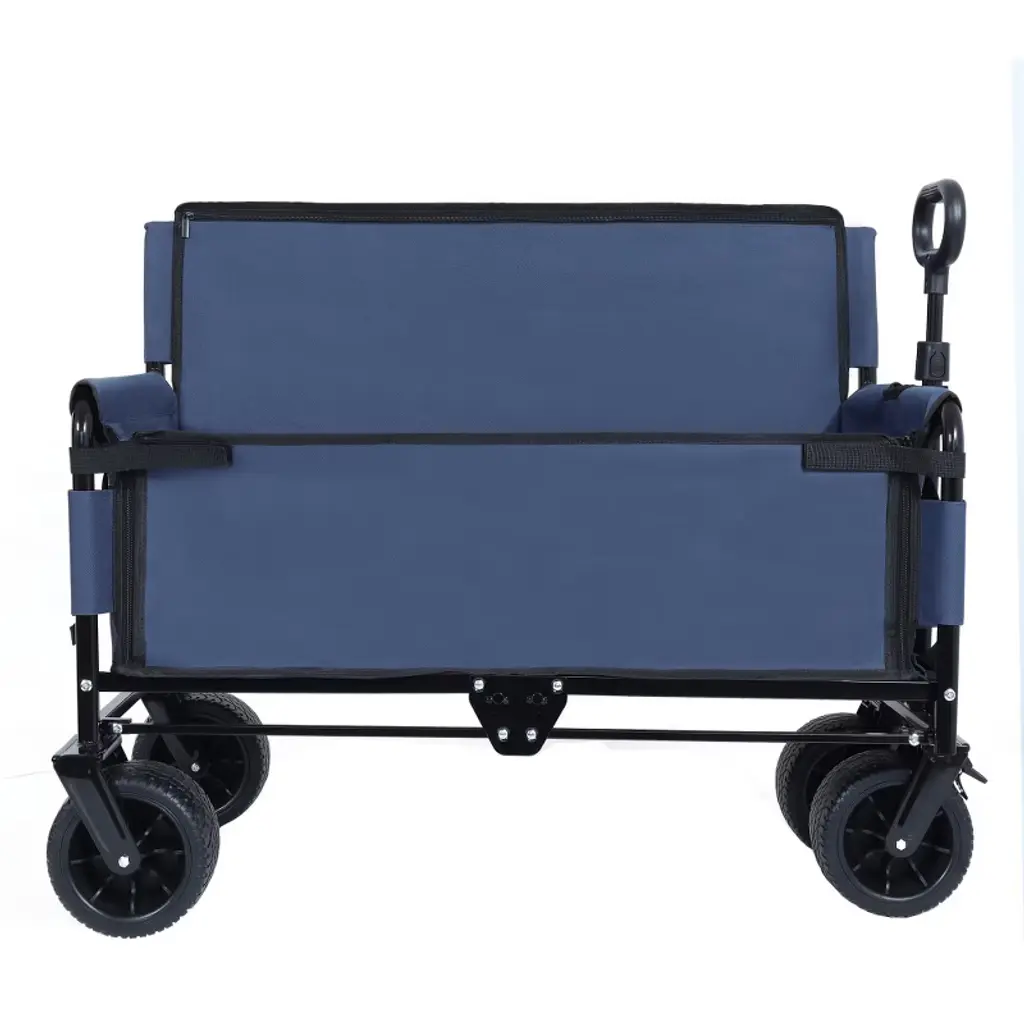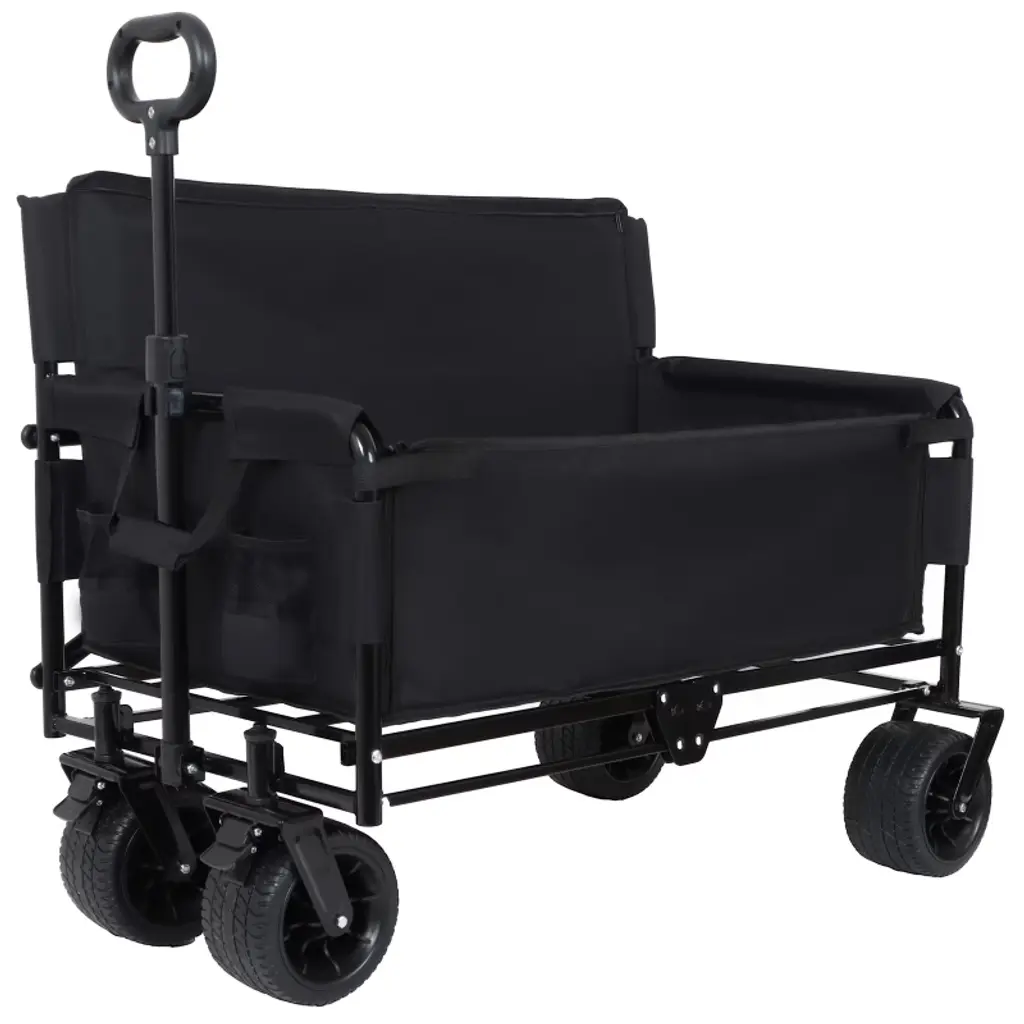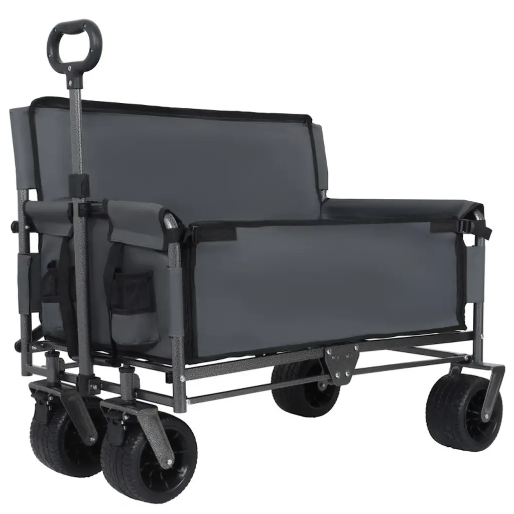 Multi-Functional Seat Wagon - UNIQUE SEAT CONVERSION - Doubles as a secure seating solution with 500lb capacity. Reinforced frame and padded base safely support children or adults. Side zippers allow easy entry/exit, ideal for parks, camping, or event venues. Perfect for tired little legs, elderly companions, or impromptu seating at outdoor gatherings.Ultra-Compact Folding & Lightweight Design - Foldable wagon collapses to 50% smaller than competitors, effortlessly fitting in car trunks or tight spaces. At just 27 lbs, kids can pull it effortlessly. Features an integrated pull cord for instant one-step folding.Heavy-Duty Collapsible Wagon - Built with 1.2mm reinforced carbon steel frame supporting up to 500lbs. 180L (6.4 cu.ft) organized cargo space perfect for grocery hauls, apartment moves, or outdoor gear. Reduces heavy-lifting strain with secure item transportation.All-Terrain 360 Wheel System - Dual front swivel wheels enable nimble maneuvering on any surface. Equipped with double bearings for enhanced load-bearing and safety, this wagon ensures smooth transport.Smart Self-Locking Handle - 3-position adjustable handle tilts 90. Automatically lifts clear of ground when released, eliminating trip hazards while maintaining clean lines.