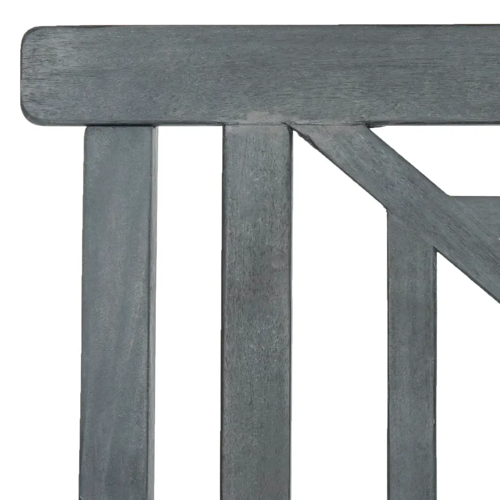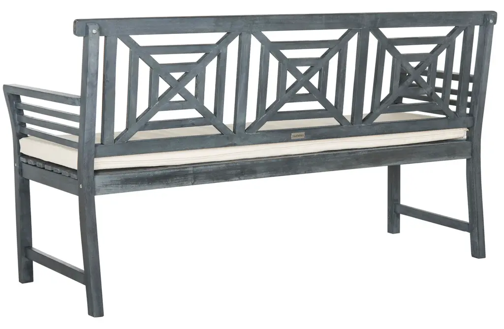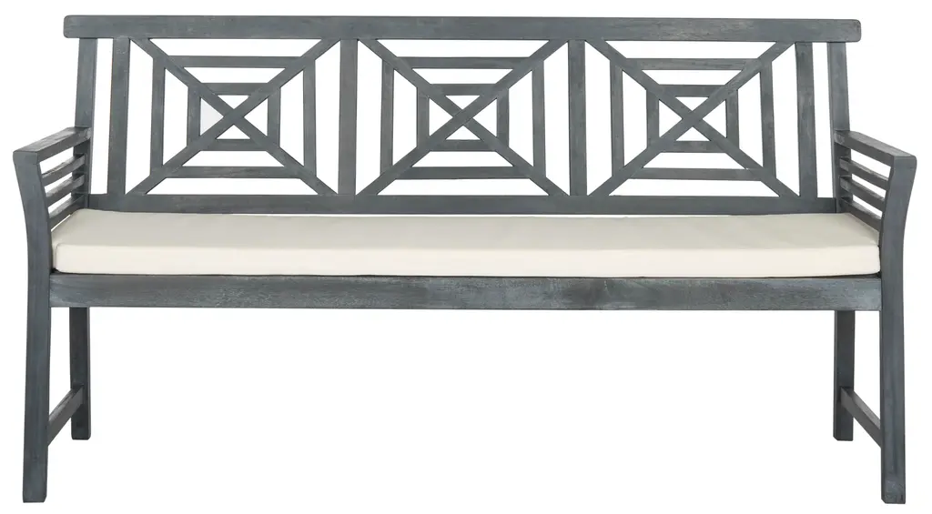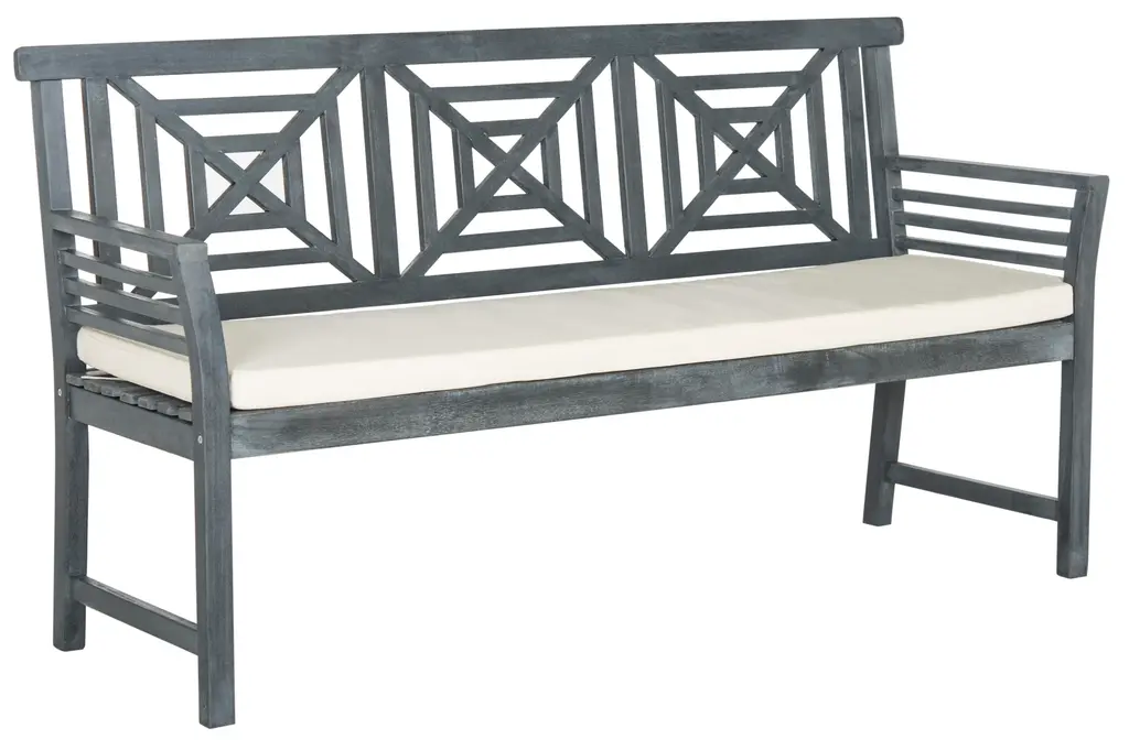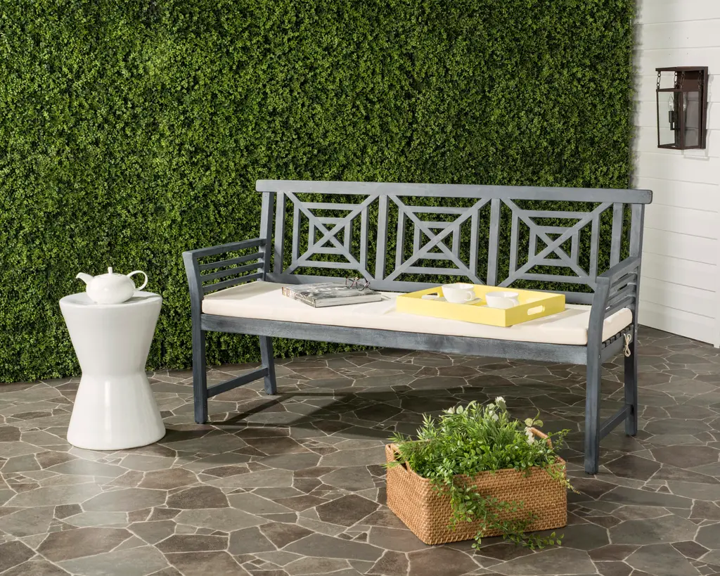 The lush tropical villas at a French Polynesian eco-resort inspired this contemporary 3 seat bench. Ideal for sipping cocktails at sunset, it's ash grey finish, plush beige cushion and silver metal detail create it's relaxed modern geometric style. Store outdoor furniture indoors or cover well when not in use. Remove wooden furniture from standing water. Dust regularly with small brush or vacuum. Spills should be taken care of immediately before they harden or stain with a slightly dampened sponge. Do not use bleach solutions. Some assembly required.