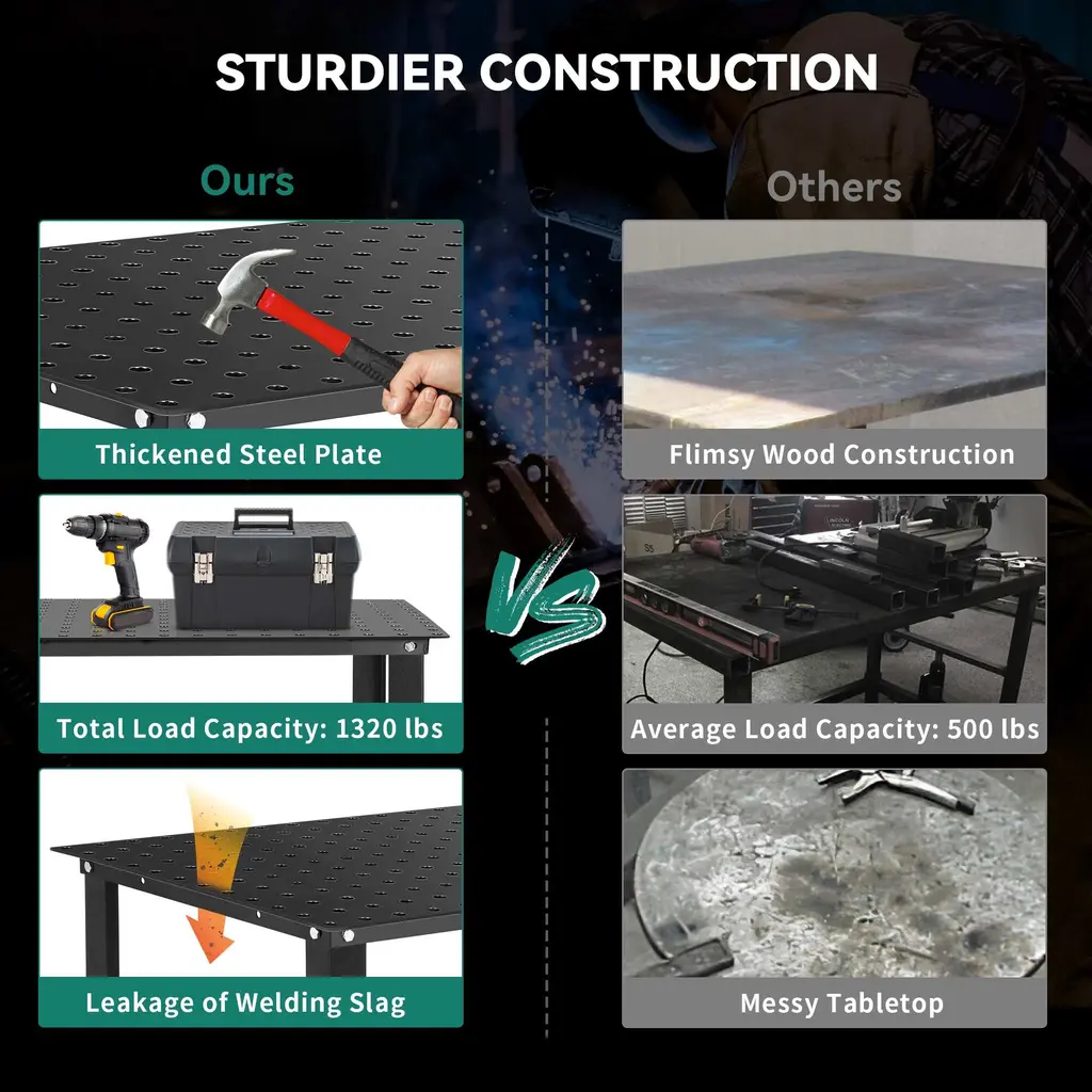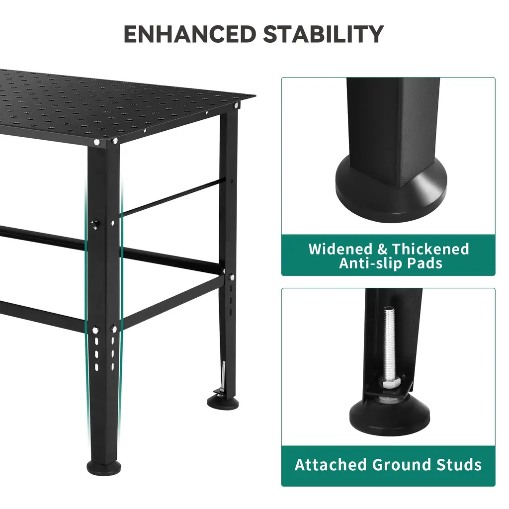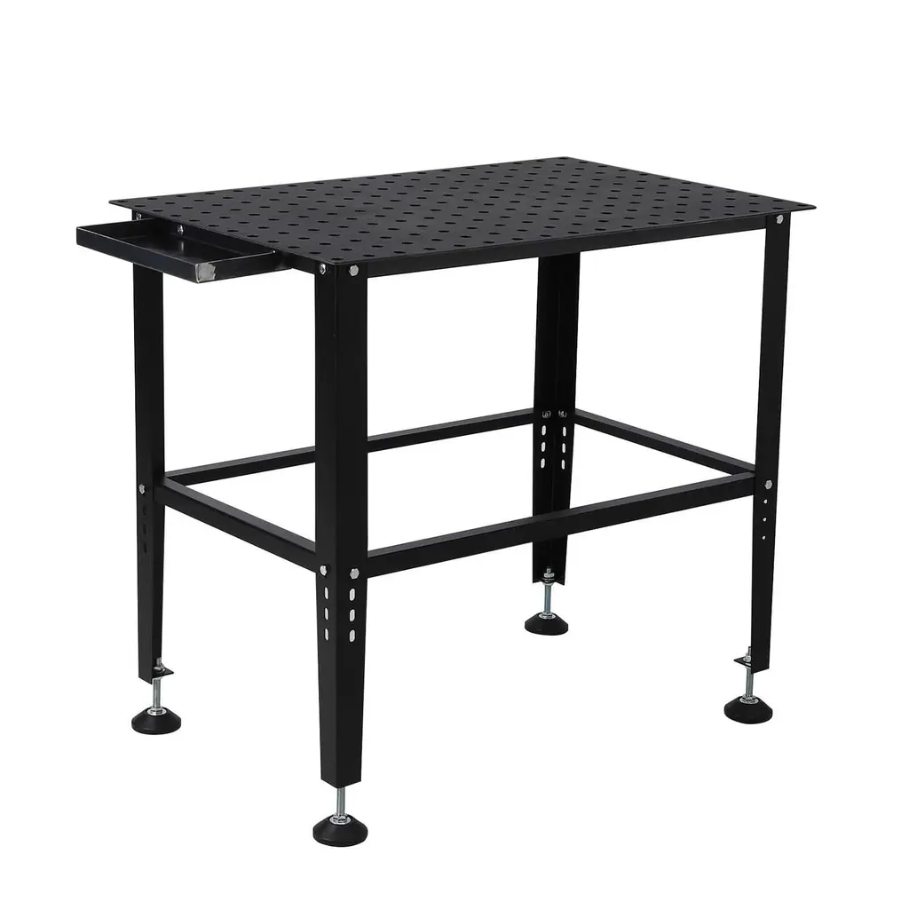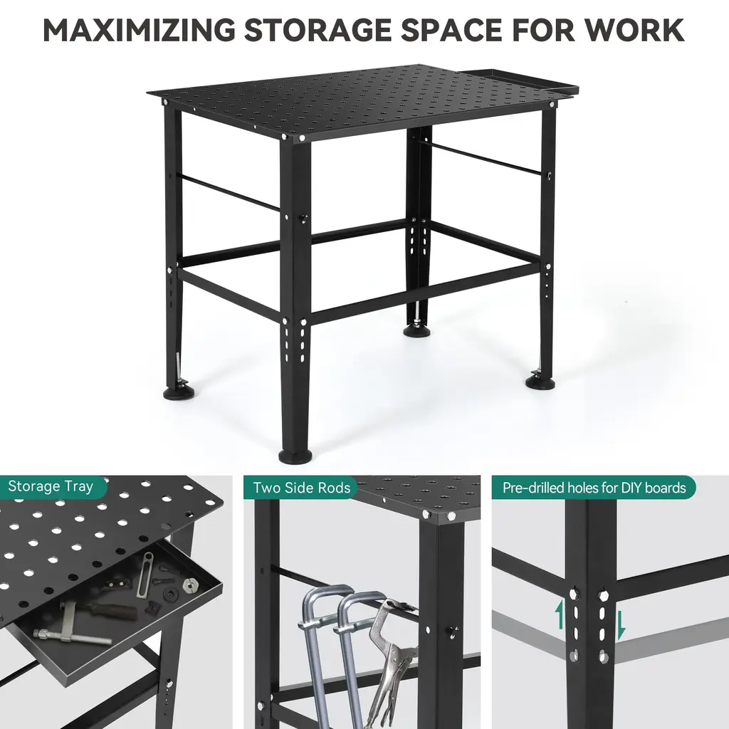 Our adjustable welding workbench is designed specifically to improve workshop efficiency and versatility. The spacious 36 inch x 24 inch desktop provides ample space for convenient placement of various tools. The steel reinforced frame is designed specifically for handling heavy tasks and can carry a weight of up to 1320 pounds. The structure is sturdy and supported by four adjustable support beams spaced 2 inches apart. Each leg is equipped with anti slip pads to ensure stability during use. The corners of the workbench are designed to be circular, avoiding unnecessary wear and scratches, and providing a safer working environment. In addition, the workbench is equipped with a 13 inch x 6 inch storage drawer for easy storage of small items. The workbench is made of 0.12-inch thick carbon steel material, which is very suitable for various automotive repair projects, providing you with a comfortable work and DIY experience. Whether it's impact, dyeing, drilling, or cutting, this industrial workbench can meet your needs. Choose our adjustable workbench and you will experience excellent products with durability, functionality, and versatility.Features: