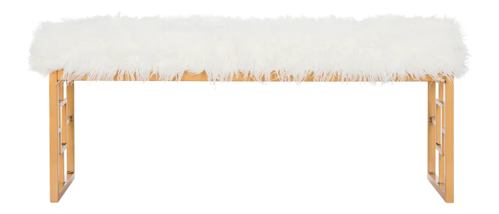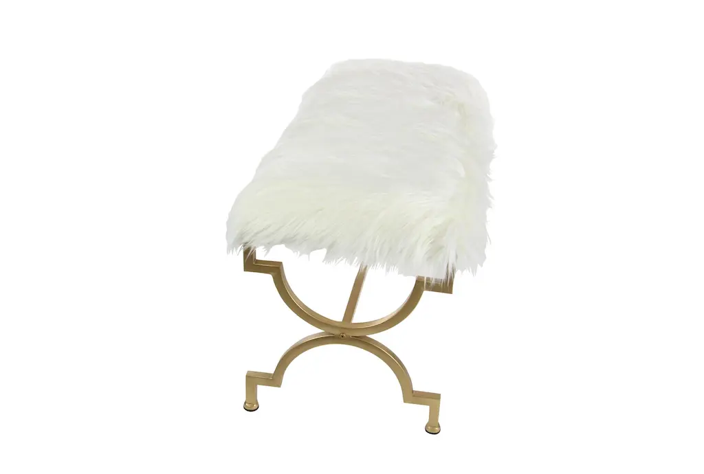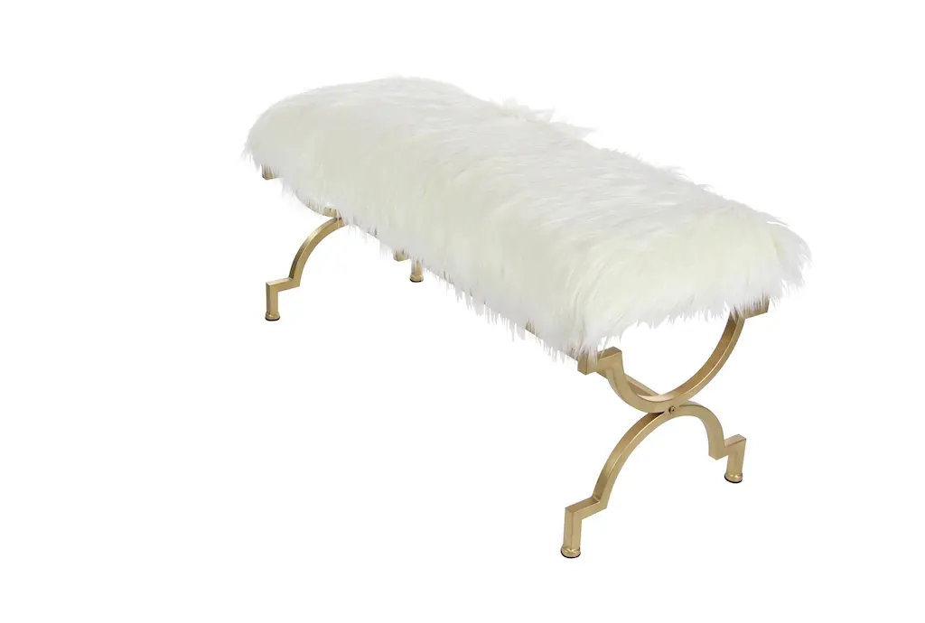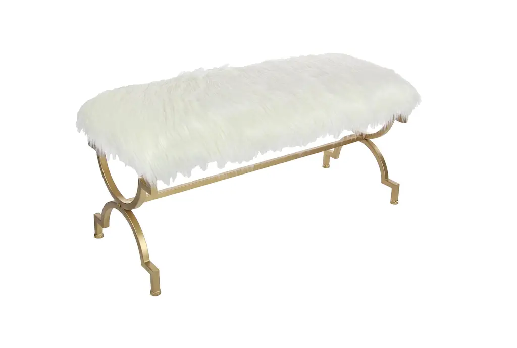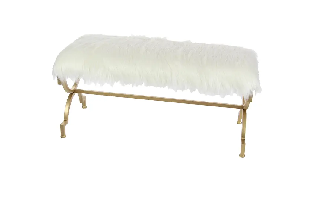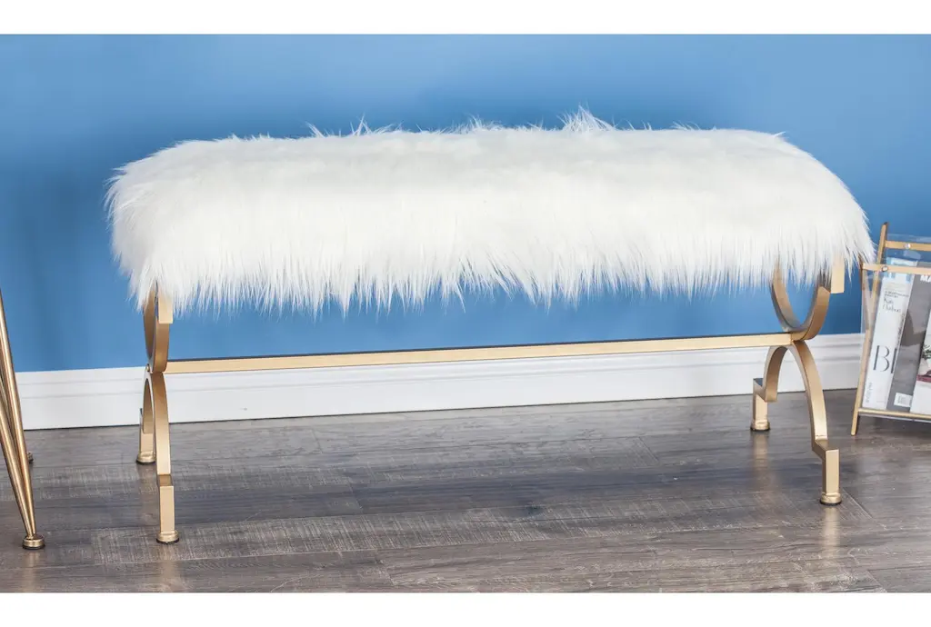 So take a load off and relax on this decorative bench. A small piece of furniture that make a big difference to give your home an instance refresh. Elegant faux fur bench carries a chic finish, making it an ideal piano chair and footstool in the living room or home office. Designed with felt or rubber stoppers at the base that prevent scratching furniture and table tops, as well as sliding around. This item ships in 1 carton. Suitable for indoor use only. Some assembly required. Maximum weight limit is 400 lbs. Can accommodate 2 people. This is a single gold colored entryway bench. Contemporary style.