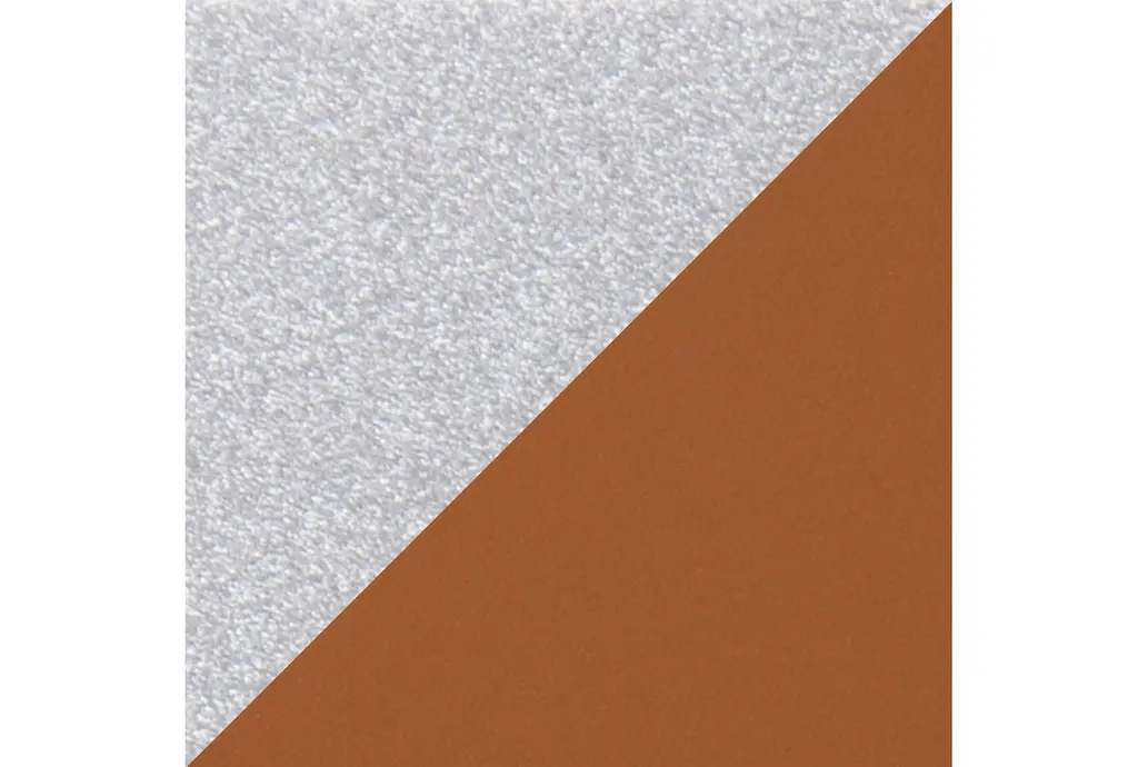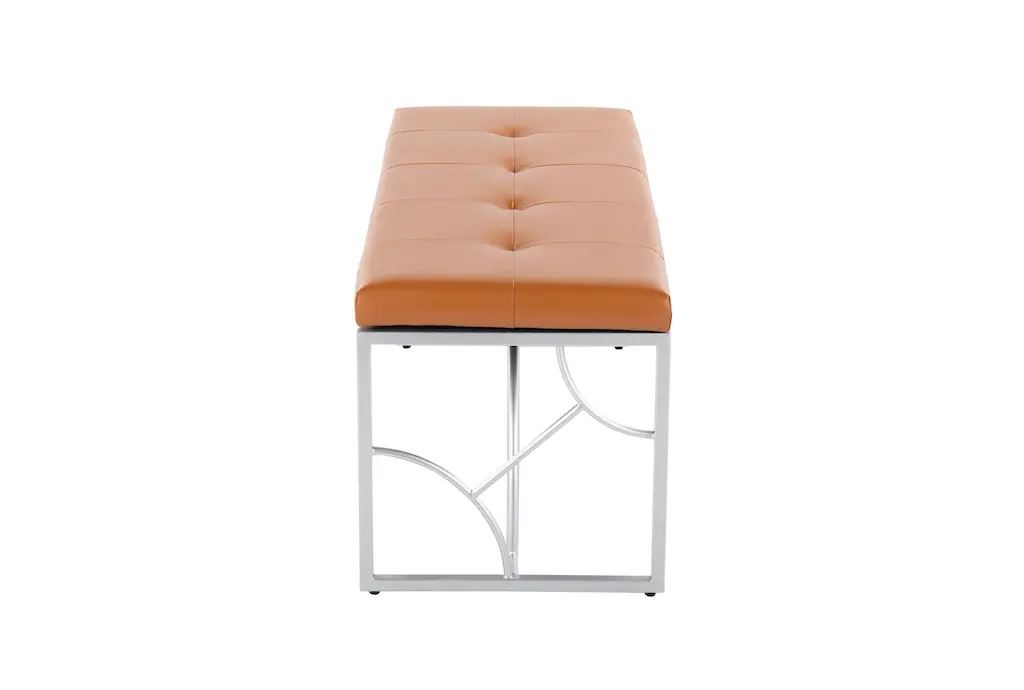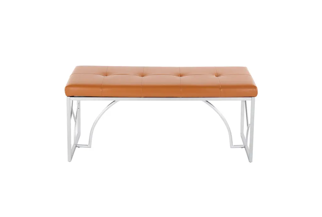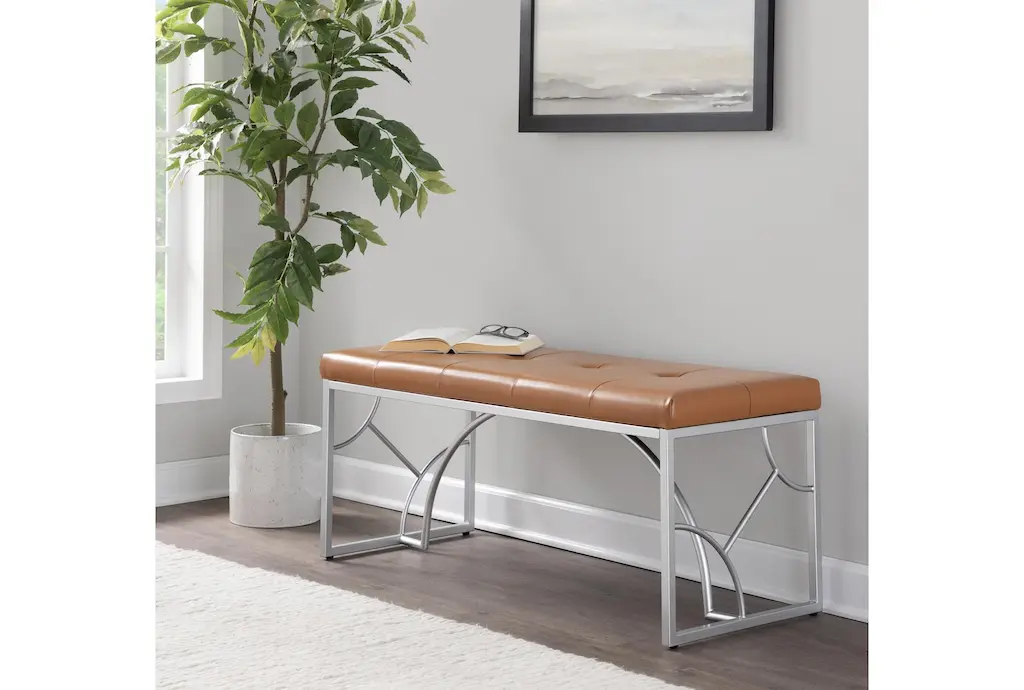 This 44" Camel Faux Leather and Silver Metal Base piece is a mid-century modern style furniture with a brown color scheme. The unique metal frame design and sleek silver finish complement the stylish faux leather upholstery, making it a standout addition to any space.