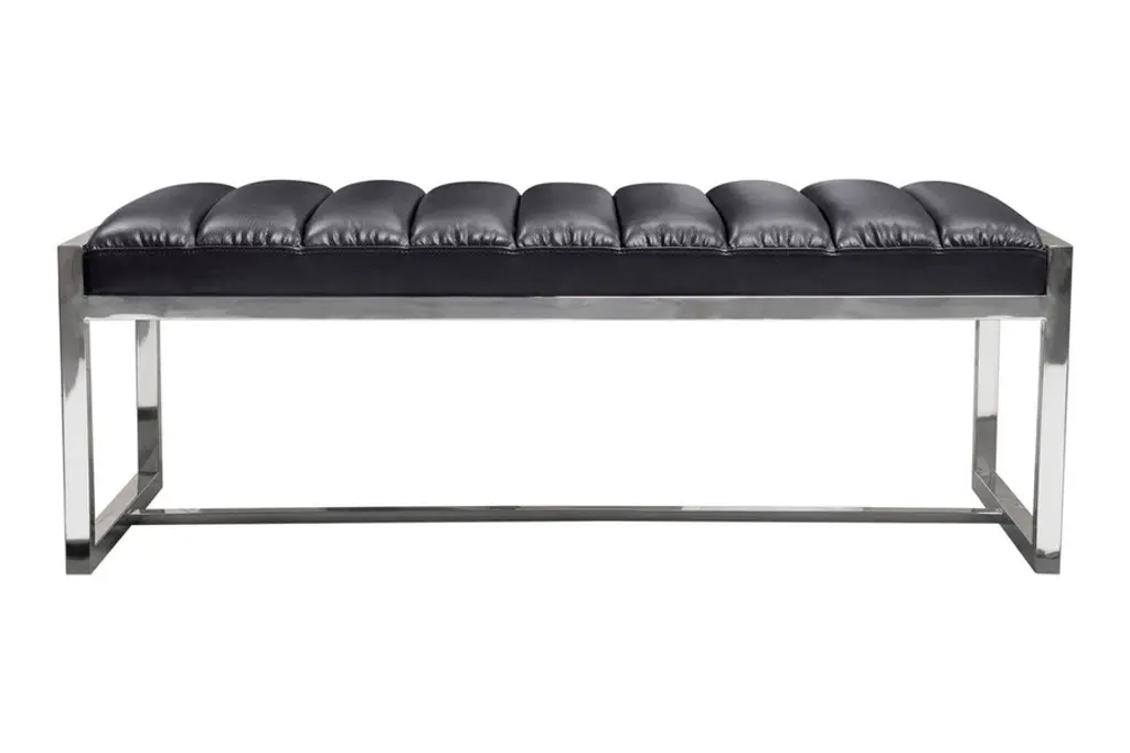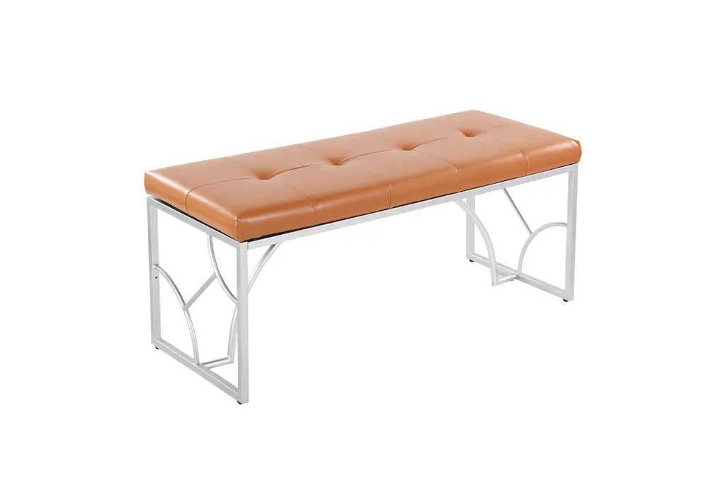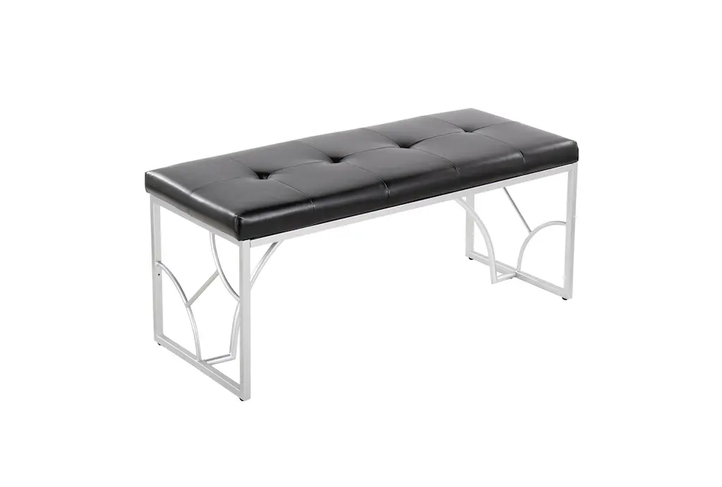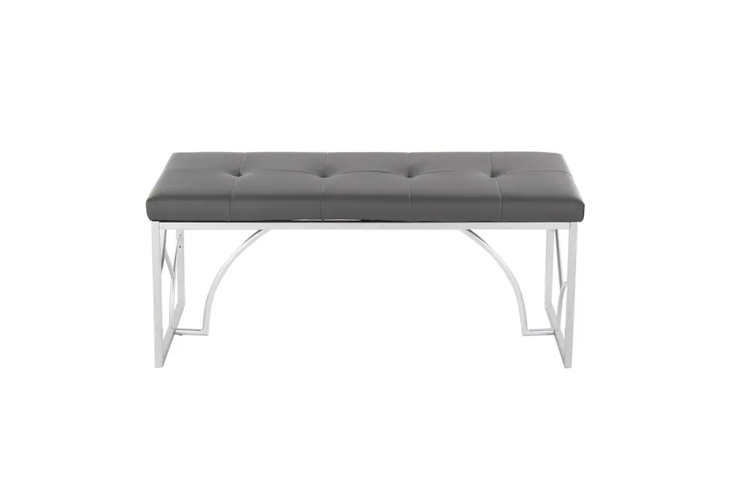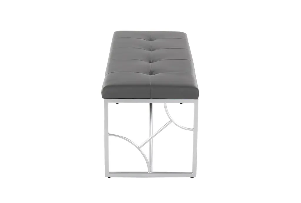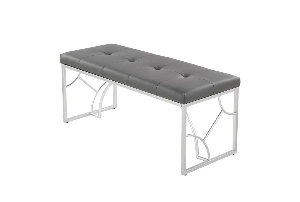 Enhance your entryway with the 44" Grey Faux Leather Bench featuring a sleek silver metal base. This mid-century modern bench is designed with tufted detailing, adding a touch of sophistication to any room. Perfect for bedrooms, living rooms, or entryways, this bench combines style and comfort effortlessly.