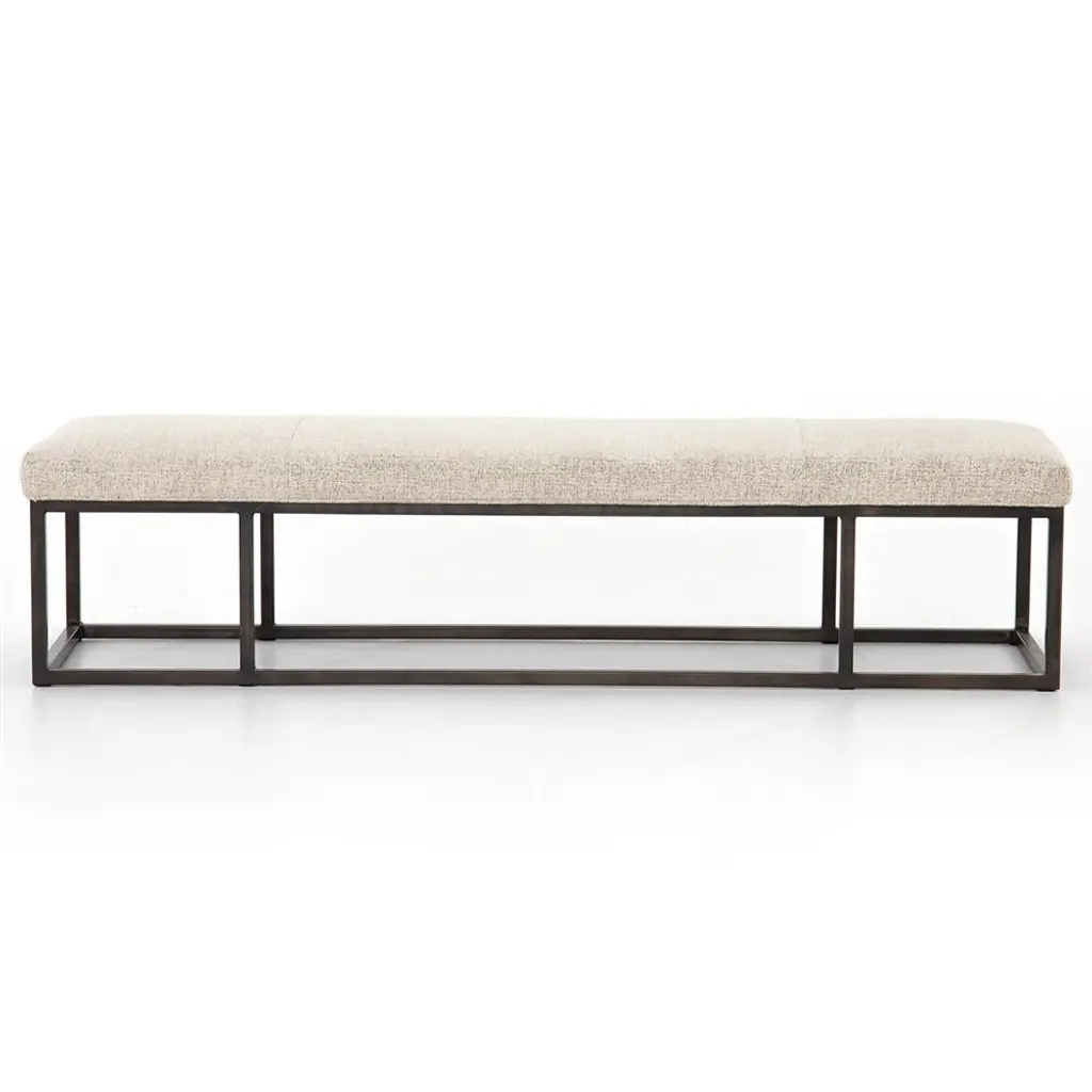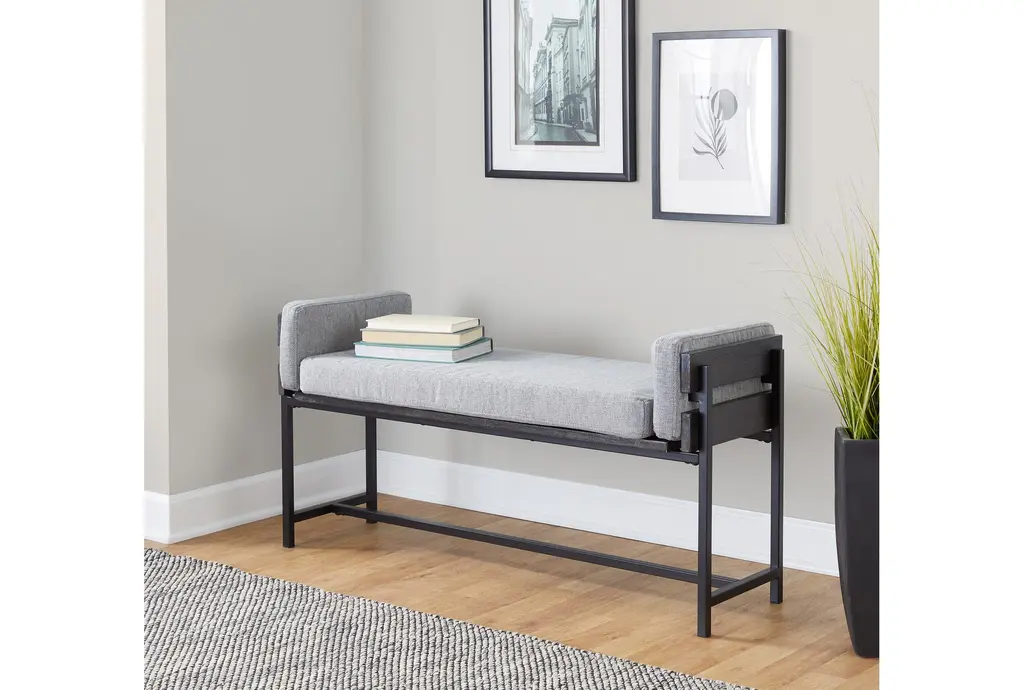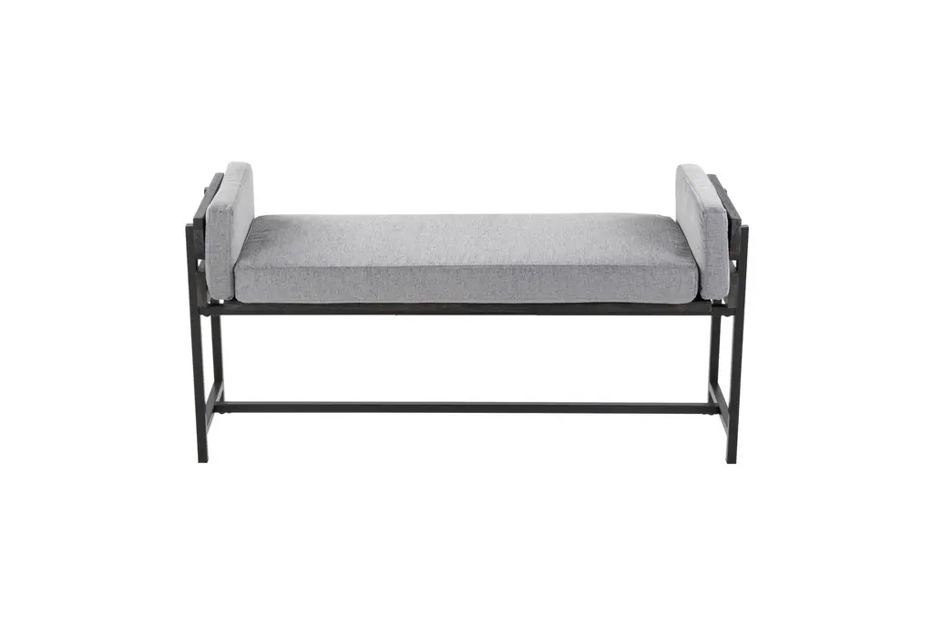 Enhance your living space with the 45" Farmhouse Bench featuring grey upholstered seating, a black frame, and black metal legs. This contemporary piece seamlessly blends with Scandinavian design elements, offering both style and comfort. Perfect for any room, its neutral grey fabric and sturdy construction make it a versatile addition to your home.
