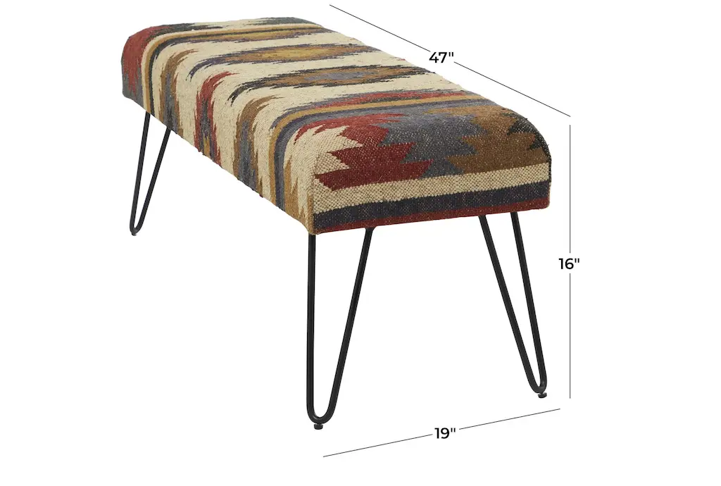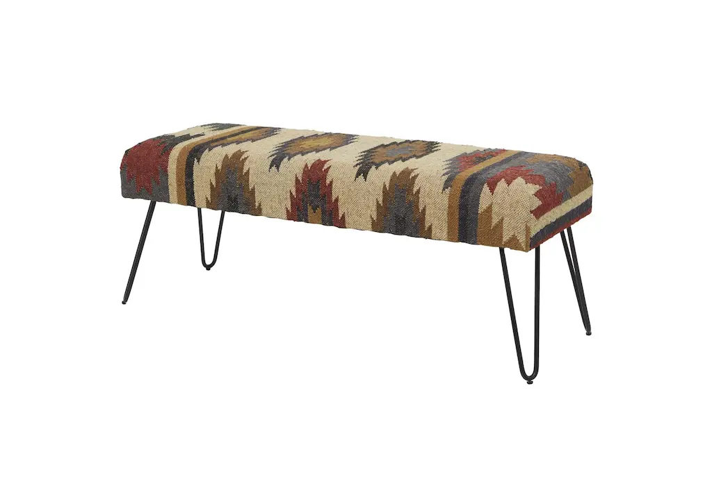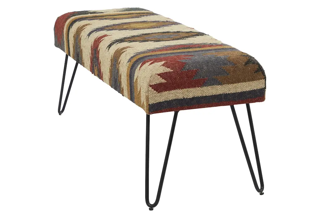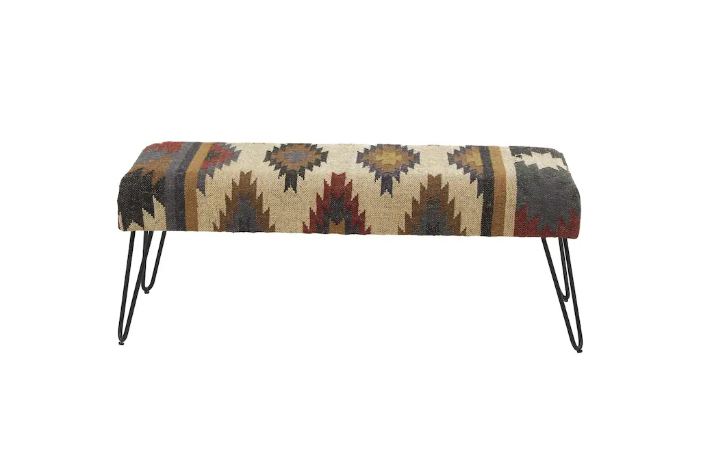A small piece of furniture that make a big difference to give your home an instance refresh. Create a balanced space in your home for a welcoming and comfortable atmosphere for you and your guests with this bench. Arrange this indoor bench on top of an area rug in your entryway or corner space, beside a tall, slender plant to complete the bohemian vibe in your home. Designed with felt or rubber stoppers at the base that prevent scratching furniture and table tops, as well as sliding around. This item ships in 1 carton. Suitable for indoor use only. This item ships fully assembled in one piece. Maximum weight limit is 250 lbs. Made in India. Can accommodate 2 people. This is a single multi colored entryway bench. Bohemian style.