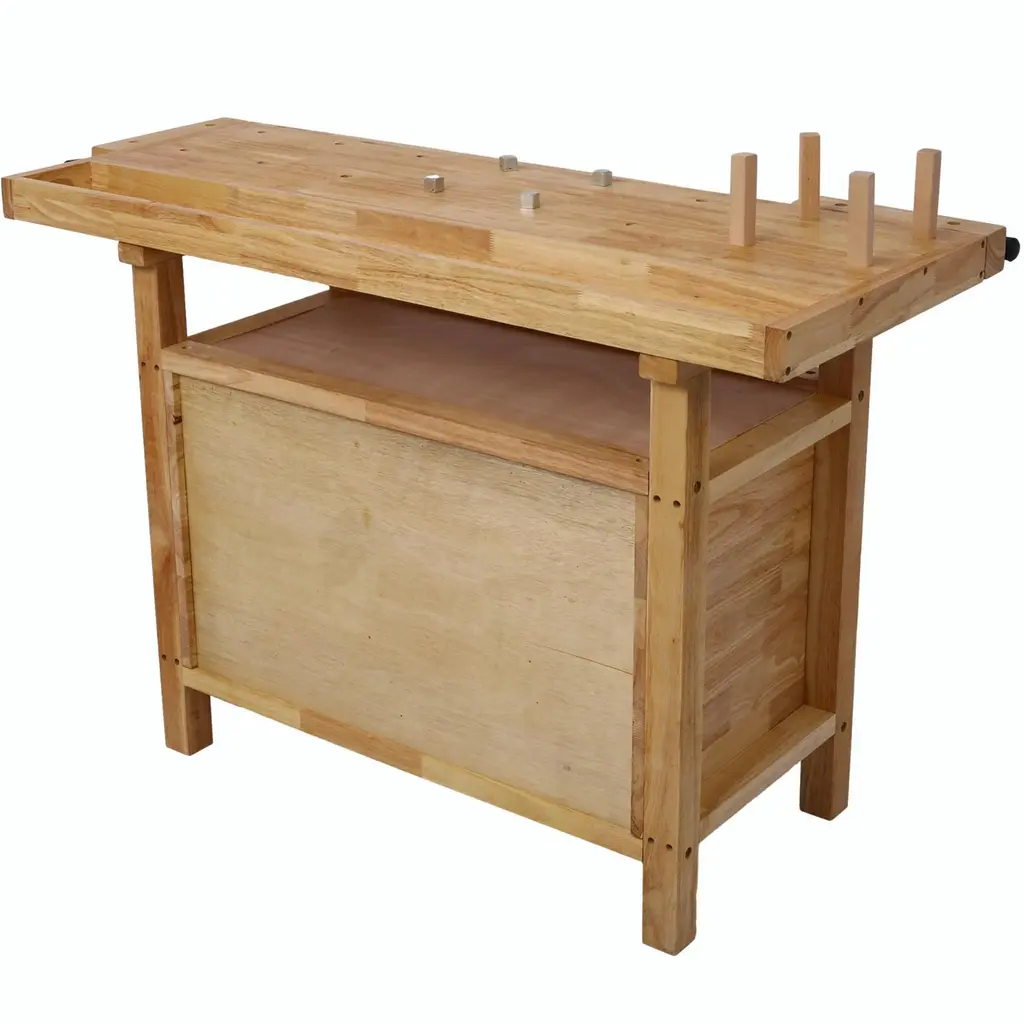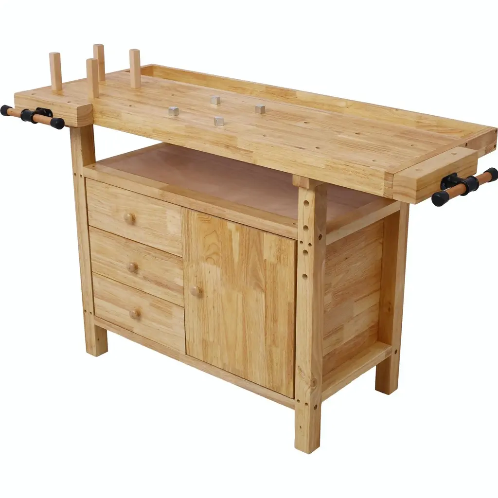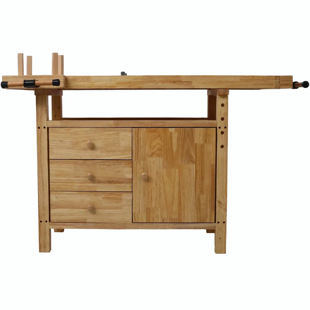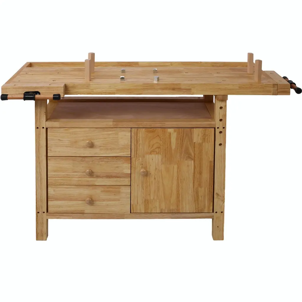 Constructed from rubberwood with four metal pillars, the workbench includes drawers, a cabinet, and metal guide pipes for a professional touch.Features: Specifications: