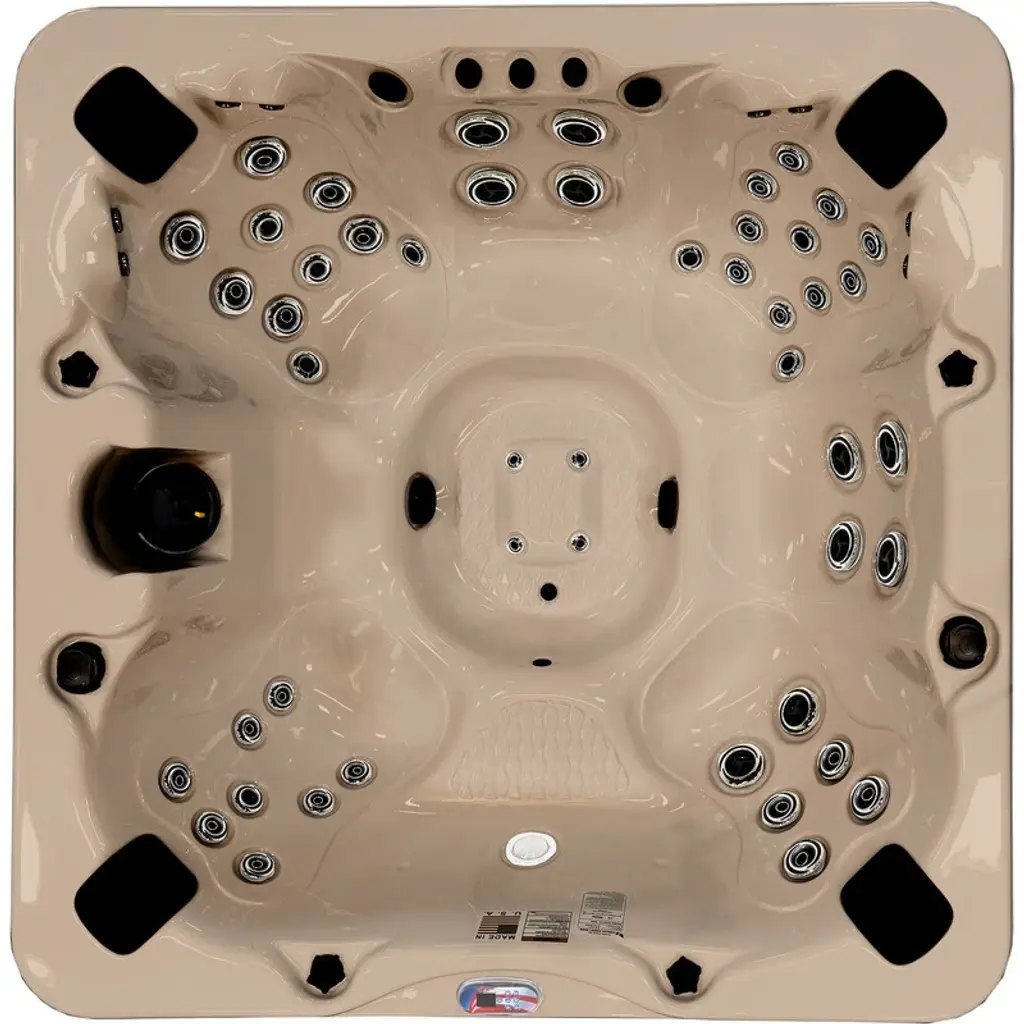 Welcome to your own private sanctuary of relaxation with the 7 Person Bench Spa by American Spas. Combining classic design, cutting-edge technology, and affordability - the AMZ756B Spa turns your backyard or patio into a private escape, while delivering a total body hydrotherapy experience unlike any other. Relax with 56 jets specially crafted to maximize the spa performance and deliver high-quality relaxation and hydrotherapy experiences. Designed to go above and beyond expectations, this American Spas tub uses Fiber Steel Construction, a patented seven-layer laminate system reinforced with steel and wood for one of the strongest shells in the industry. It's also built from the thickest acrylic layer available to keep the shell strong at critical stress points and has the highest resin-to-fiberglass mixture for added durability and performance. This spa includes a built-in wireless Bluetooth sound system that allows you control your music through a smart device from anywhere inside or outside your hot tub. Designed to meet strict standards in efficiency, insulation and sanitation, this spa uses smart technology to run efficiently and use less energy. A premium Hydro-Armor tapered spa cover provides the final layer of insulation and protection. Energy-efficient and rated to withstand 1,500 UV-hours of protection to prevent cracking, splitting or fading. This breathtaking spa has been designed to fit perfectly in any patio and blend with any backyard landscape.