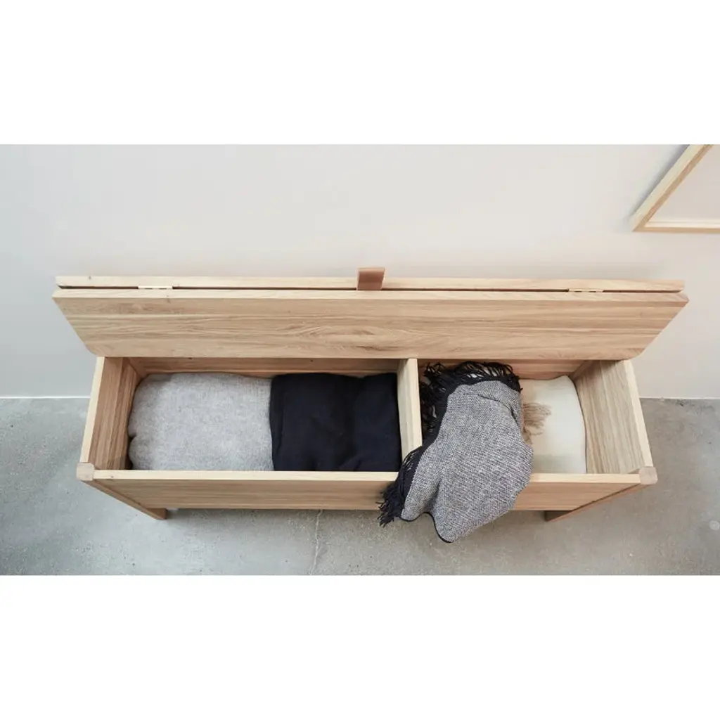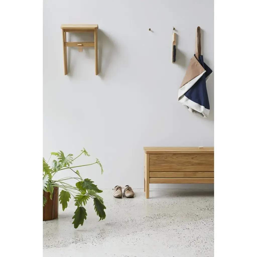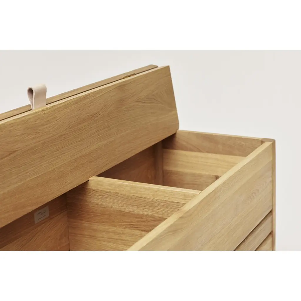 Form & Refine's A Line stowaway bench is constructed from solid oak and finished with a leather handle on the cover. When opened, the cover folds neatly behind the bench, revealing the two storage compartments inside. The compartments can be used, for example, for storing shoes and accessories in the hallway, bedding in the bedroom or supplies in the office. The bench can fit three persons. Form & Refine’s A Line collection pays respect to Danish woodworking traditions with its solid wood furniture, organic expression and timeless elegance. Designed by Herman Studio and manufactured in Europe, the A Line collection brings functional, contemporary Danish design to homes of all styles.