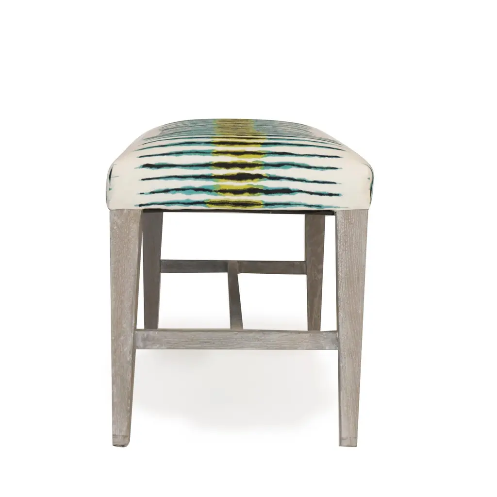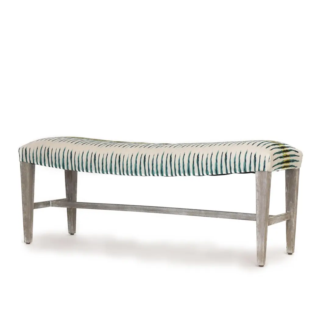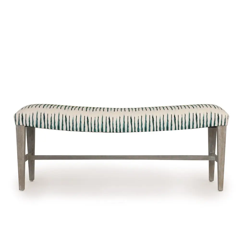 Our customizable accent bench features a bowed seat to provide ultimate comfort. Poplar wood with Swedish finish covered in striped Romo fabric. Measurements: 20" H x 47" W x 16.5" D.