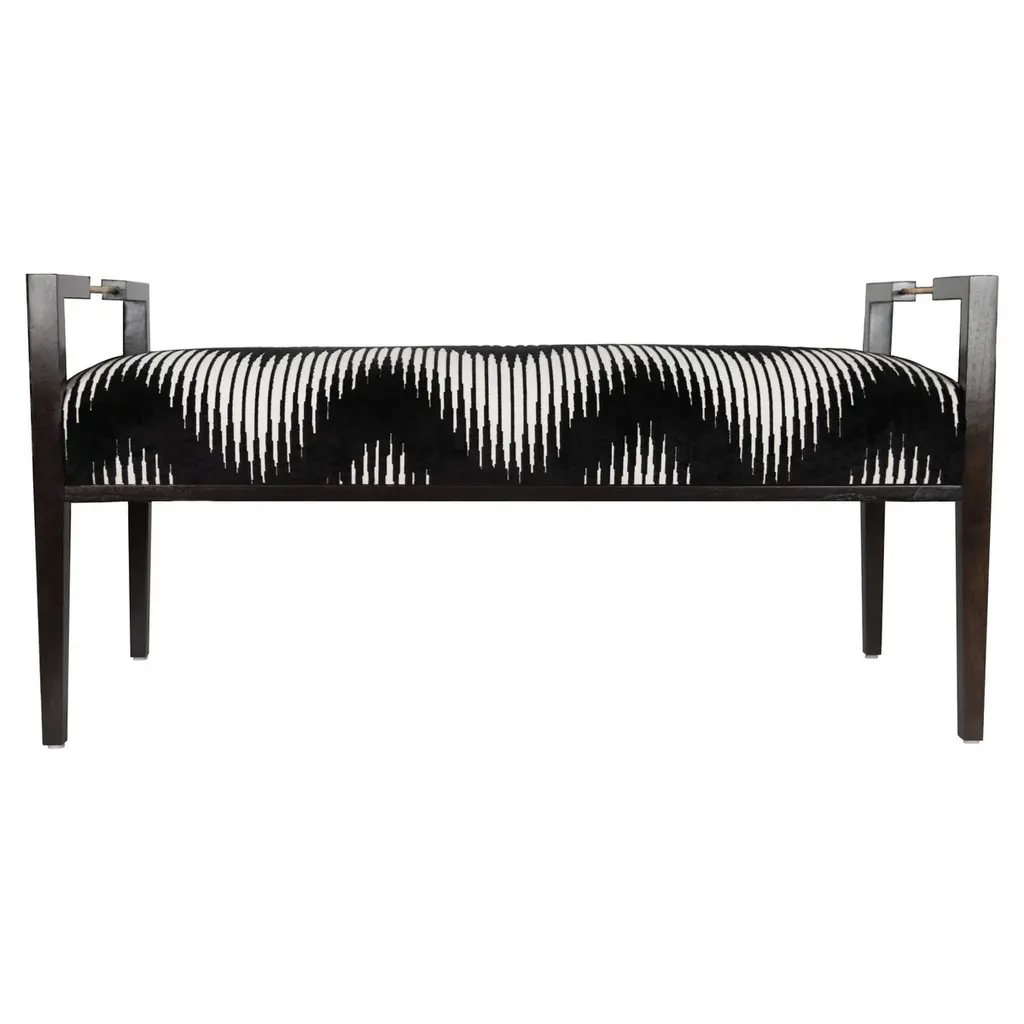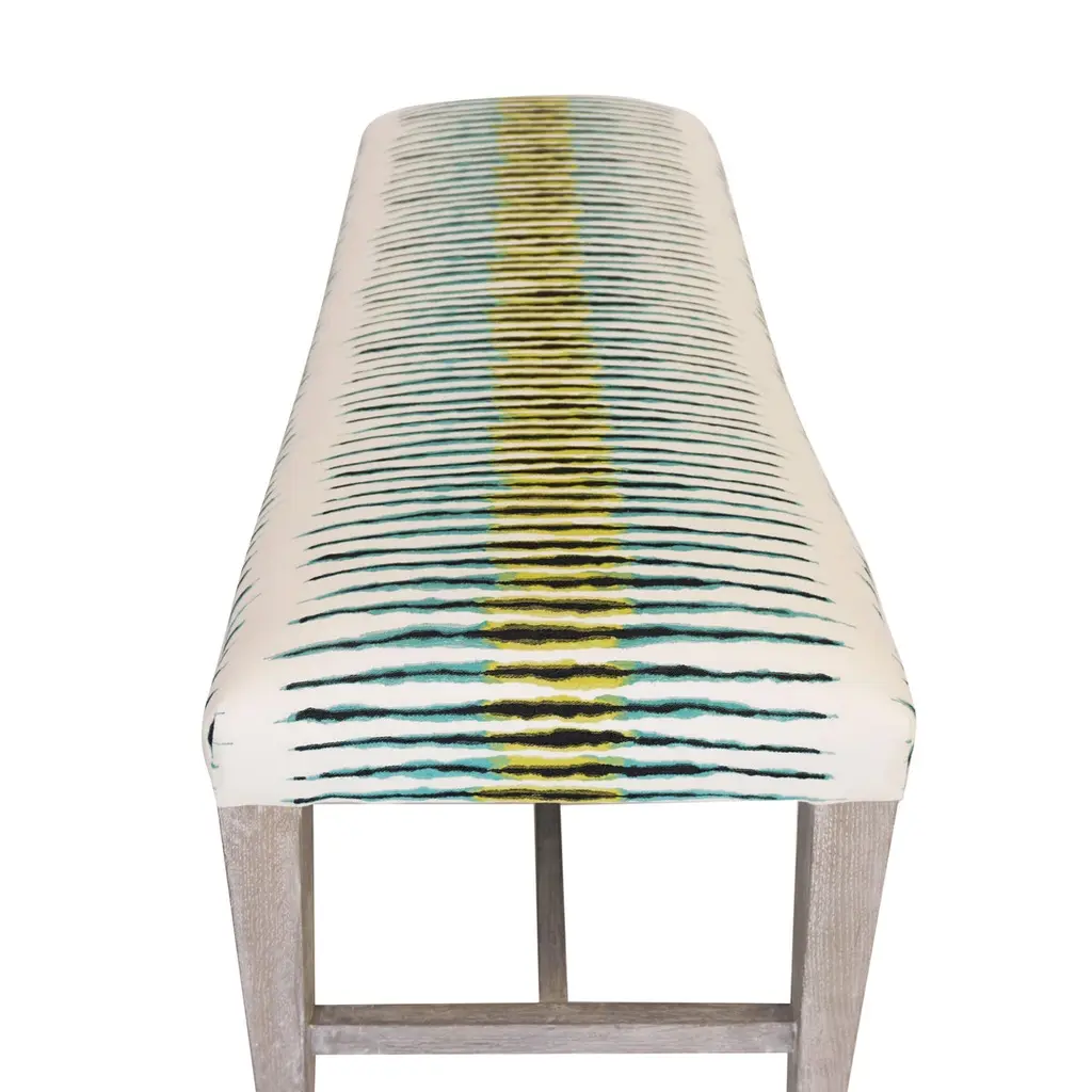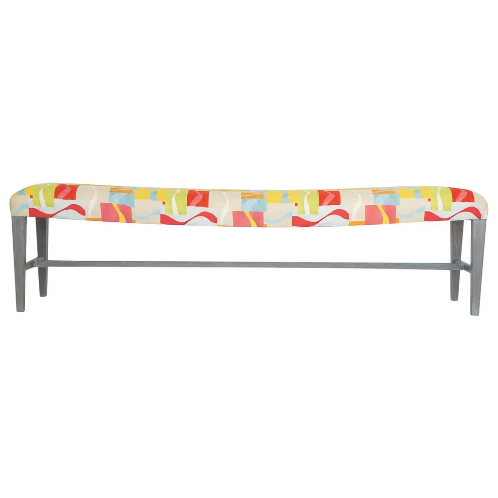 Our customizable accent bench features a bowed seat to provide ultimate comfort. Poplar wood with Swedish finish covered in striped Romo fabric. Measurements: 20" H x 47" W x 16.5" D.
