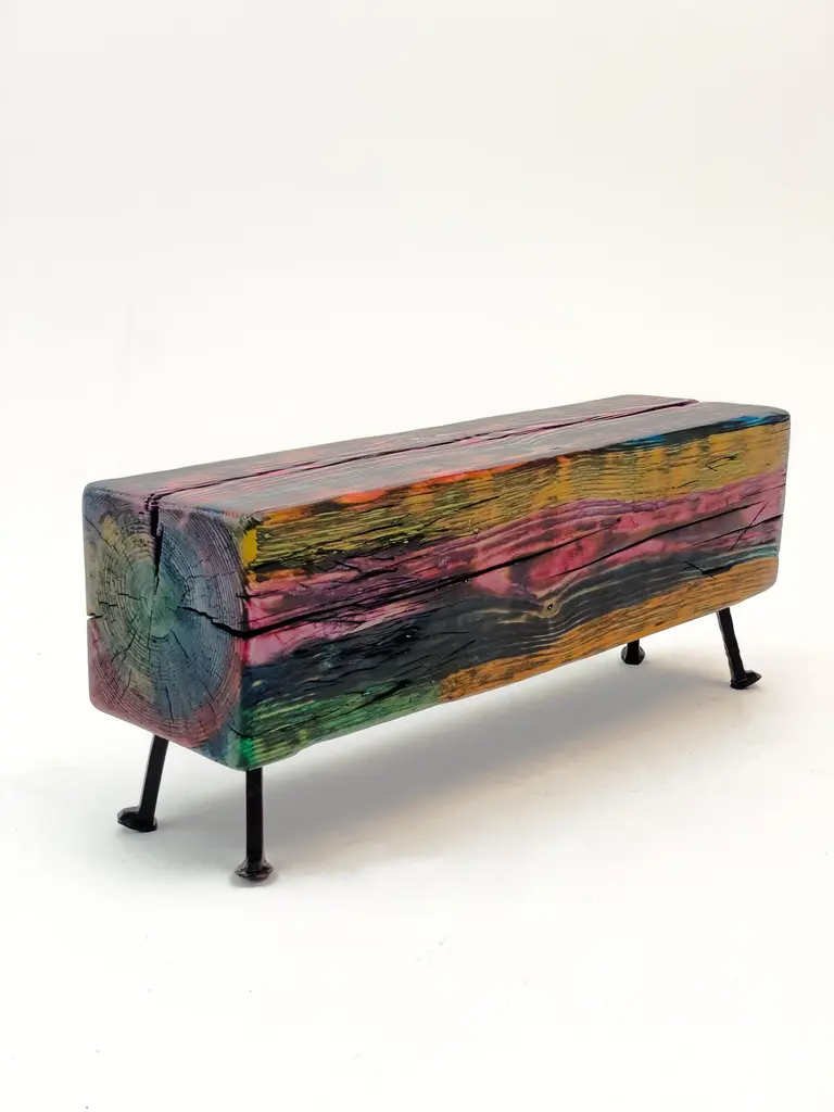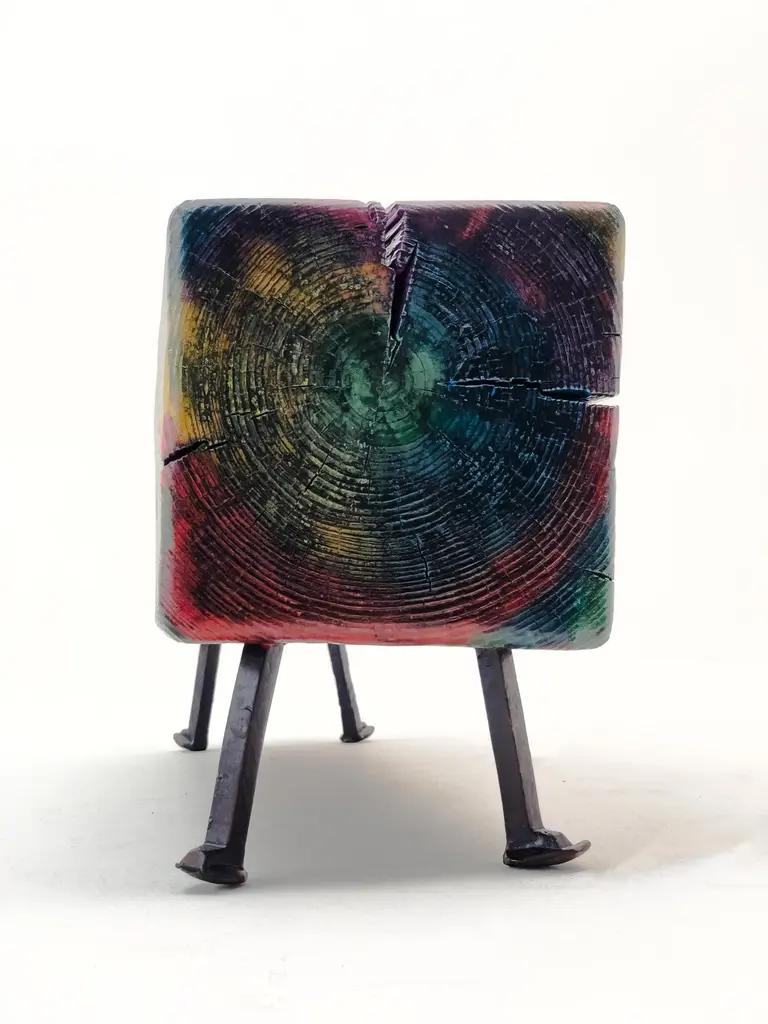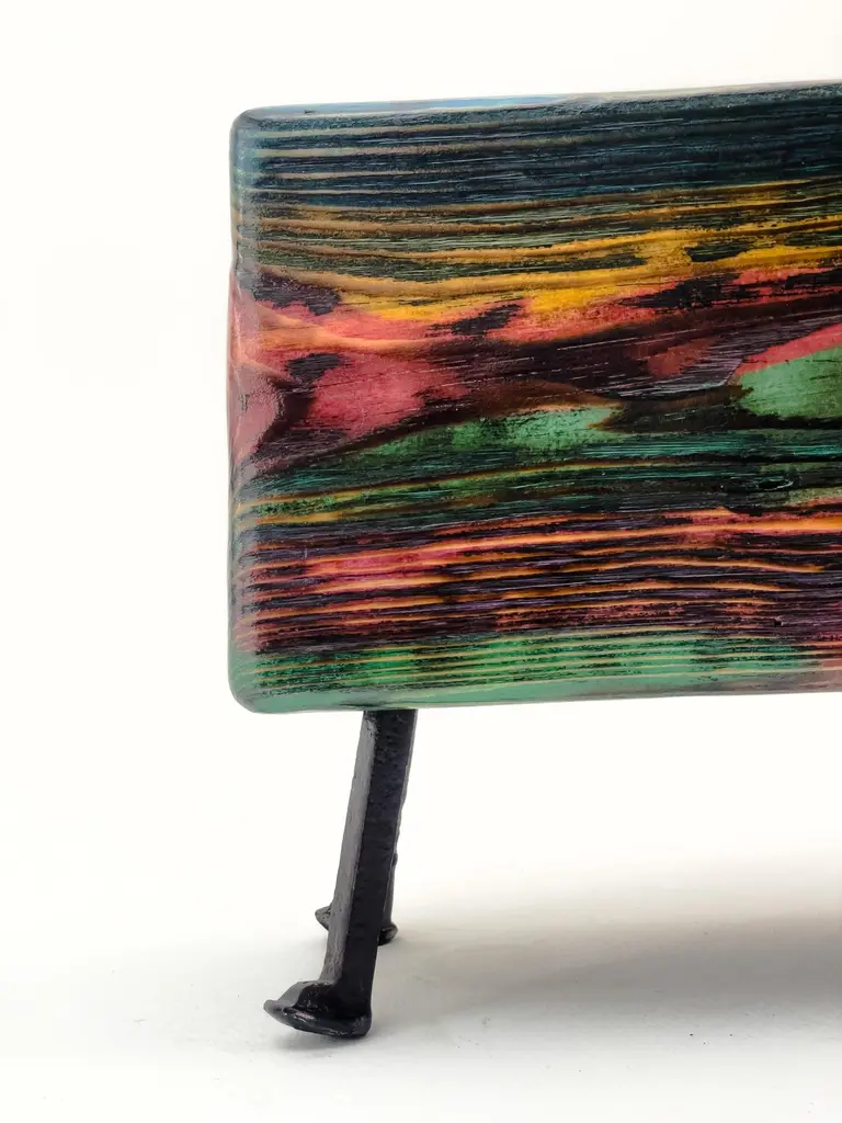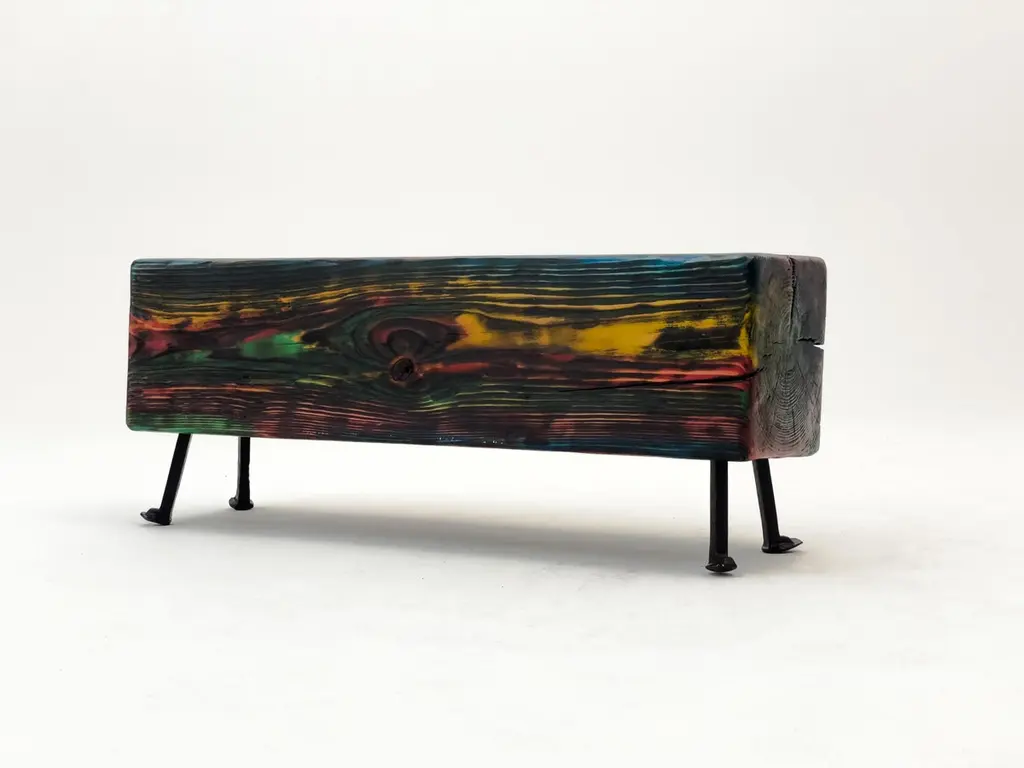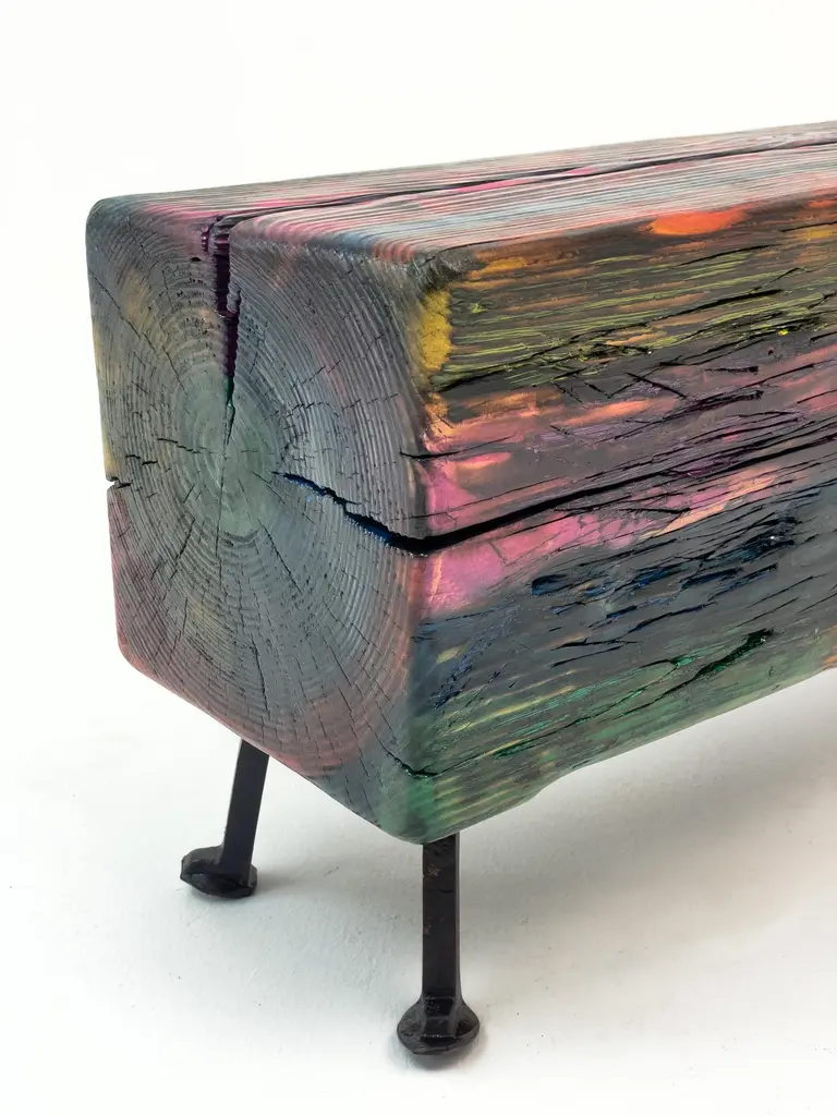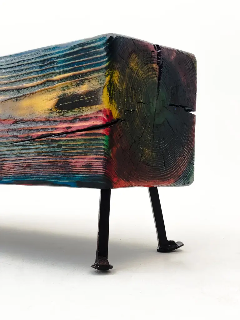 Acid Spale Bench by Twenty Second FactoryDimensions: D 24 x W 89 x H 37 cmMaterials: Wood, metal.The Acid "Spale" Bench, is a unique piece crafted from reclaimed railroad ties in soviet industrial surroundings. This bench showcases the inherent character of aged ties, accentuated by an acid multicolored oil paint finish. Its individuality stems from the distinct nature of the reclaimed materials, making each bench a one-of-a-kind addition to any space, blending industrial aesthetics with sustainability principles.Founded in 2017 by Bogdan Kryvosheya, a creative director from Kyiv, 22F (Twenty-Second Factory) is dedicated to bringing innovative art, design, and decor solutions to life. Based in Kyiv, Ukraine, we extend our services both locally and globally, offering a full spectrum of creative production services from the initial idea to shipping and assembly on location.At 22F, we care deeply about the aesthetics of each project stage and provide an individual approach to every client. Honesty and flexibility are at the core of our values, ensuring that each detail of a project is meticulously attended to. Our work is people-centric, and client relationships are paramount to us. We thrive on artistic and creative projects but are equally adept at handling technical work based on client needs.