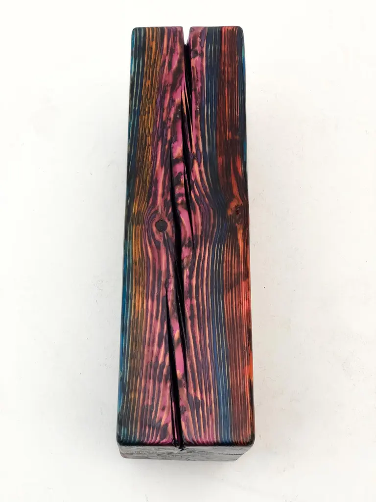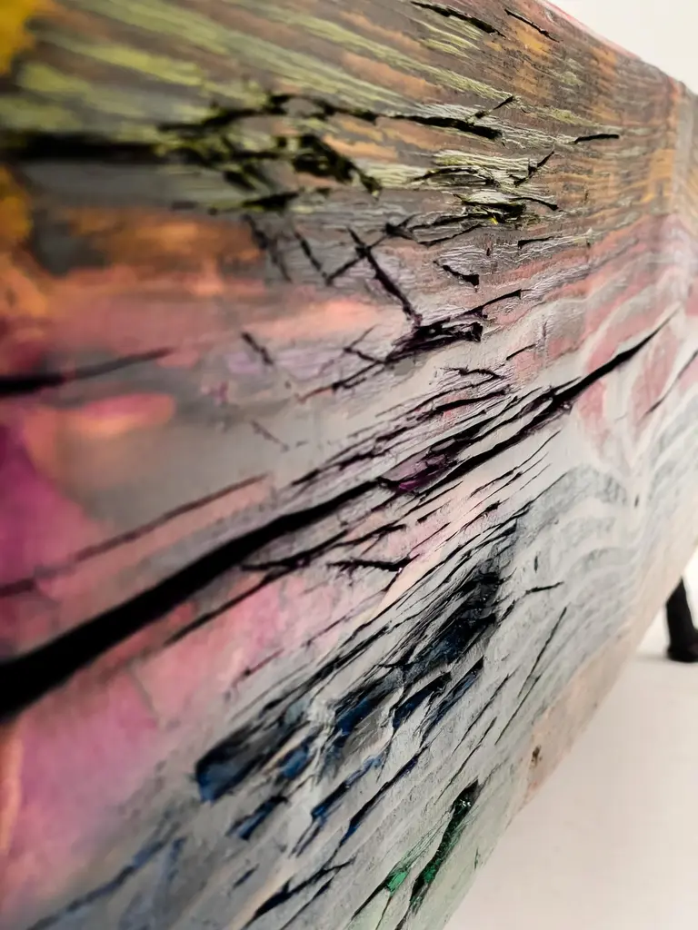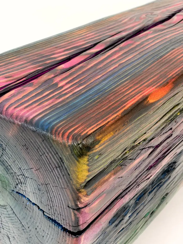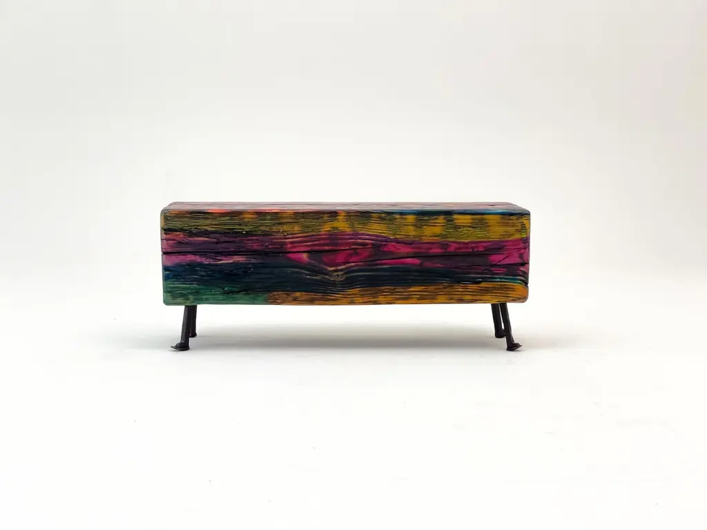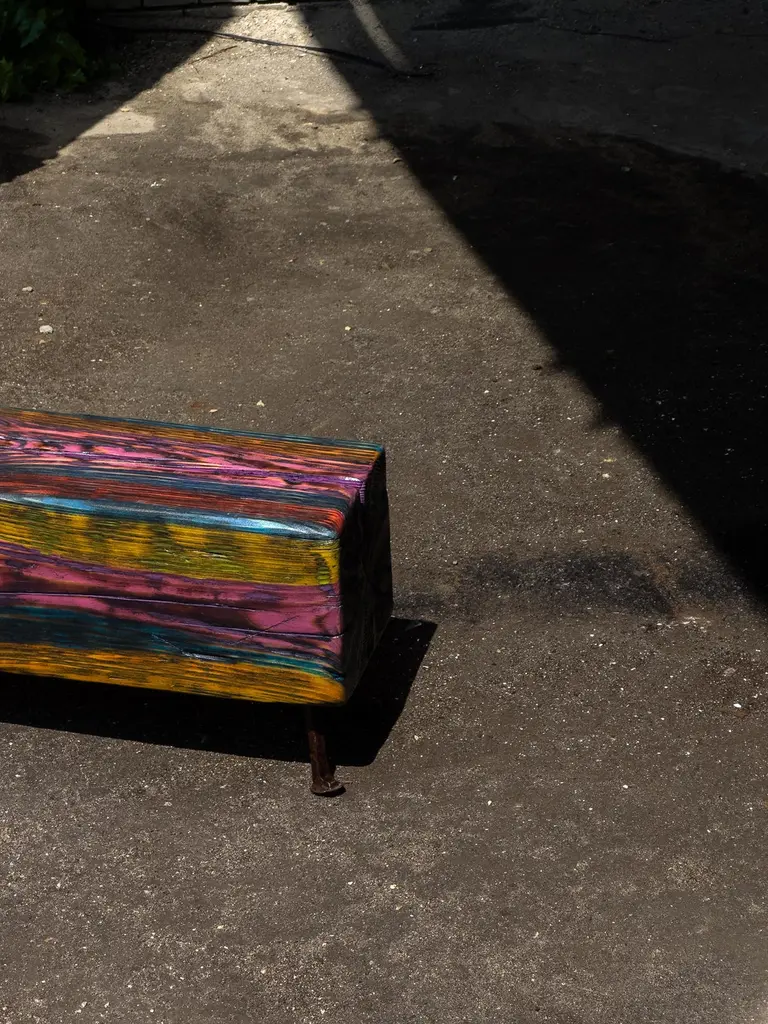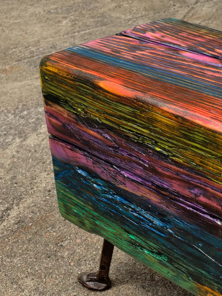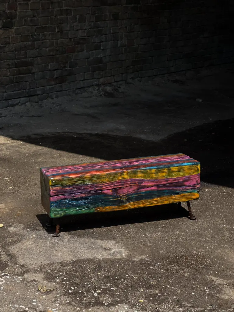 Acid Spale Bench by Twenty Second FactoryDimensions: D 24 x W 89 x H 37 cmMaterials: Wood, metal.The Acid "Spale" Bench, is a unique piece crafted from reclaimed railroad ties in soviet industrial surroundings. This bench showcases the inherent character of aged ties, accentuated by an acid multicolored oil paint finish. Its individuality stems from the distinct nature of the reclaimed materials, making each bench a one-of-a-kind addition to any space, blending industrial aesthetics with sustainability principles.Founded in 2017 by Bogdan Kryvosheya, a creative director from Kyiv, 22F (Twenty-Second Factory) is dedicated to bringing innovative art, design, and decor solutions to life. Based in Kyiv, Ukraine, we extend our services both locally and globally, offering a full spectrum of creative production services from the initial idea to shipping and assembly on location.At 22F, we care deeply about the aesthetics of each project stage and provide an individual approach to every client. Honesty and flexibility are at the core of our values, ensuring that each detail of a project is meticulously attended to. Our work is people-centric, and client relationships are paramount to us. We thrive on artistic and creative projects but are equally adept at handling technical work based on client needs.