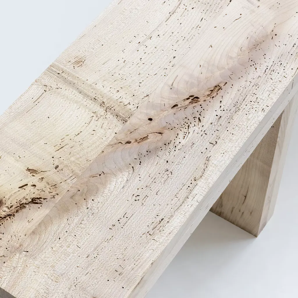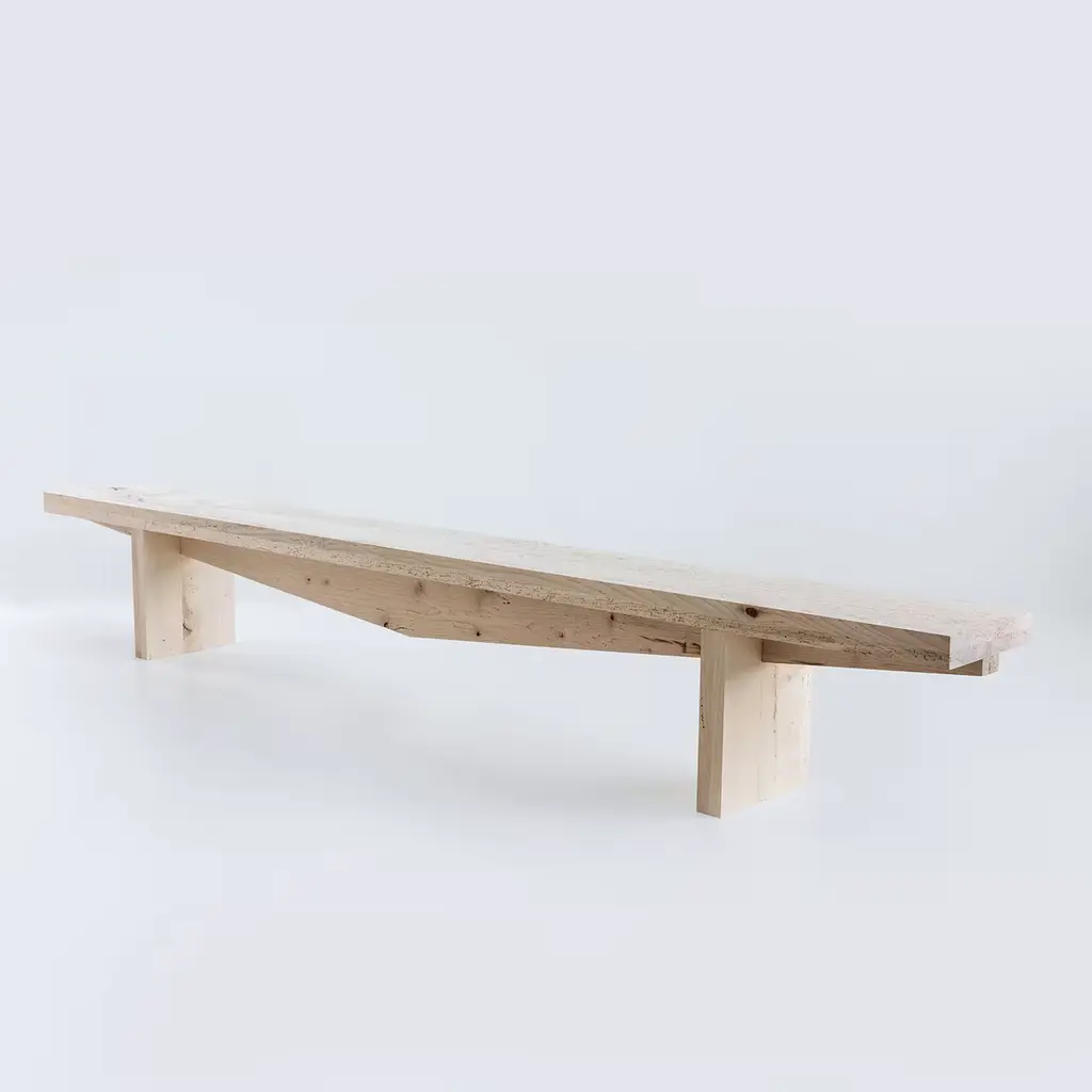 This oversize bench, made of recovered solid maple wood, is part of the collection "La stanza delle Necessità". The double-winged rib positioned under the seat ensures the right statics for a seat that can accommodate a certain number of people for generous hospitality. This piece is hand-made with natural material the final effect could be different from the picture.
