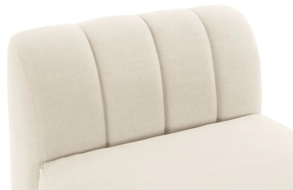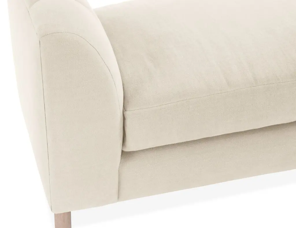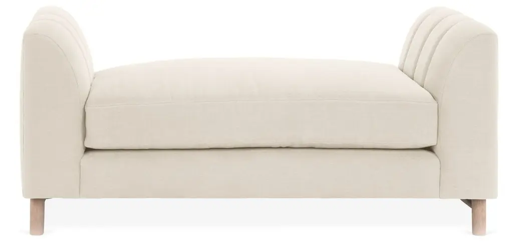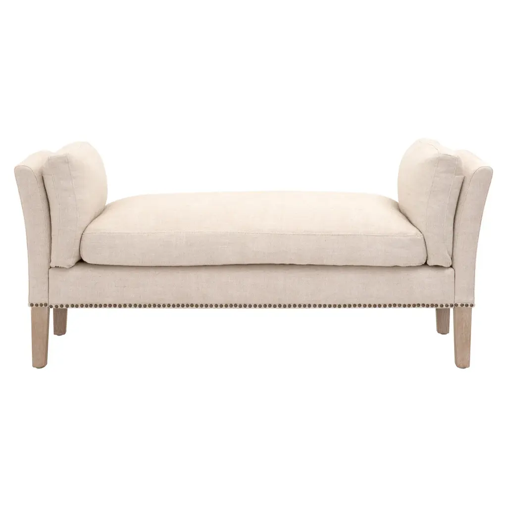 Designed by us and available only at One Kings Lane: Detailed with quilted channeling and mocha-finished alder legs, this bench lends a modern mood to any space. Its white linen upholstery is filled with foam and bolstered to a sturdy alder frame for long-lasting comfort and support. Made in the USA.