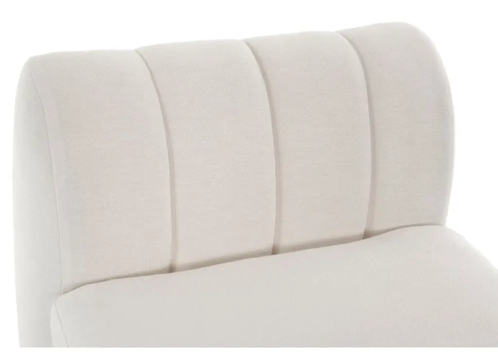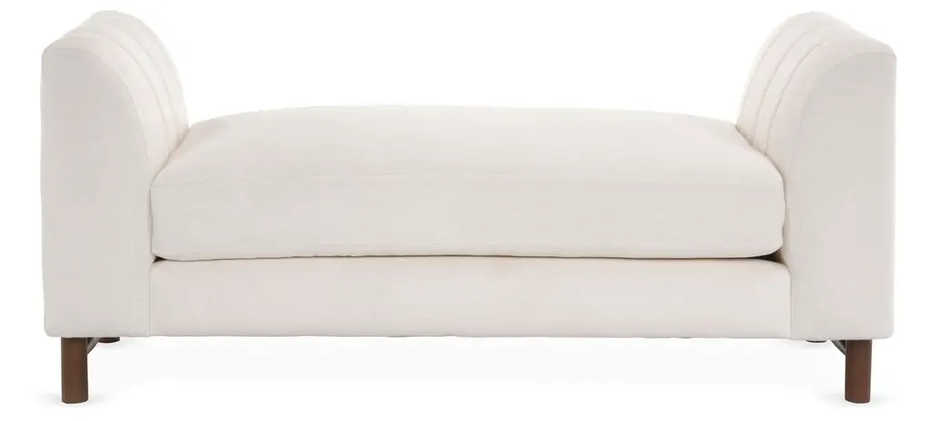 Designed by us and available only at One Kings Lane: Detailed with quilted channeling and mocha-finished alder legs, this bench lends a modern mood to any space. Its white linen upholstery is filled with foam and bolstered to a sturdy alder frame for long-lasting comfort and support. Made in the USA.