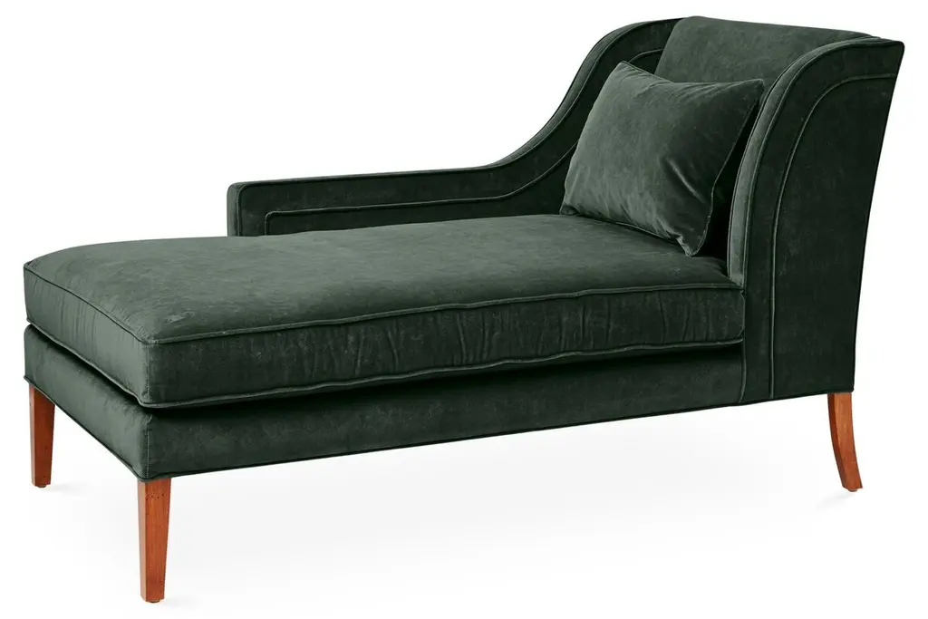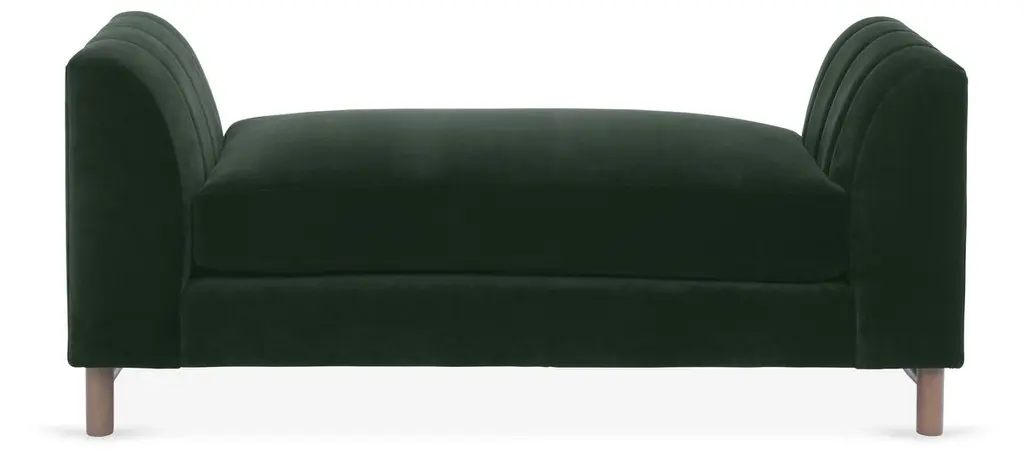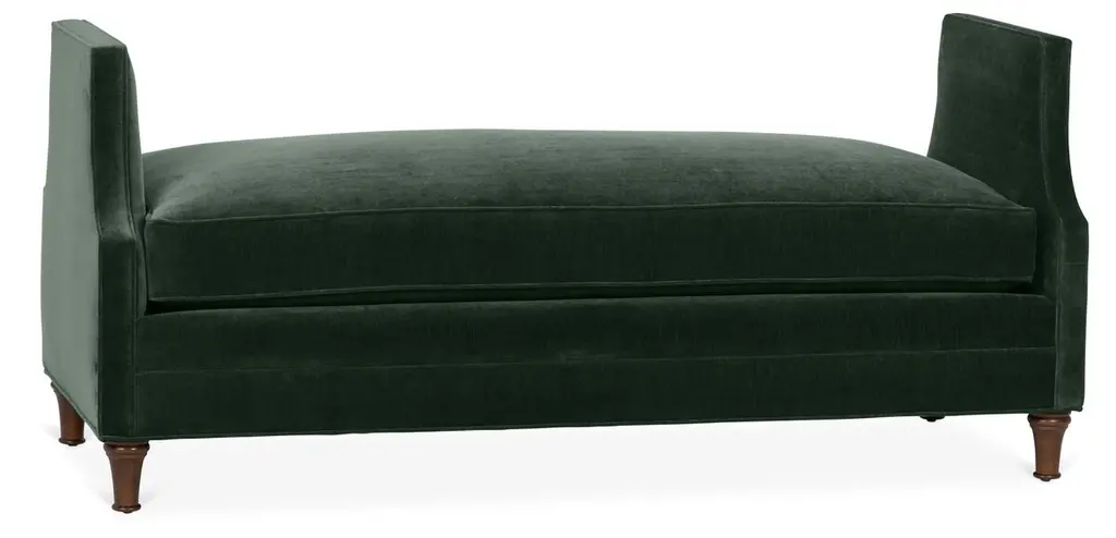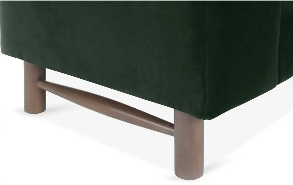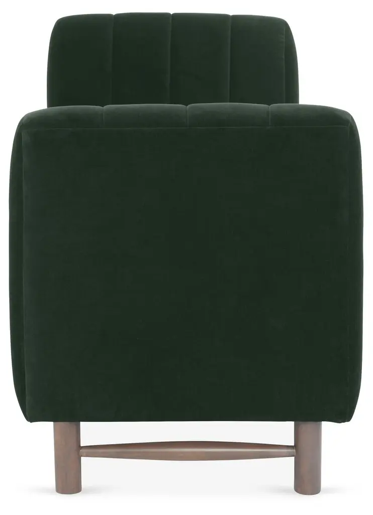 Designed by us and available only at One Kings Lane: Detailed with quilted channeling and mocha-finished alder legs, this bench lends a modern mood to any space. Its plush navy velvet upholstery is filled with foam and bolstered to a sturdy alder frame for long-lasting comfort and support. Made in the USA.