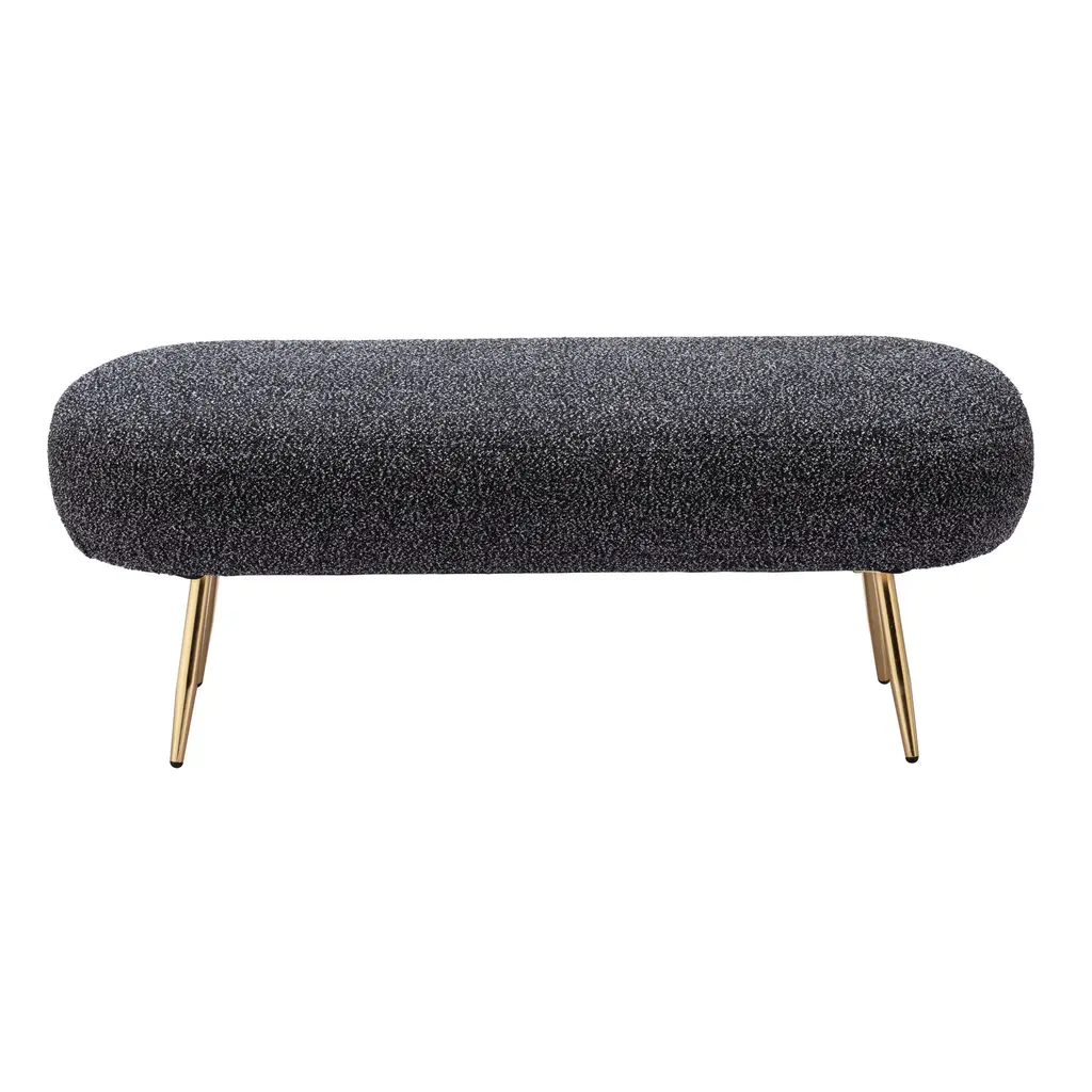 The rounded Alec entry bench is upholstered in beautifully speckled black velvet that highlights its cozy, textural charm. Splayed and tapered gold-steel legs complement the sumptuous neutral upholstery, elevating the oval seat with a sophisticated touch of mid-century glam. Blending a space-saving modern silhouette with inviting contemporary curves, this versatile accent bench harmonizes with a wide range of decor.