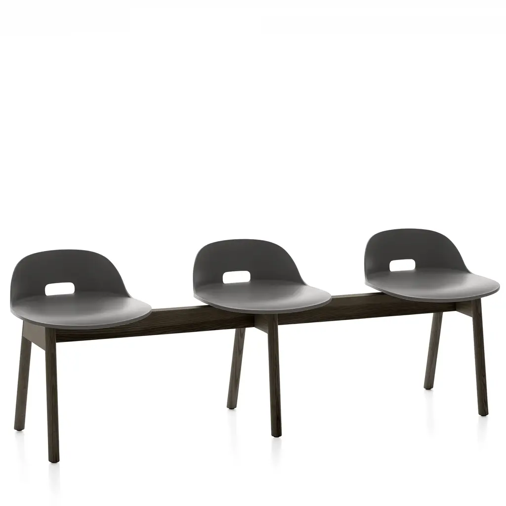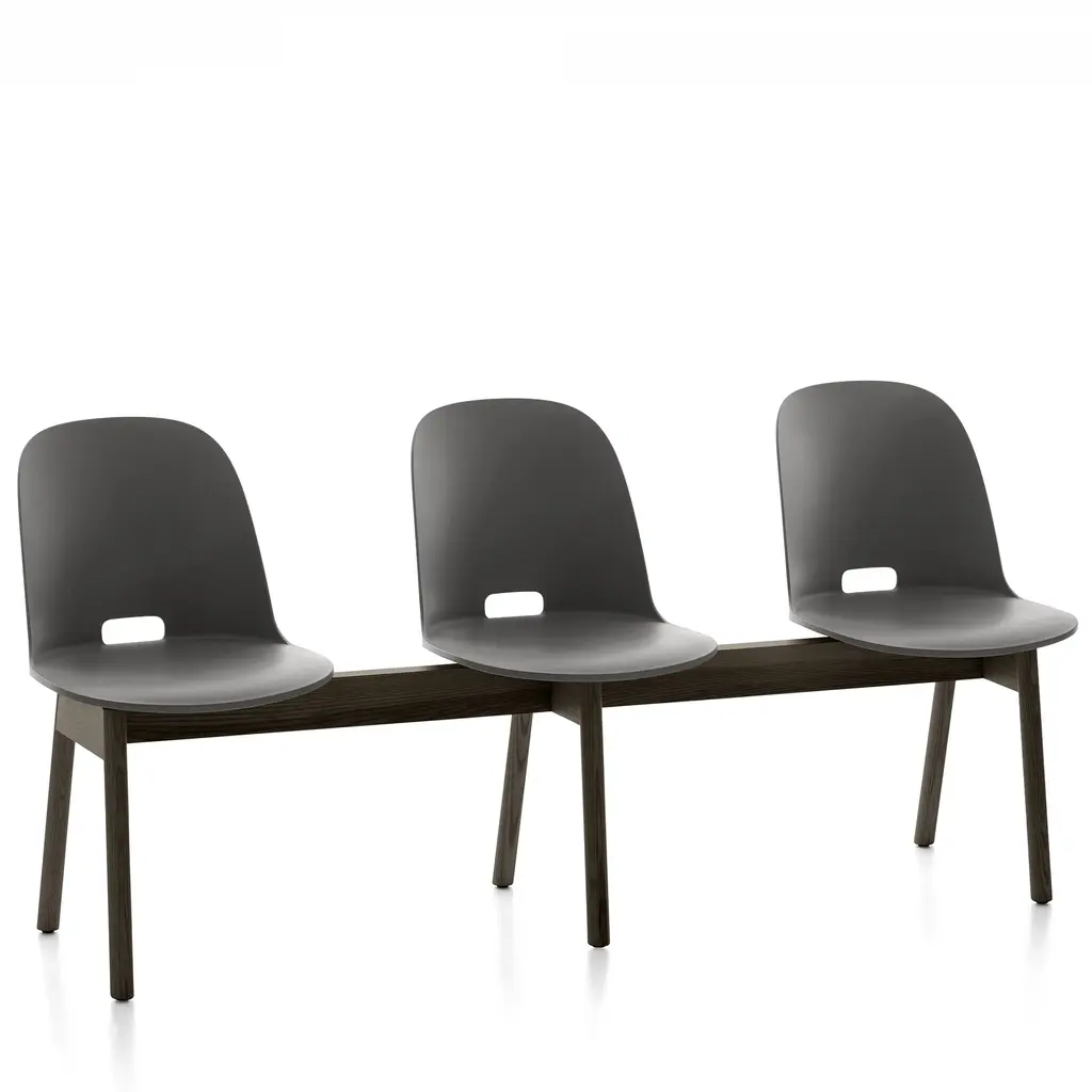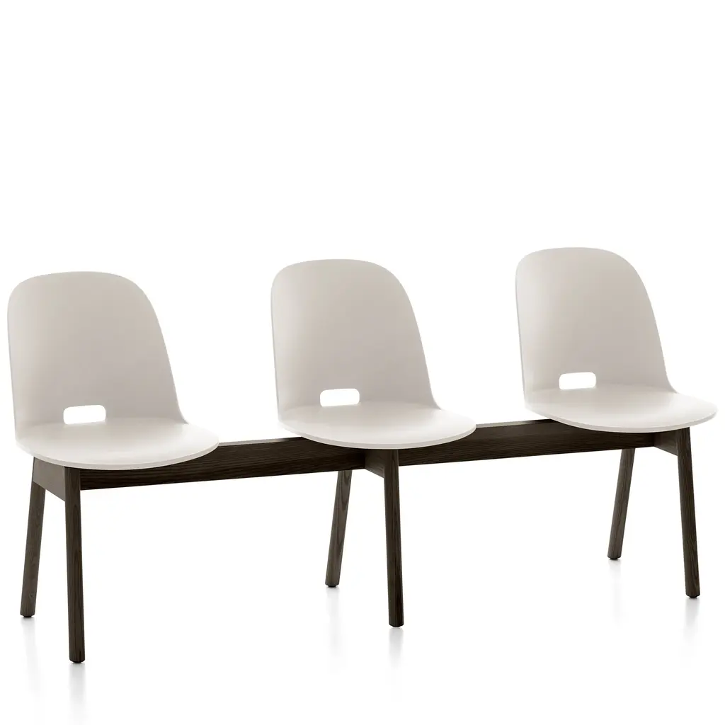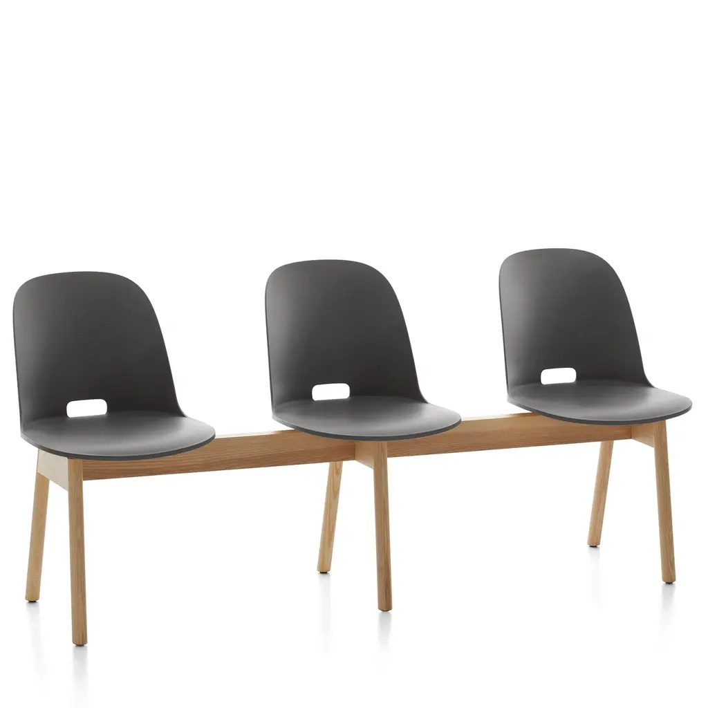 Alfi by Jasper Morrison, 2015 The Alfi bench offers three seats made from 100% recycled materials, combined with a base in sustainably sourced solid ash. The seats are made of recycled polypropylene mixed with wood fiber. The wood particles create a speckled texture that gives the surface a warmer, more natural touch. Available with high or low seat back. Engineered for comfort and strength. Made in the USA.