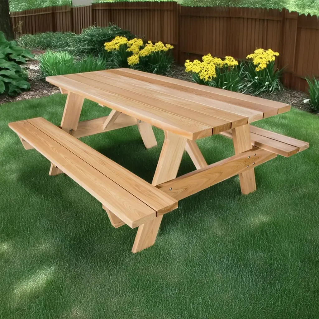 Crafted from the finest Western Red Cedar, the All Things Cedar Picnic Table is a stunning addition to your outdoor living space. Exuding rustic elegance and exceptional durability, this handcrafted masterpiece is designed to transform your backyard, patio, or campsite into a cozy, inviting retreat. Meticulously engineered for enduring strength and timeless appeal, this picnic table features a spacious 6-foot tabletop and attached benches that comfortably accommodate family and friends. The snug-fitting parts and sanded finish ensure a smooth, comfortable surface, while the sturdy cedar construction promises years of reliable use. Embrace the natural beauty of the outdoors with this eco-friendly picnic table. Harvested from sustainable forests in Western Canada and the Northwestern United States, the Western Red Cedar used in this design is not only visually stunning but also highly resistant to the elements. Unlike wood that can fade, crack, or peel, this table will maintain its rich, rustic charm season after season, requiring minimal maintenance. Whether you're hosting a backyard barbecue, a family gathering, or a cozy campfire, this patio essential is the perfect canvas for creating unforgettable memories. Its generous dimensions provide ample seating and table space for up to 8 people, making it the ideal choice for outdoor dining, entertaining, and more. Elevate your outdoor living experience with the timeless beauty and unparalleled craftsmanship of the All Things Cedar Picnic Table. Crafted by experts in the field of outdoor furniture, this picnic table is a testament to quality, durability, and style. Bring the natural charm of the great outdoors into your own backyard and enjoy the simple pleasures of al fresco dining, relaxation, and quality time with loved ones.