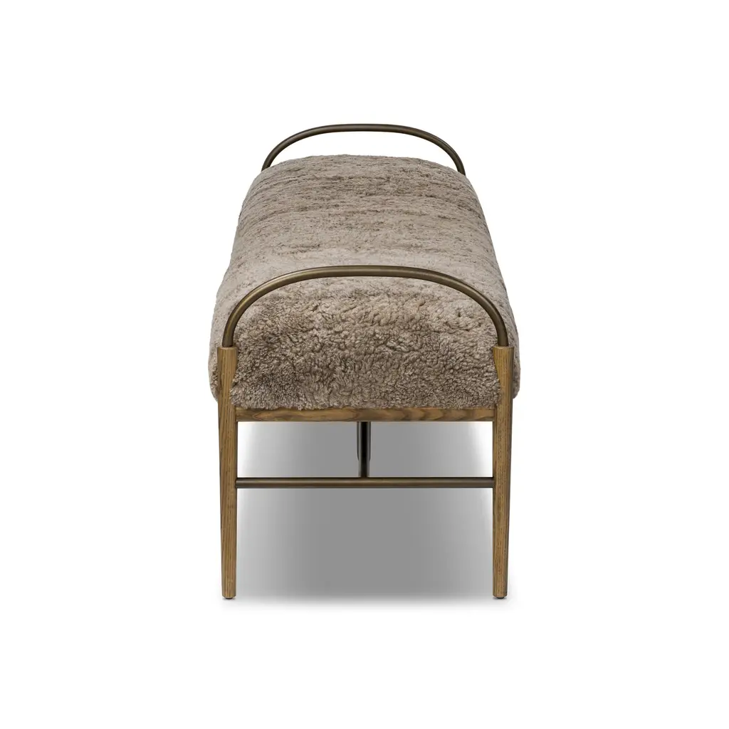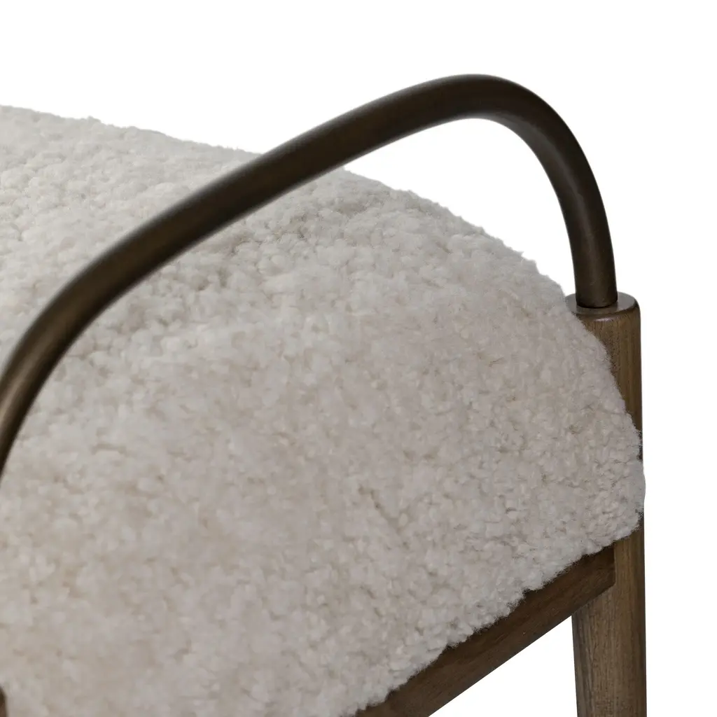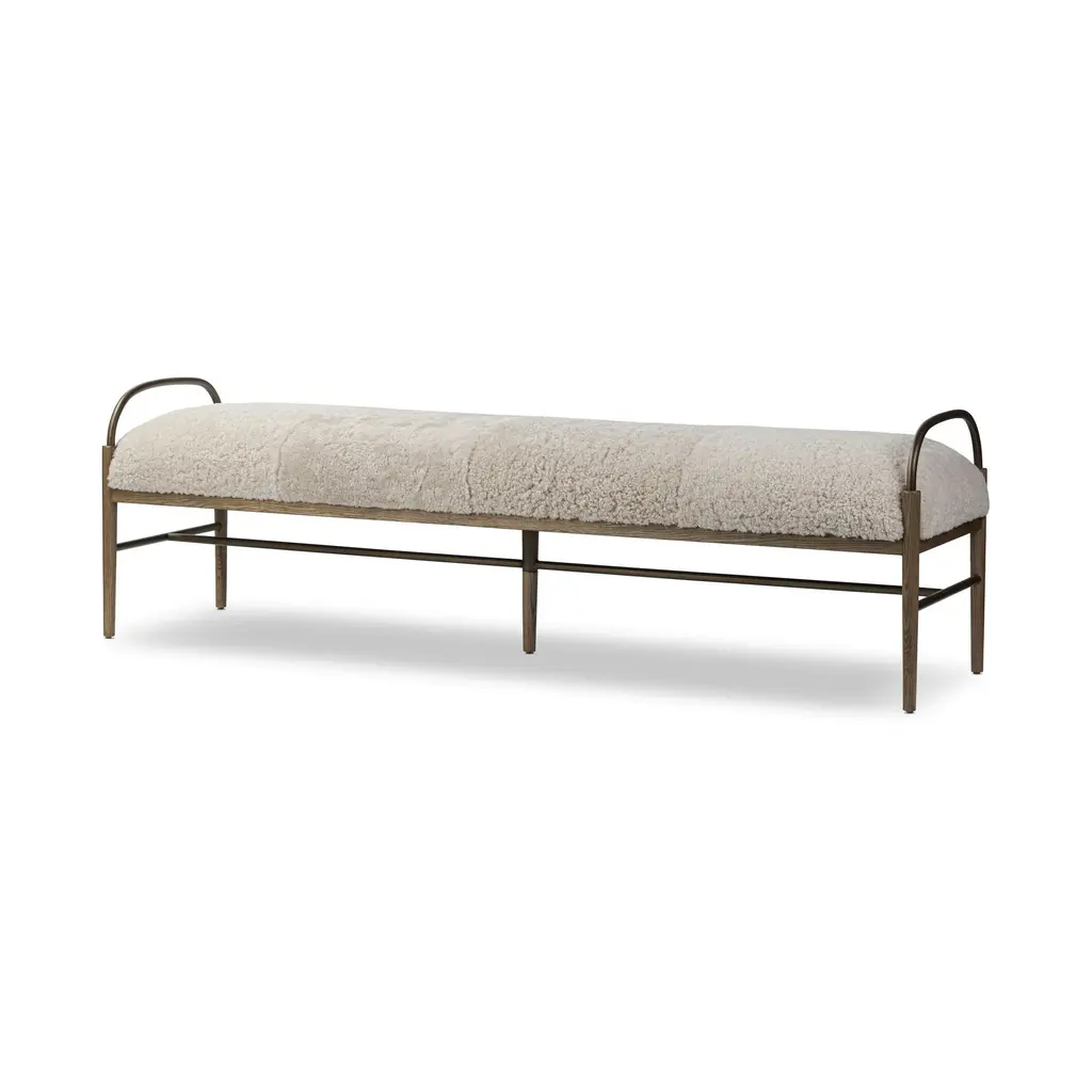 Elevate your space with the Amber Lewis x Four Hands Demi Accent Bench. This one-of-a-kind piece features a unique material blend of brushed iron, amber ash legs, and soft cream shearling. The result is a sophisticated and inviting addition to any room. Designed by Amber Lewis and Four Hands. Highlights