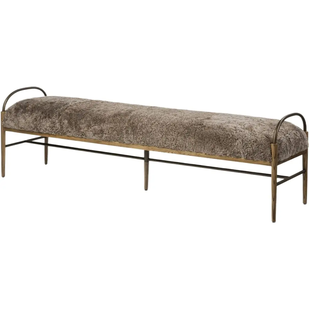 Elevate your space with the Amber Lewis x Four Hands Demi Accent Bench. This one-of-a-kind piece features a unique material blend of brushed iron, amber ash legs, and soft cream shearling. The result is a sophisticated and inviting addition to any room. Designed by Amber Lewis and Four Hands. Highlights