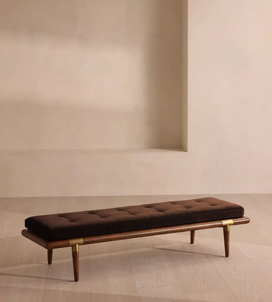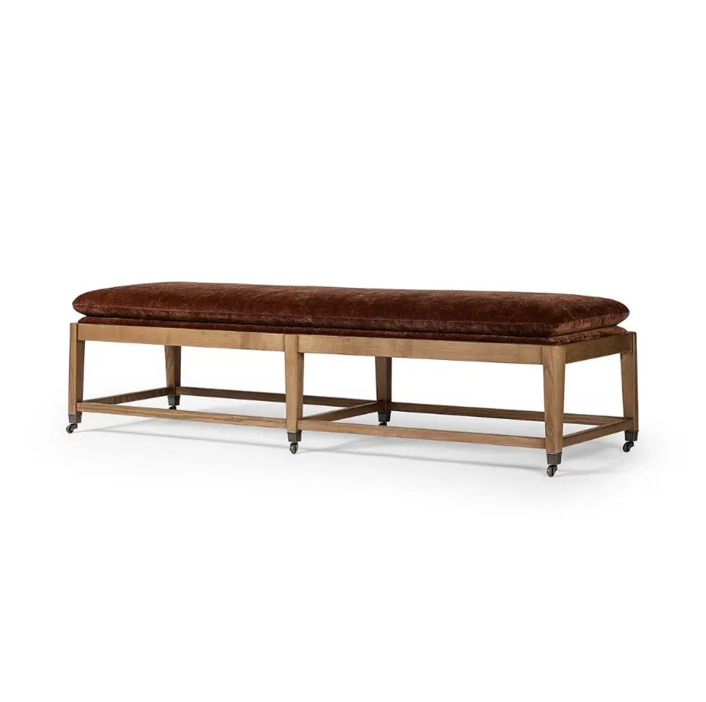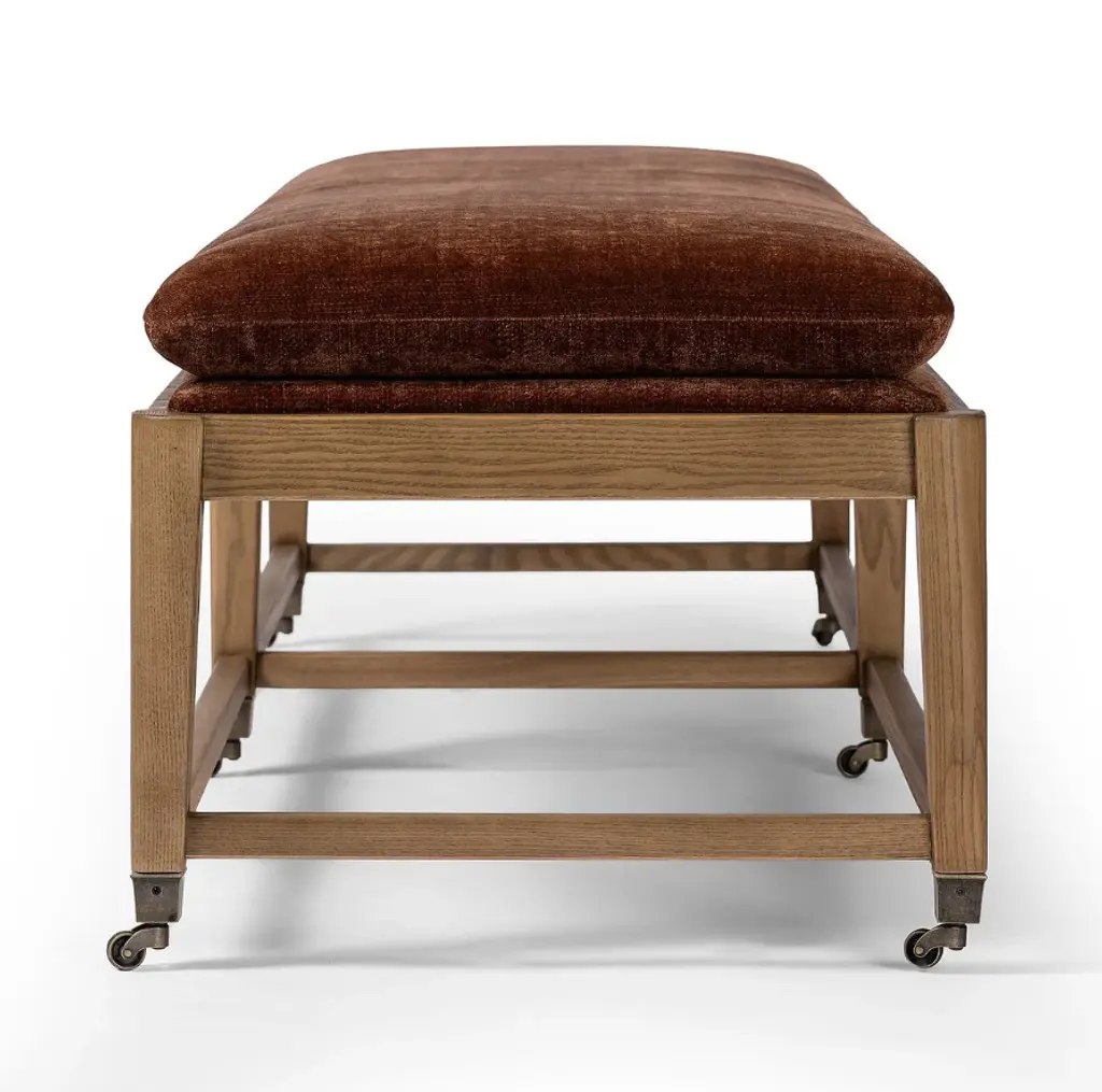 The Eleanor accent bench is designed in collaboration with Amber Lewis and Four Hands. It features a toasted ash base and legs with metal casters in an aged brass finish. Plus, chenille-like velvet upholstery with a semi-attached cushion seat. Combining style with functionality.