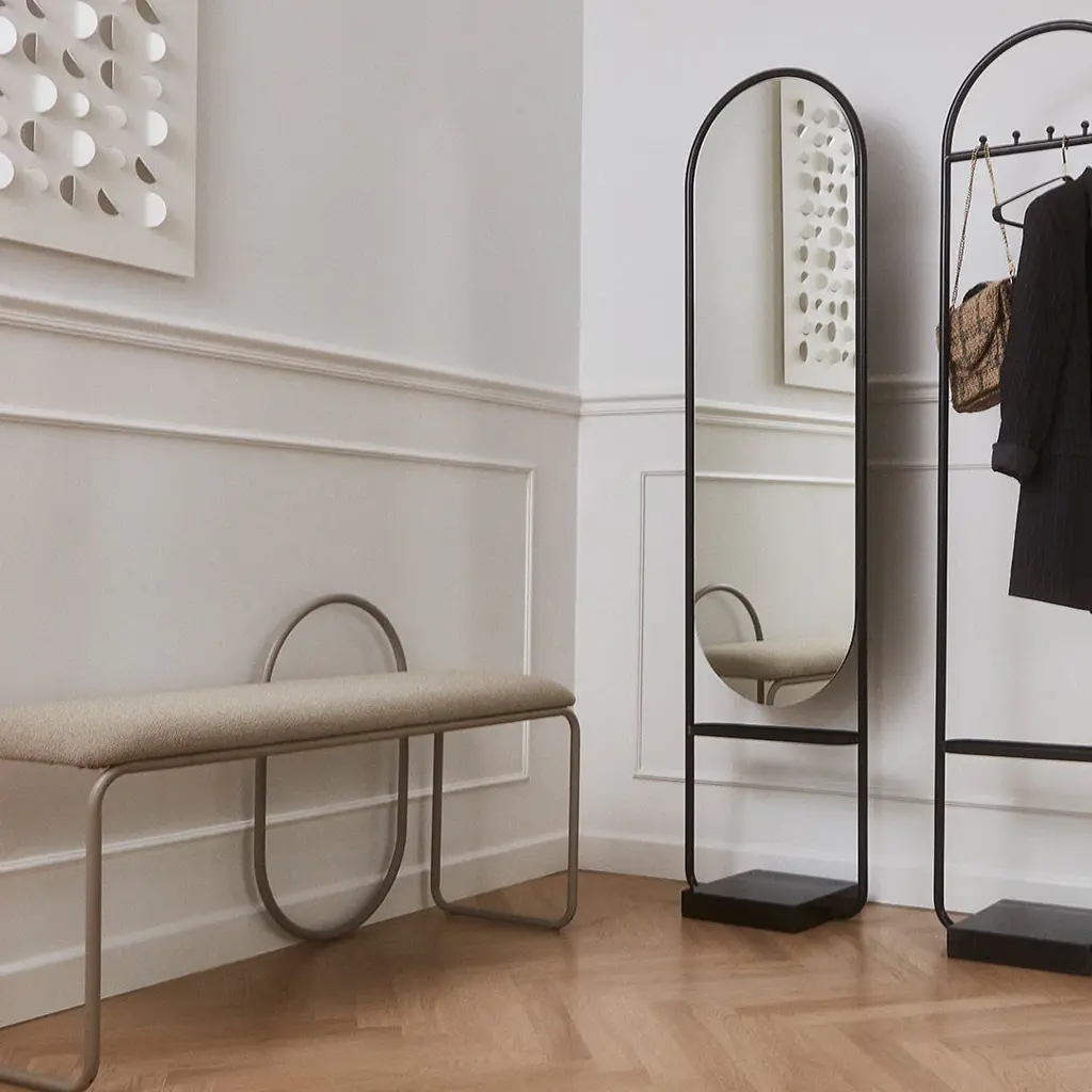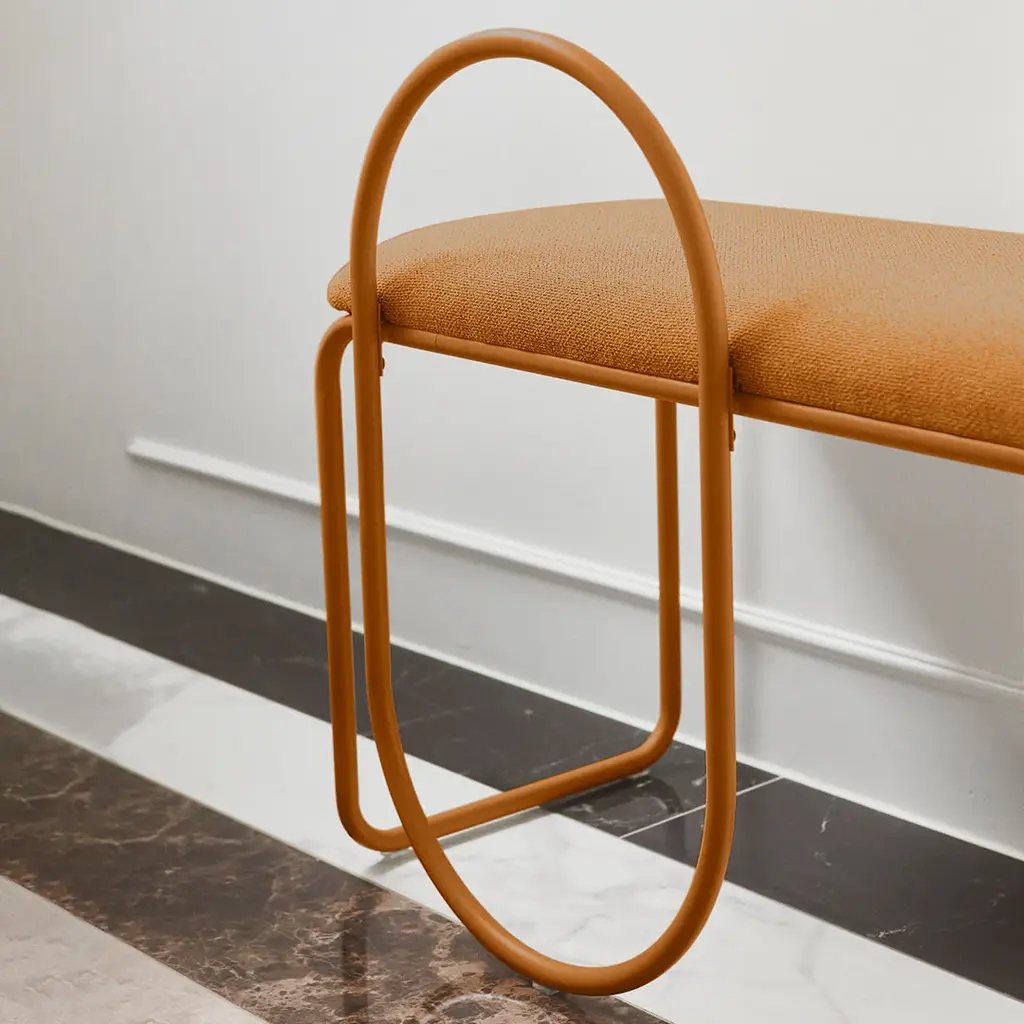 Taking a moment of relaxation, resting your legs for a little while. The Angui bench is the perfect place to do so. Use it in the hallway, in the bedroom or whereever you need a place to rest. The Angui collection is a beautiful range of different furniture. The collection includes benches, chairs, shelves and mirrors in a wide vairety of sizes. Sophisticated pieces that will enhance your personal style. The pipe styled frame and tone in tone is on trend for the season and will enhance any personal style. A wide variety of colours are also here to ensure individual style.