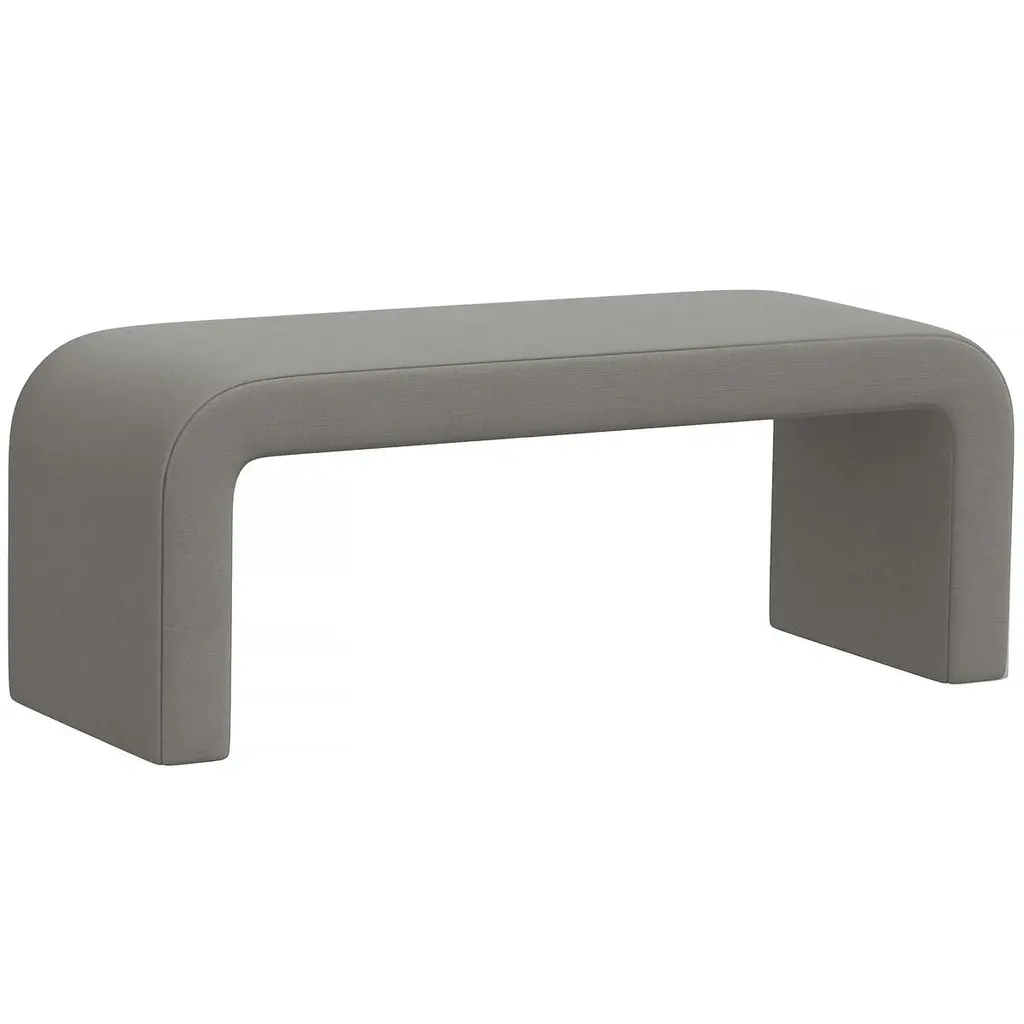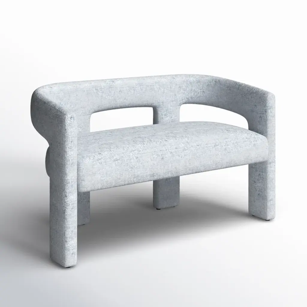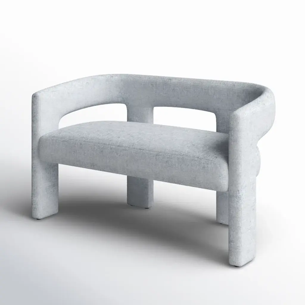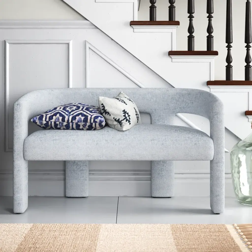 This bench fills out your entryway with convenient seating and a fun, modern look. It's crafted from wood with a contemporary, abstract silhouette. The design features a rounded, openwork back with sloping arms and generous padding for comfort and support. We love the linen-like jacquard fabric polyester upholstery and a light hue that goes with a variety of color schemes. This bench comfortably seats two and has a weight capacity of 250 lbs. The back leg width dimension is approximately 5.5".
