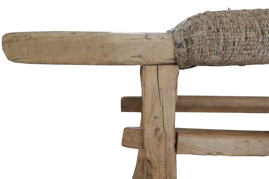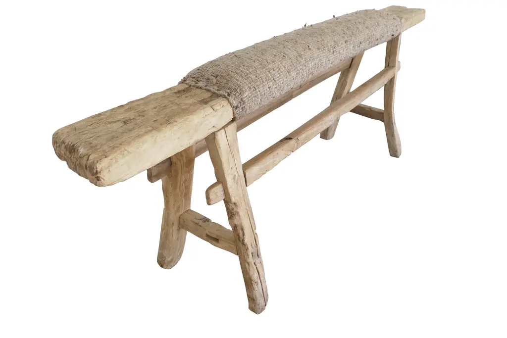 One-of-a-kind! Our authentic vintage Asian Shandong bench, primitively hand-built of solid heavy-weight raw elmwood. Constructed with early mortise & tenon joinery, showing much desirable history characteristics. Cushioned top, perfectly upholstered in ultra-luxe rolled woven heavy textural rustic silk textile in variegated natural & camel tones. Created by Fragments Identity in sunny California!